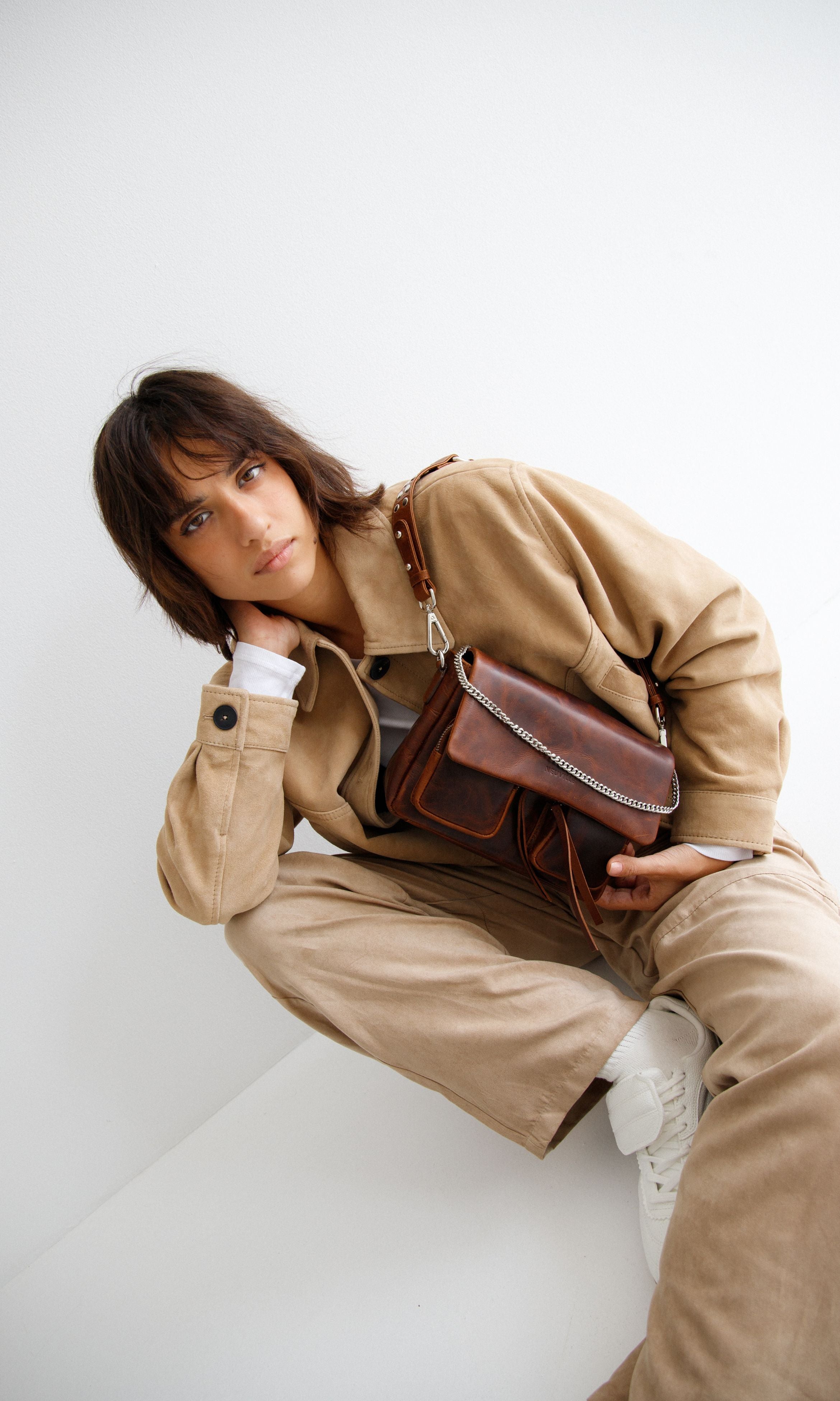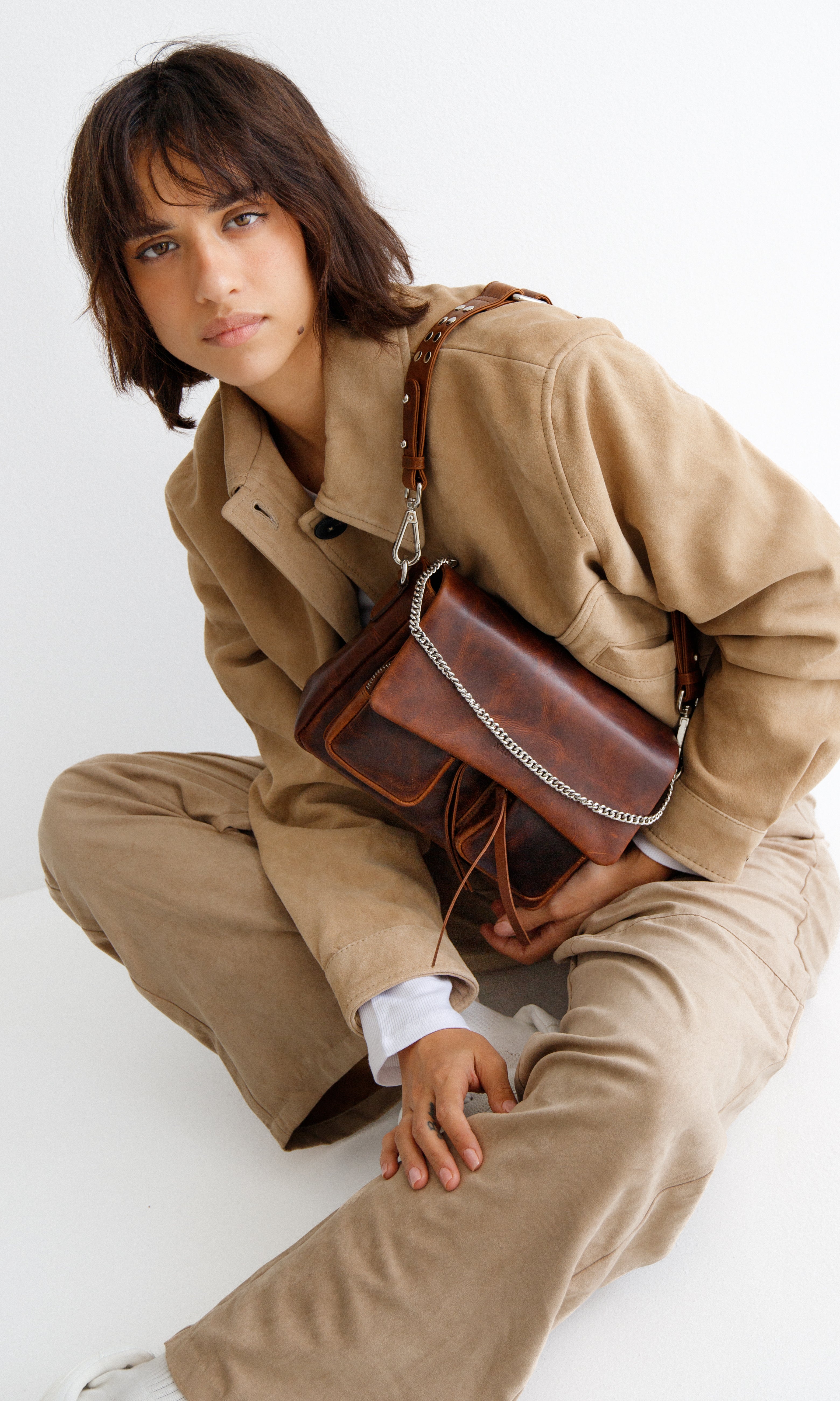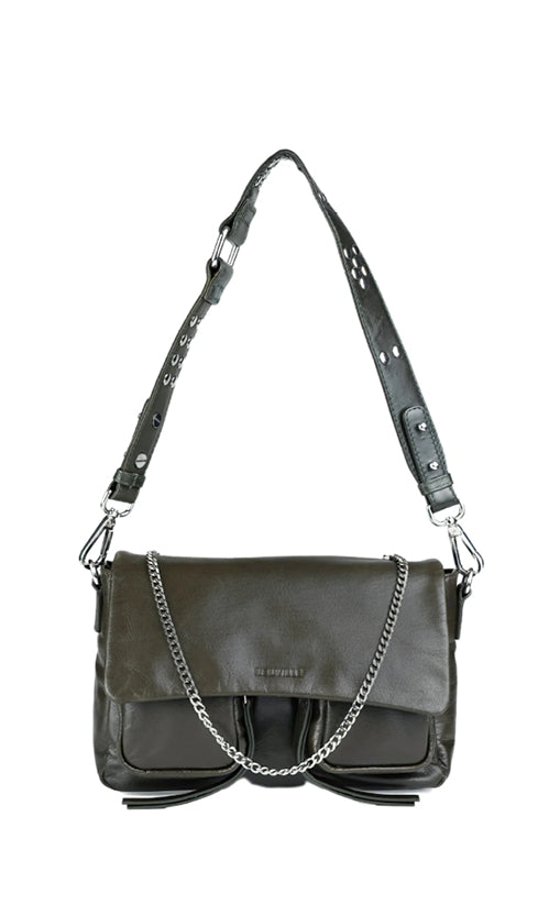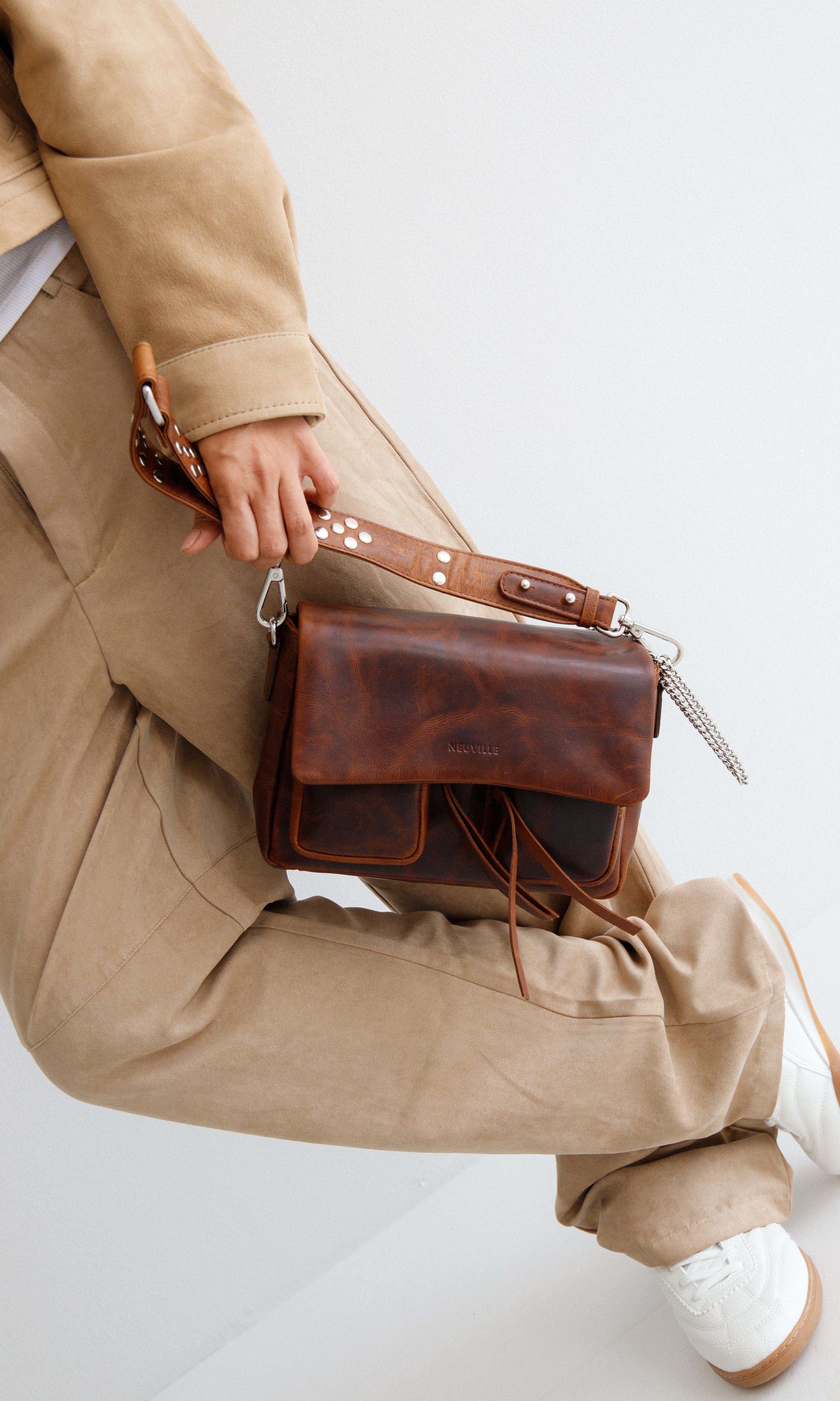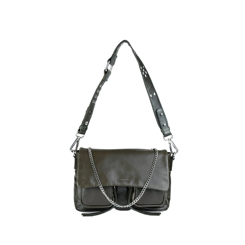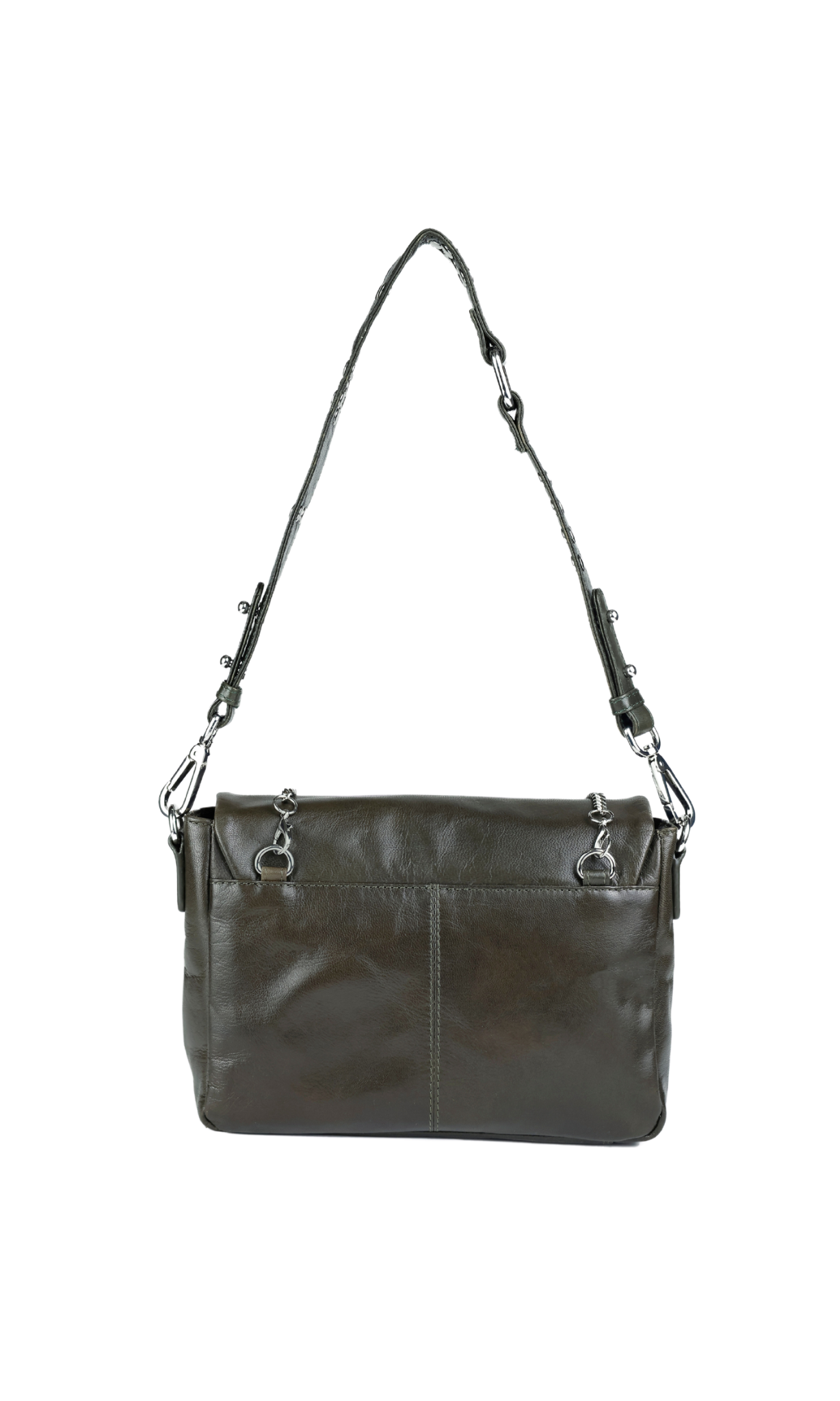 - Three interchangeable straps for easy transitions : a leather shoulder strap with metal studs, and adjustable leather crossbody strap and a decorative metal chain
