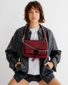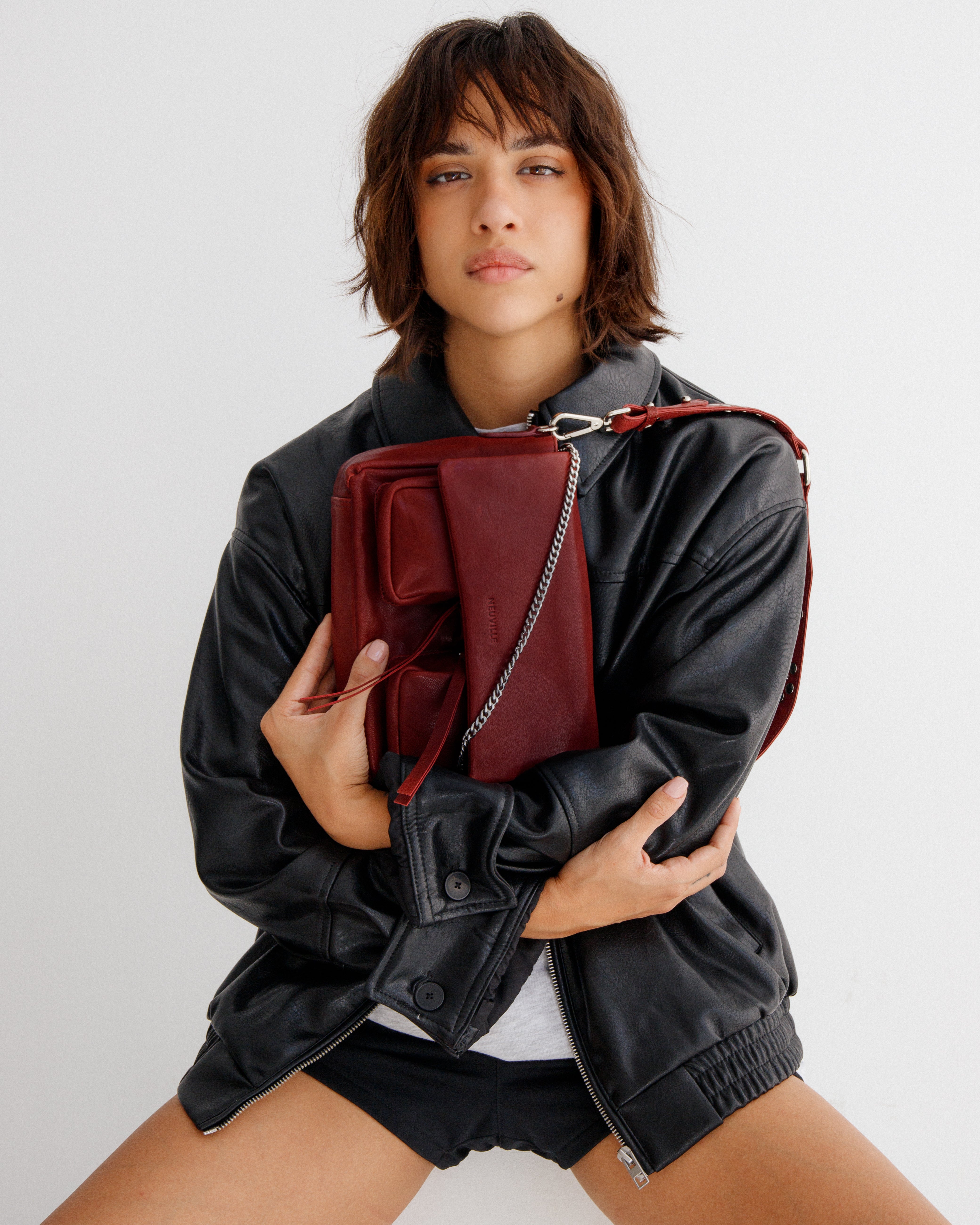 - Three interchangeable straps for easy transitions : a leather shoulder strap with metal studs, and adjustable leather crossbody strap and a decorative metal chain