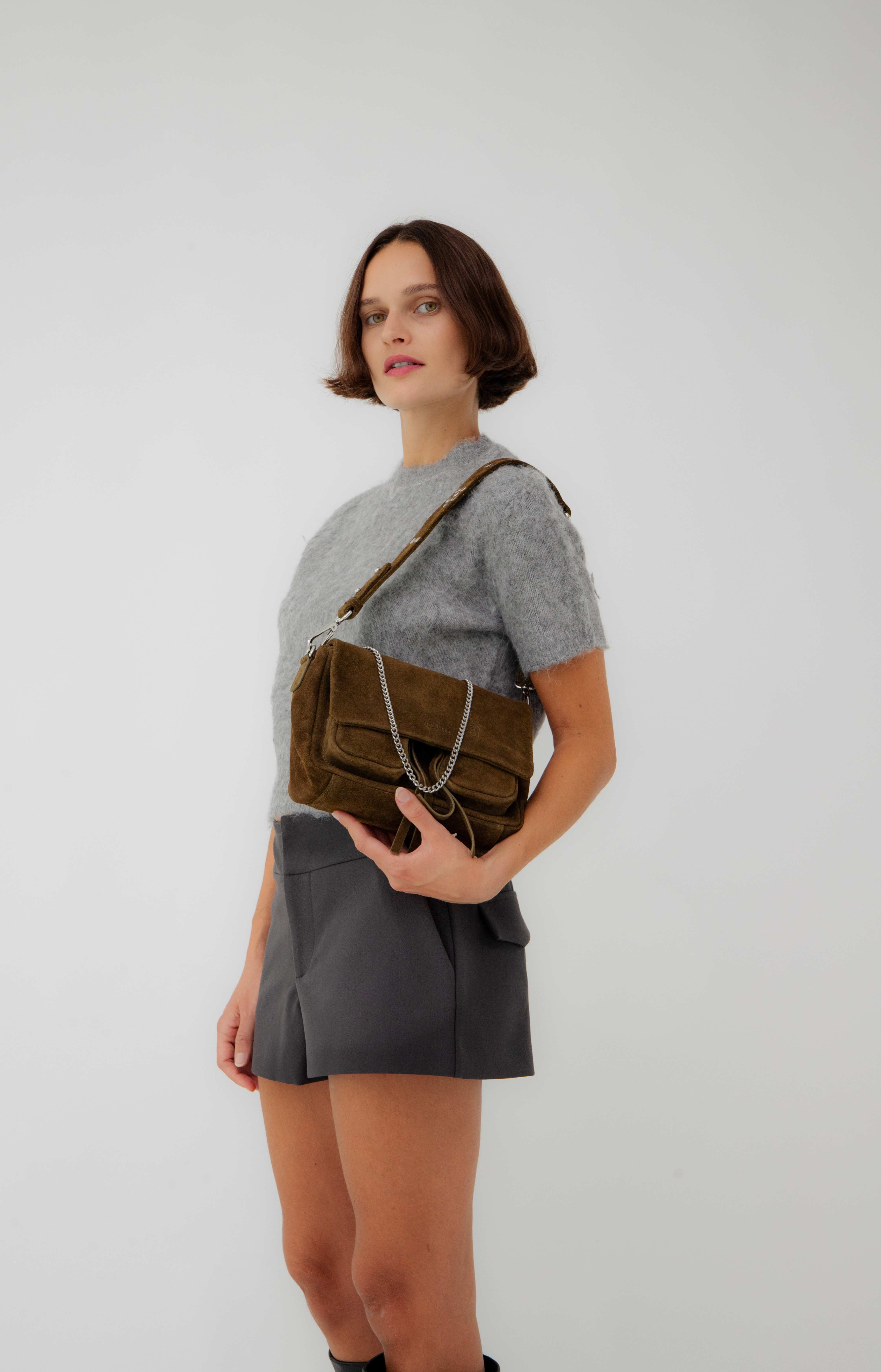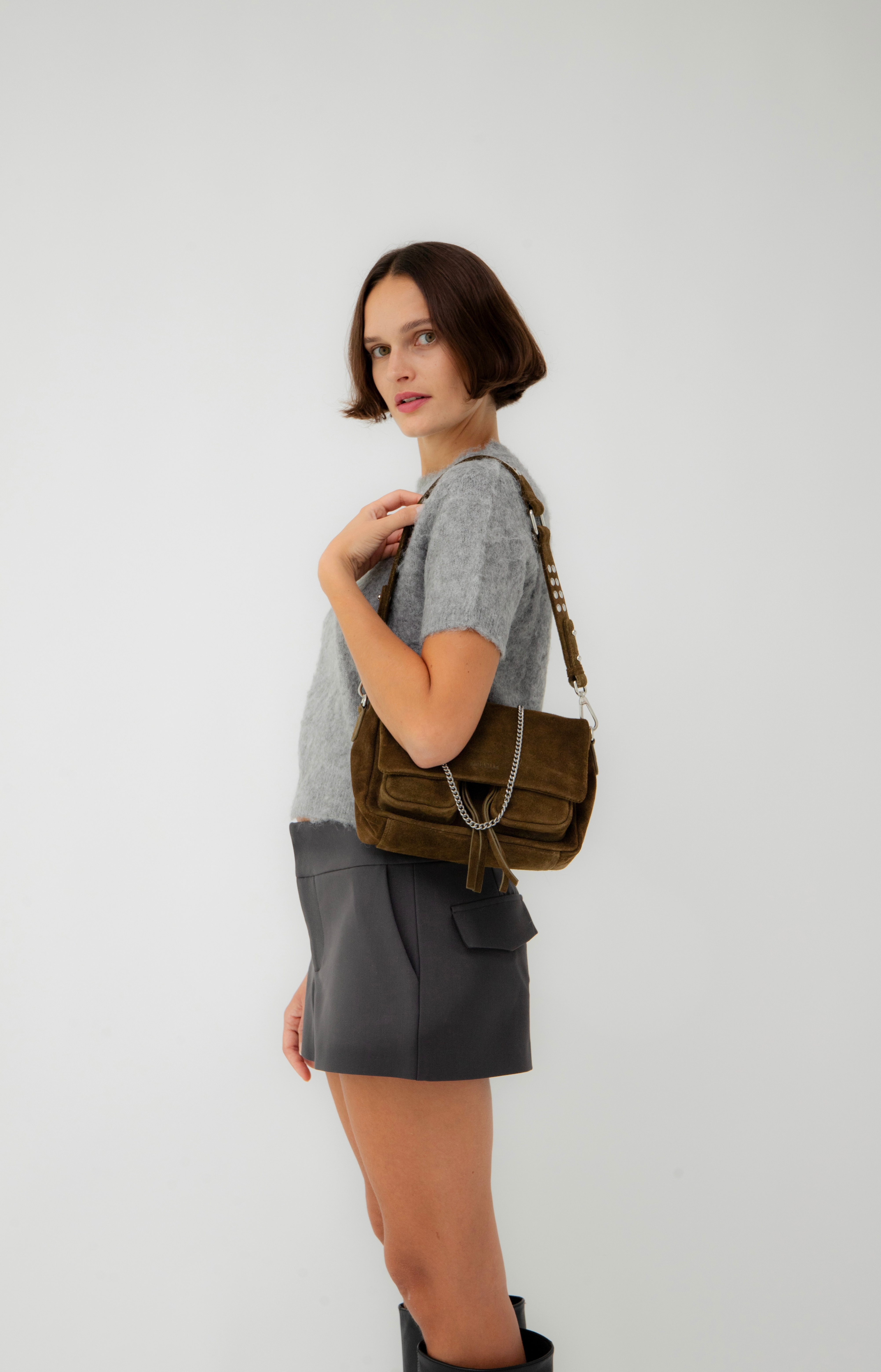 - Three interchangeable straps for easy transitions : a leather shoulder strap with metal studs, and adjustable leather crossbody strap and a decorative metal chain