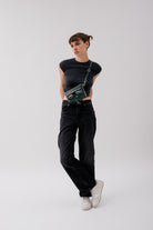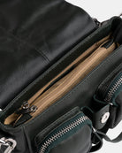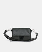 - Drei austauschbare Riemen für einfache Übergänge: ein Lederschulterriemen mit Metallnieten, ein verstellbarer Leder-Kreuzriemen und eine dekorative Metallkette