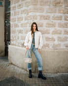 • Drei austauschbare Riemen für einfache Übergänge: ein Schulterriemen aus Leder mit Metallnieten, ein verstellbarer Crossbody-Riemen aus Leder und ein dekorativer kleiner Riemen mit Nieten, um die Tasche in der Hand zu tragen.