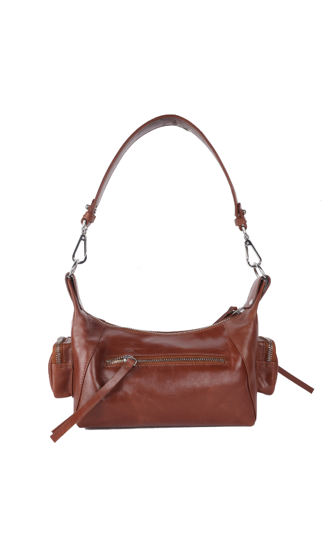 - Sie hat zwei quadratische Außentaschen mit Reißverschlüssen an der Seite.