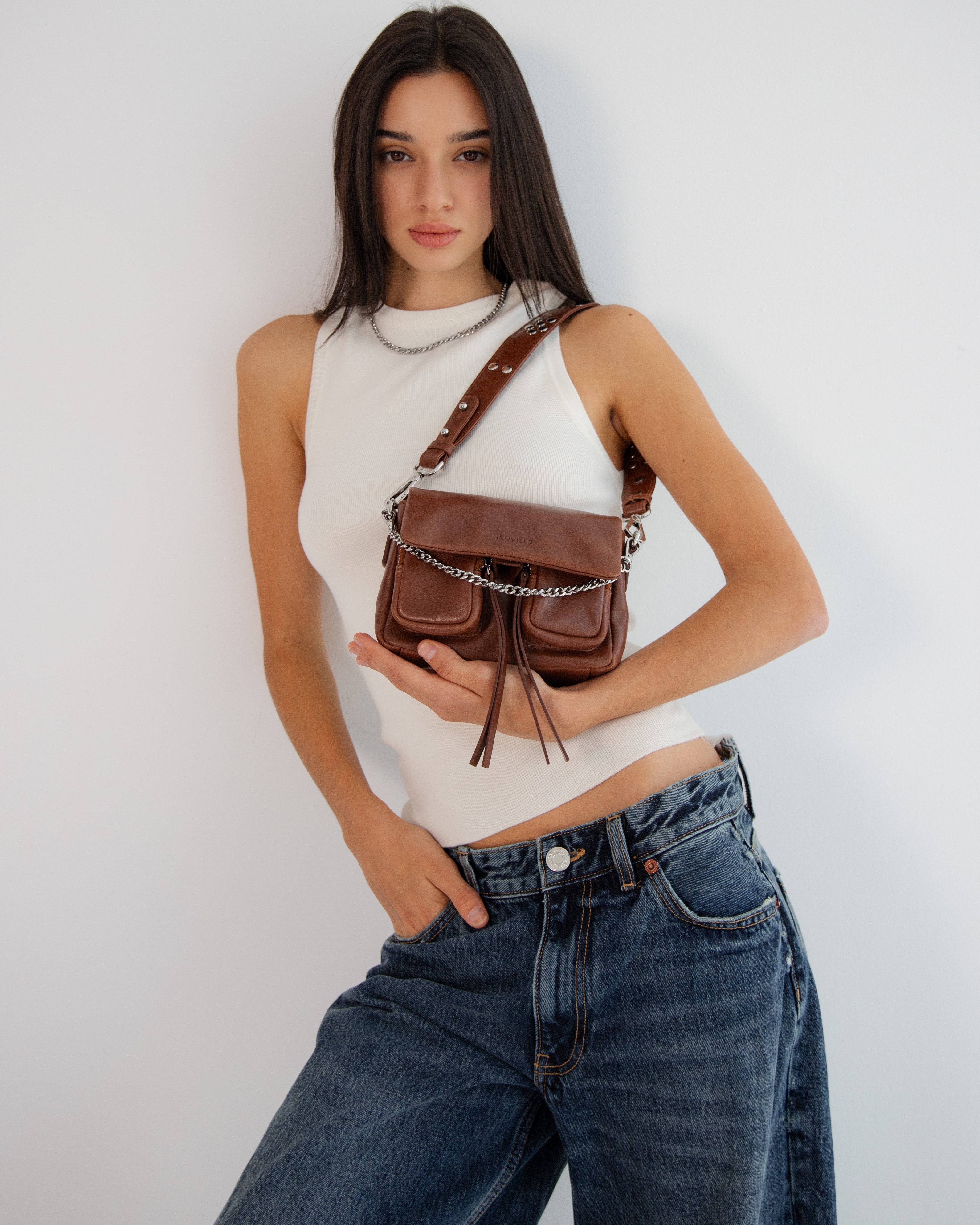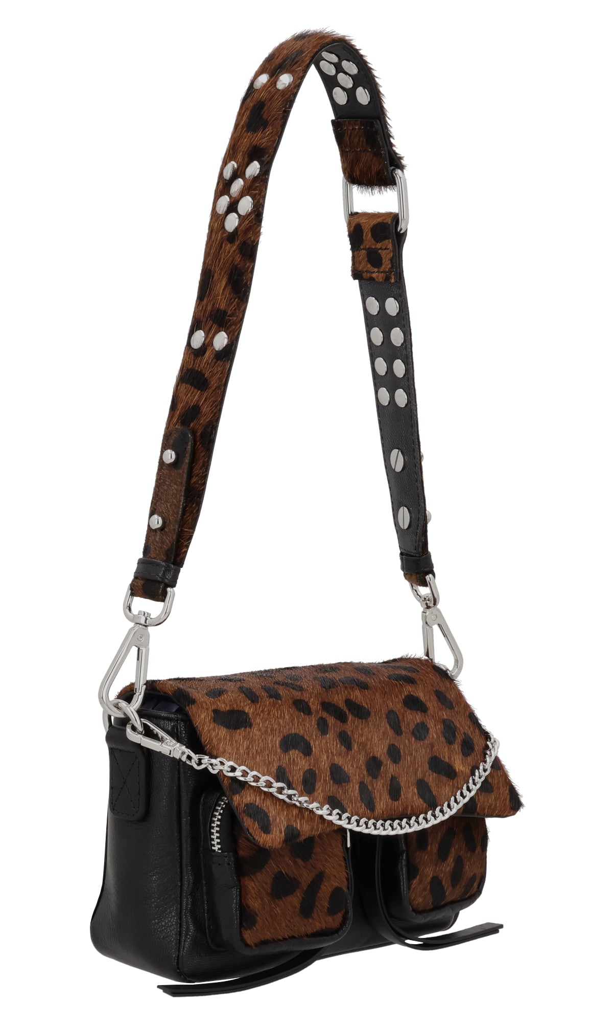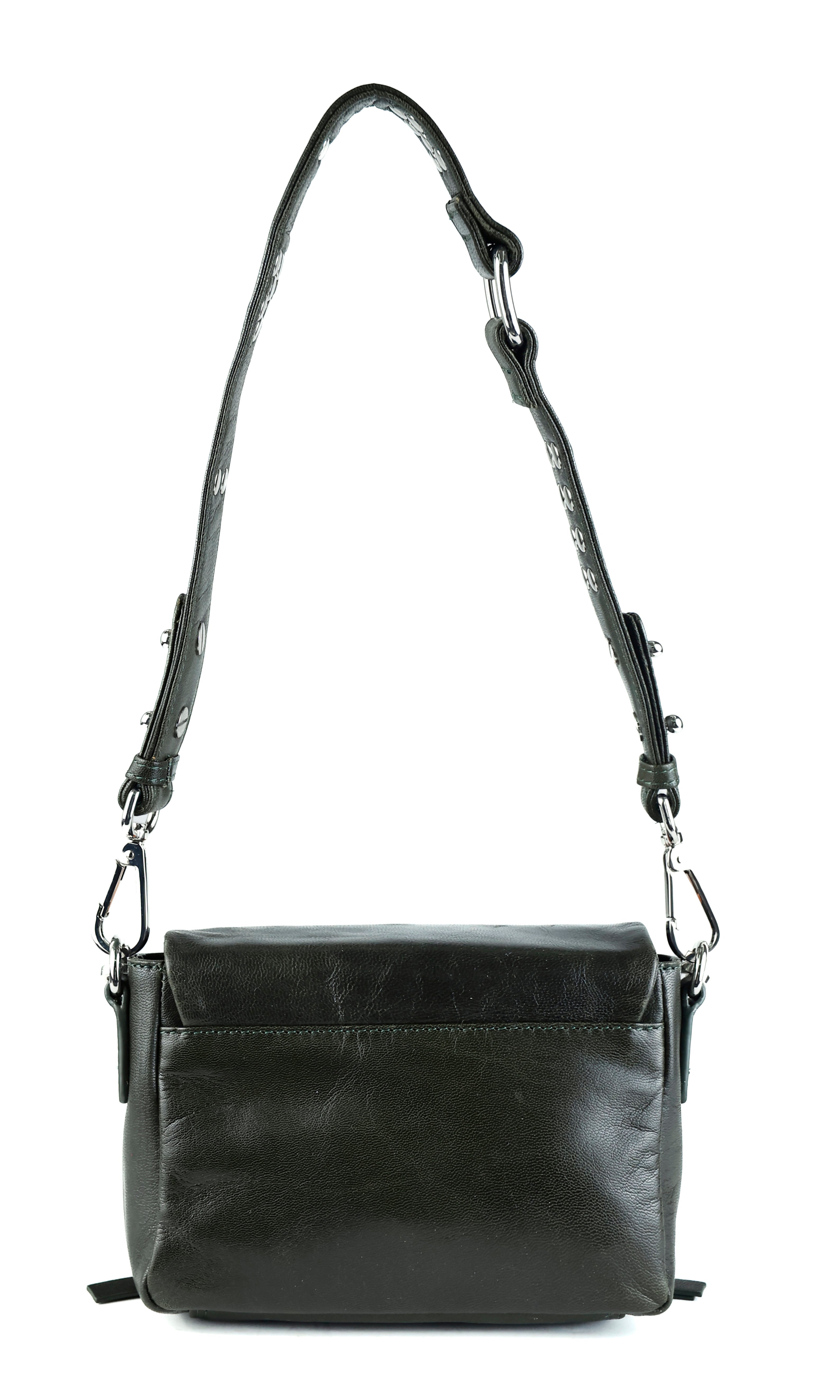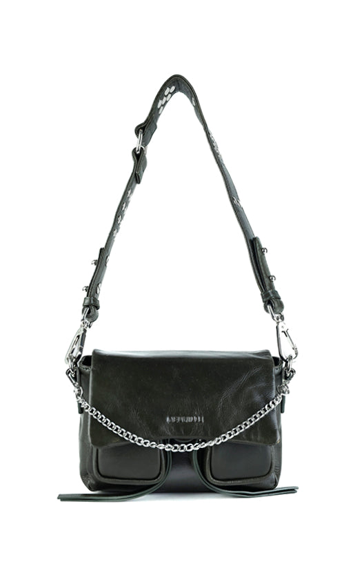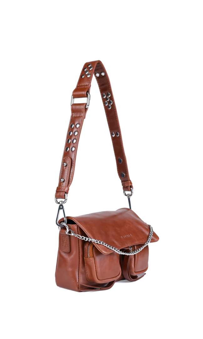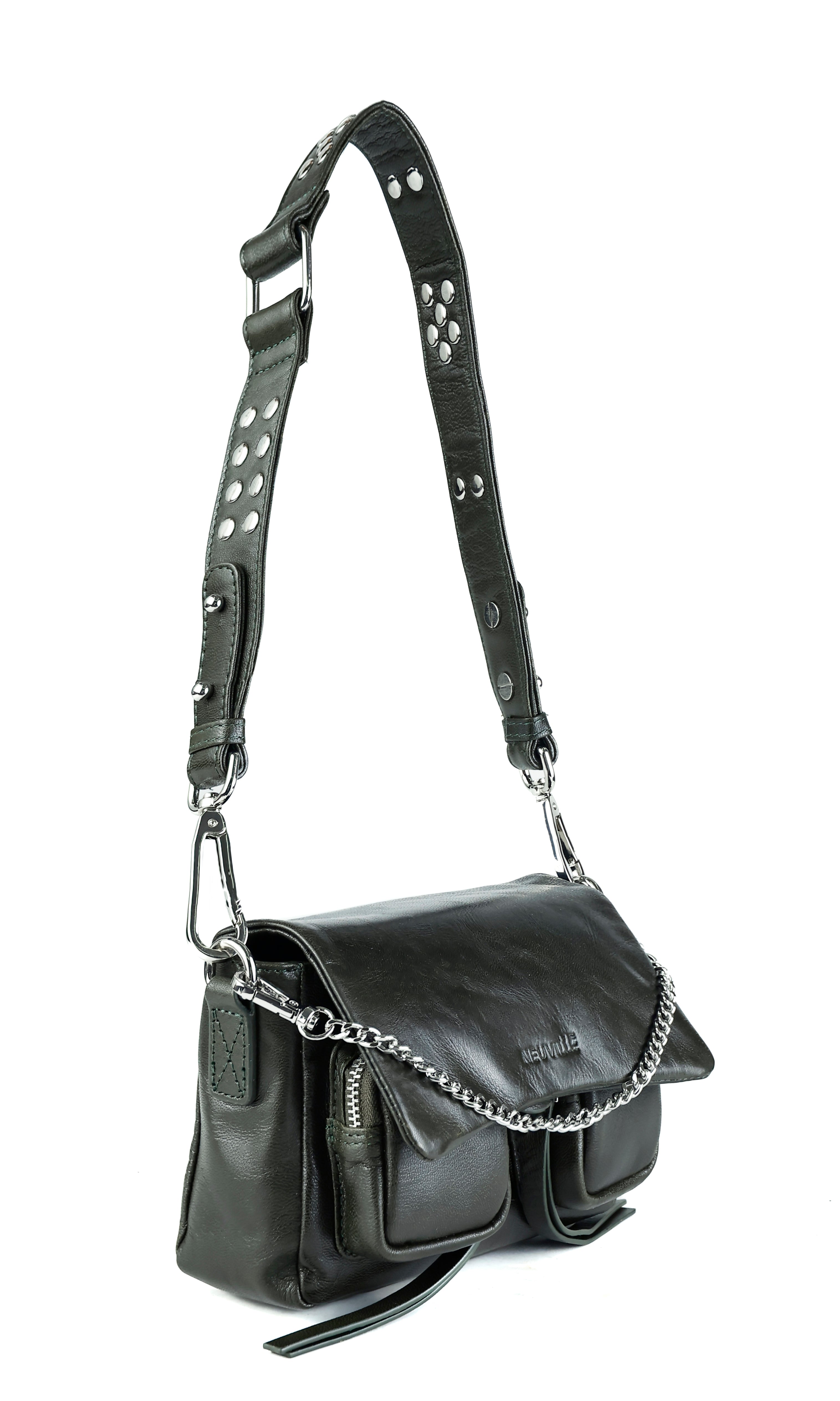 • Drei austauschbare Riemen für einfache Übergänge: ein Lederschulterriemen mit Metallnieten, ein verstellbarer Leder-Kreuzriemen und eine dekorative Metallkette