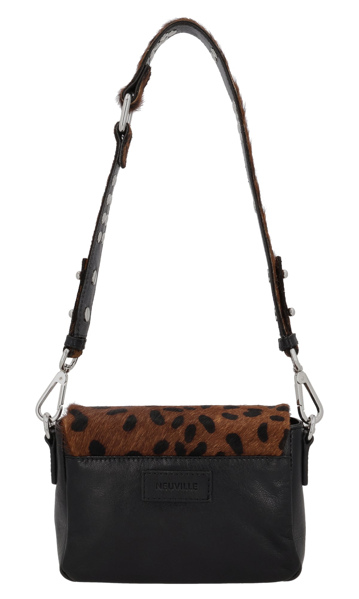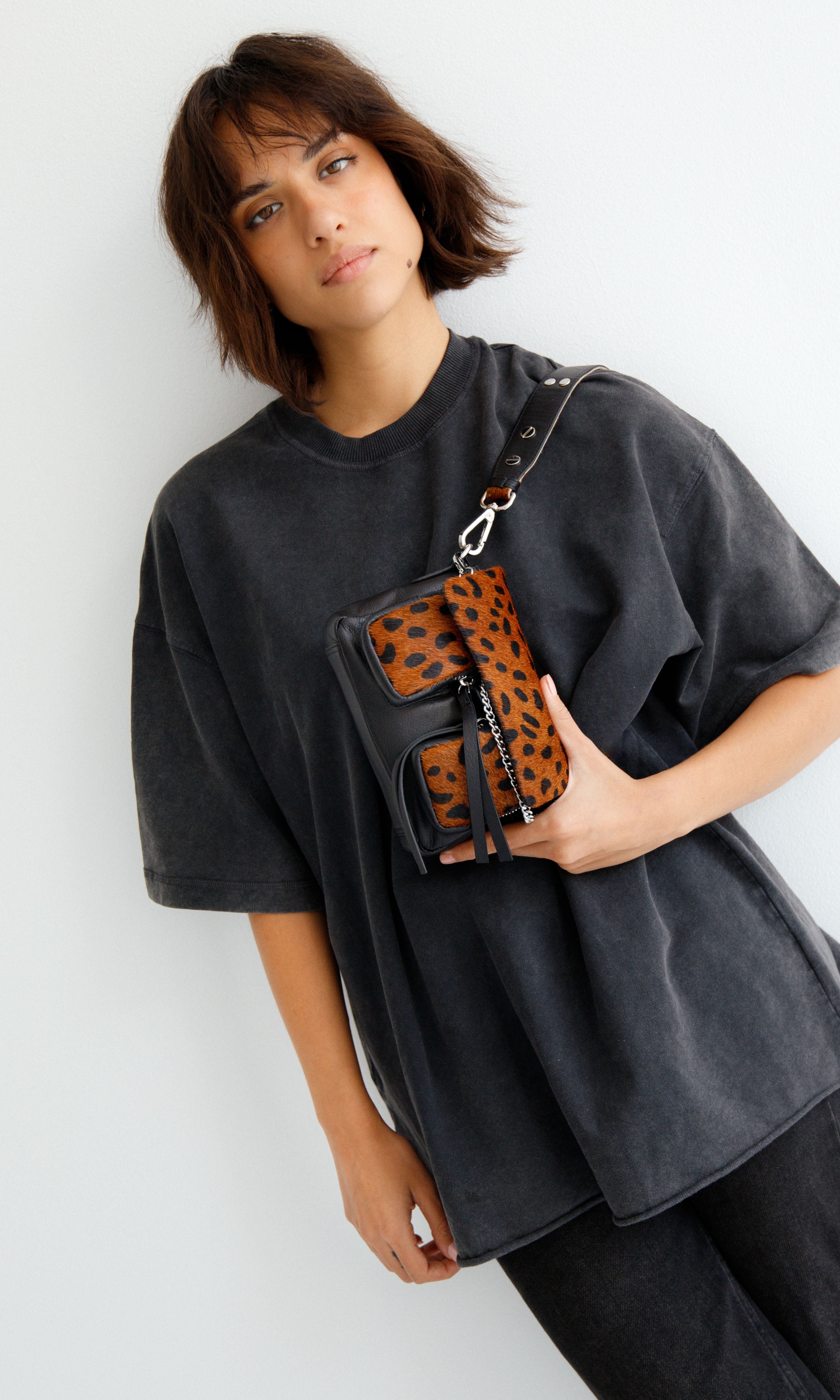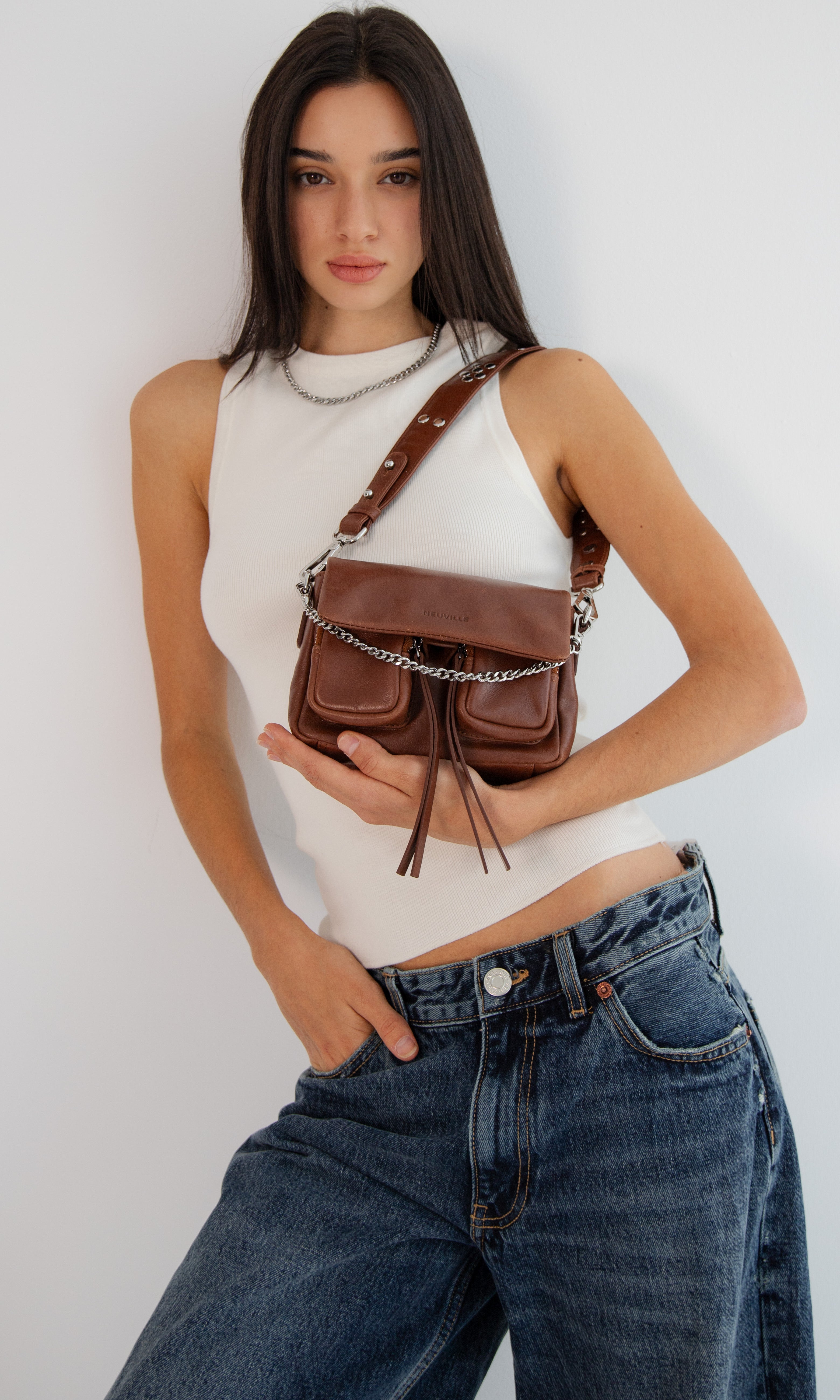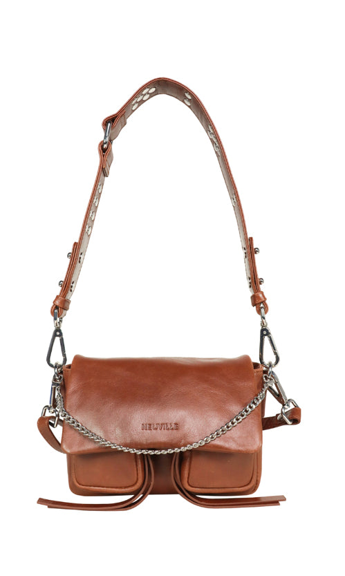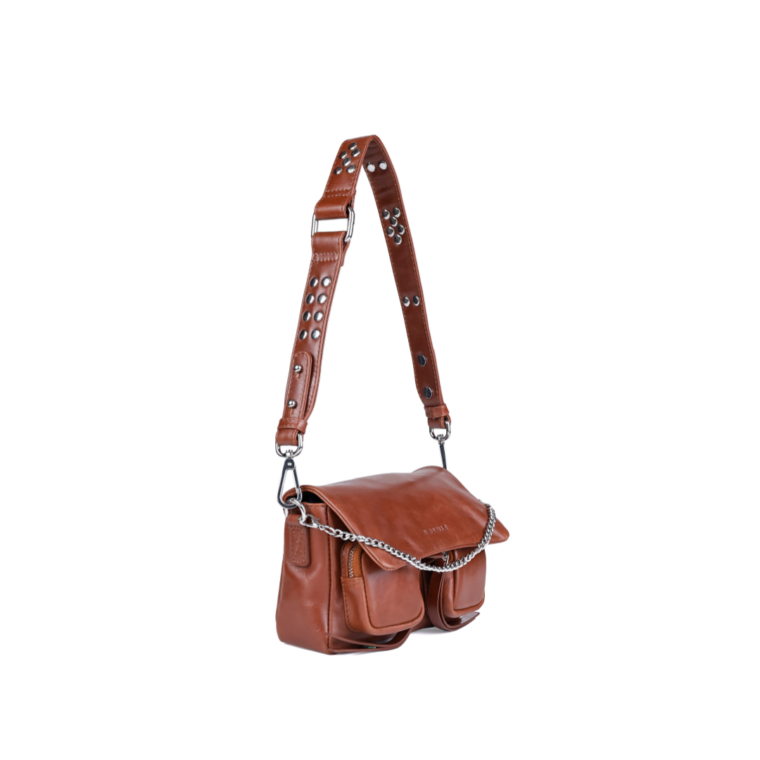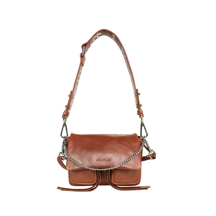 • Drei austauschbare Riemen für einfache Übergänge: ein Lederschulterriemen mit Metallnieten, ein verstellbarer Leder-Kreuzriemen und eine dekorative Metallkette