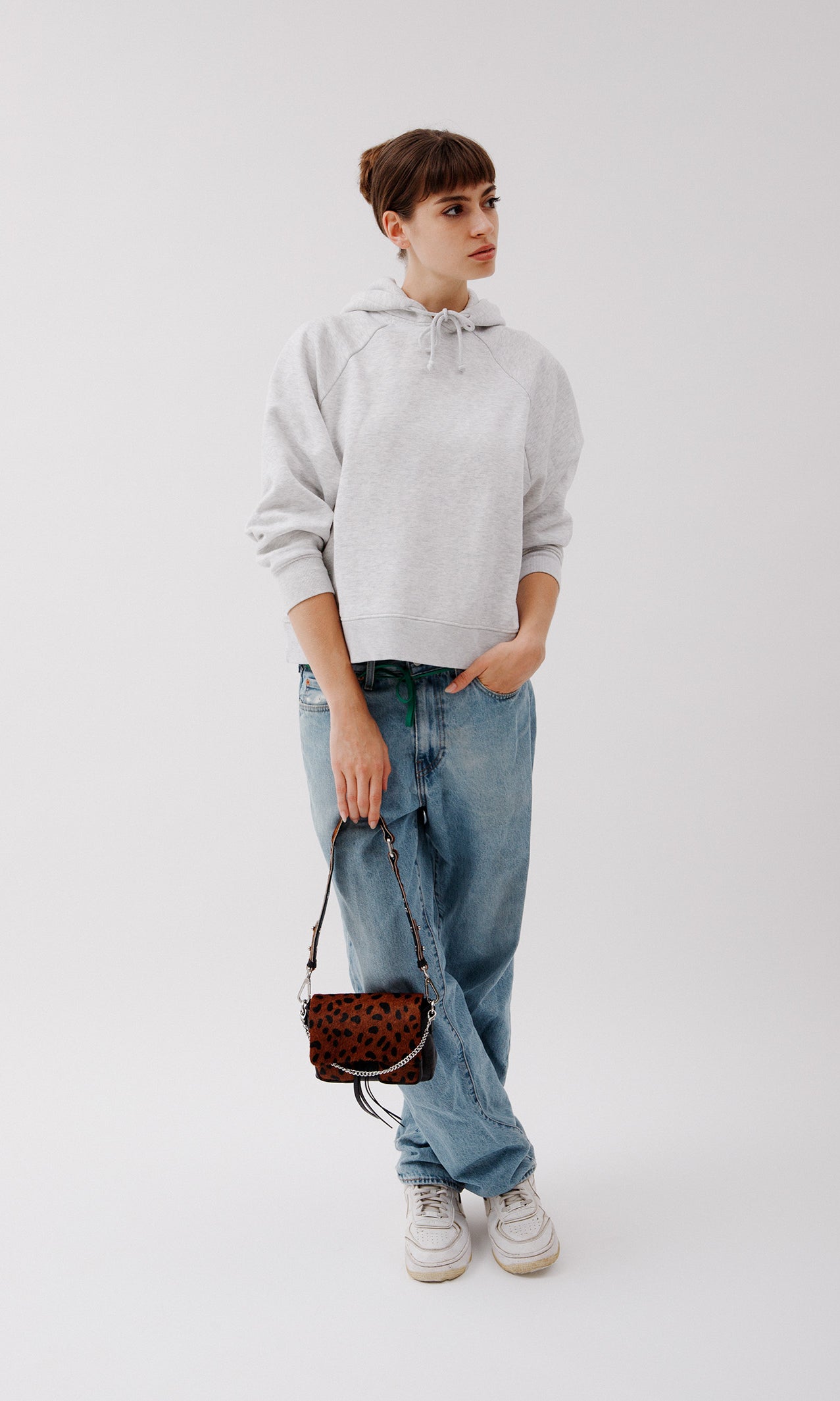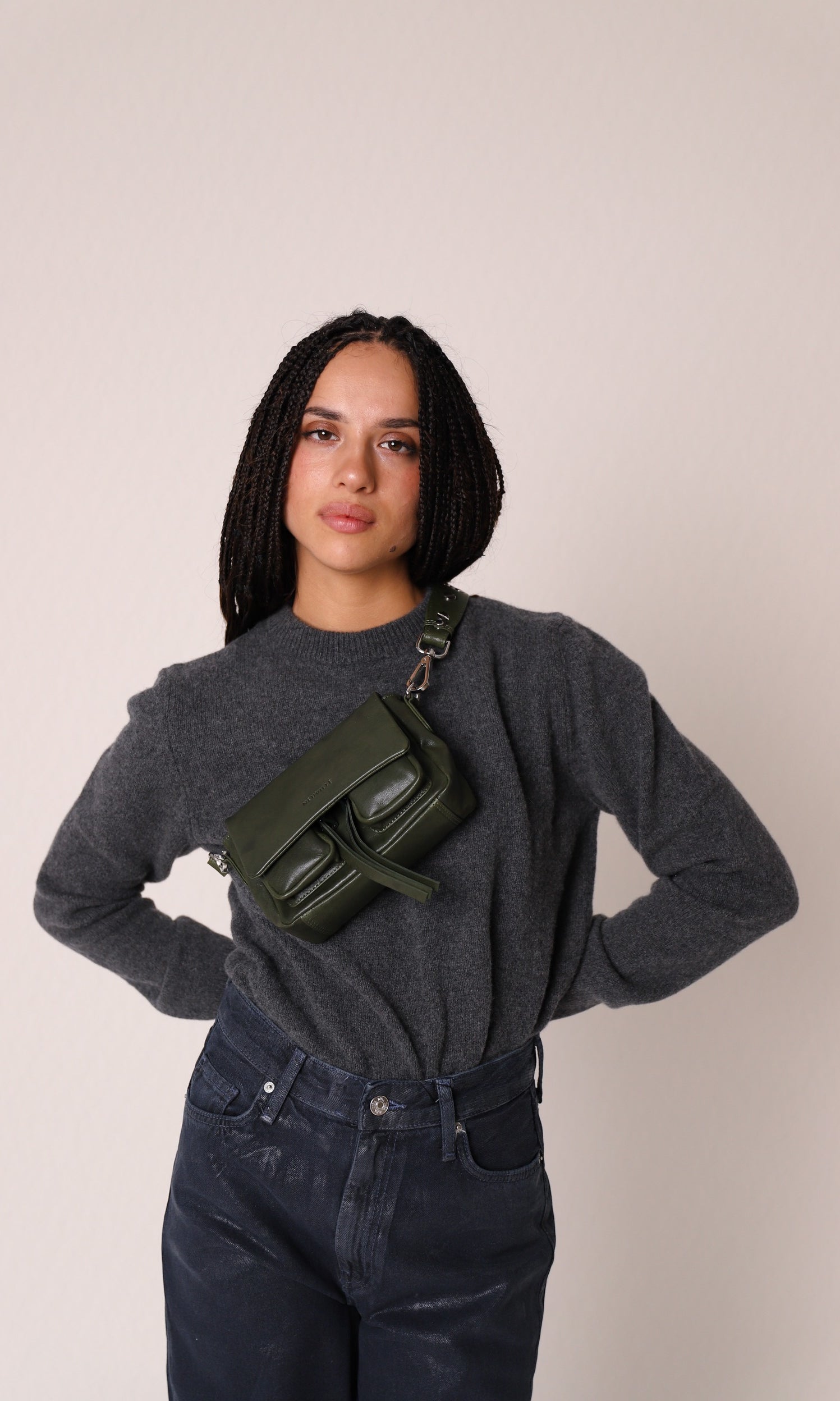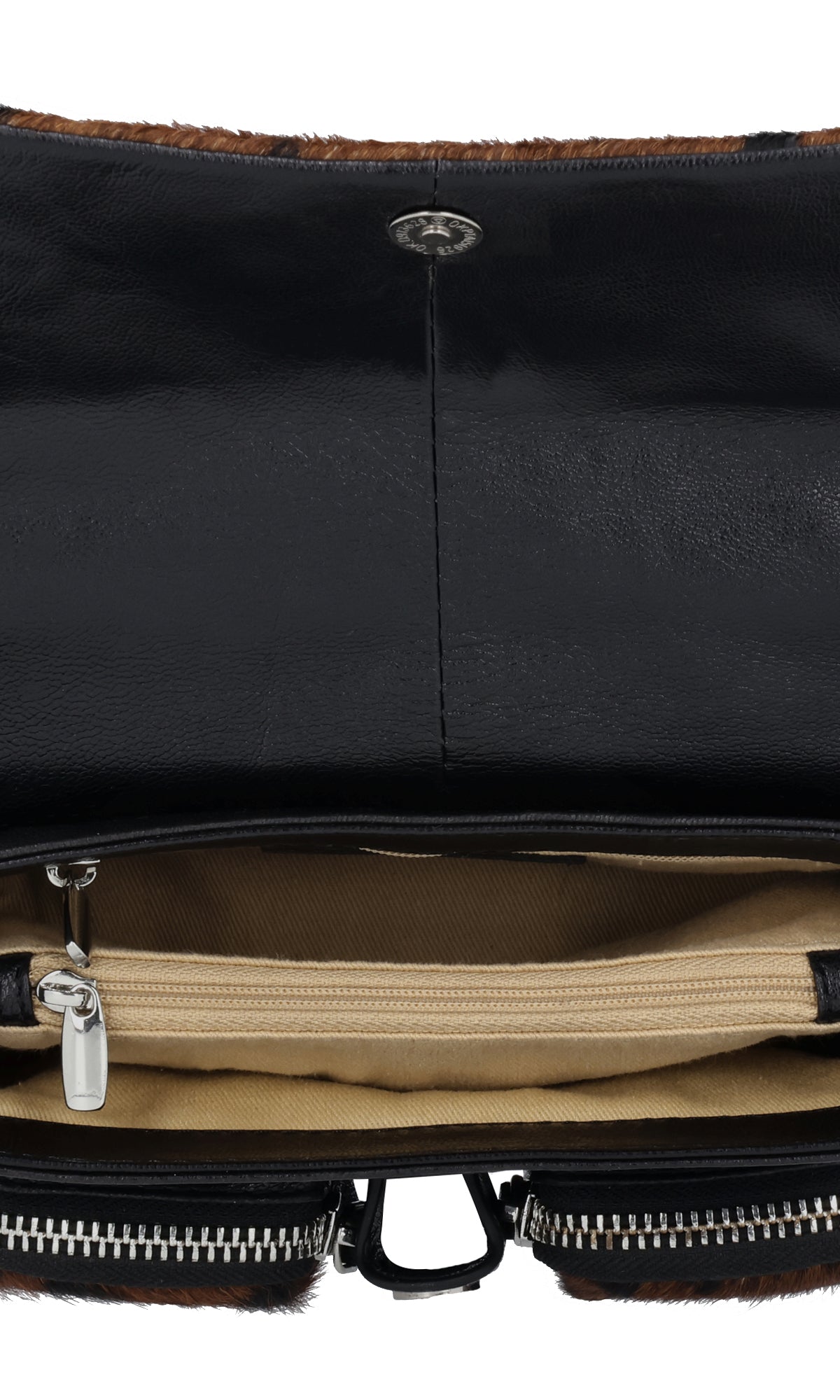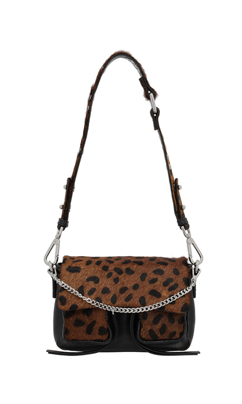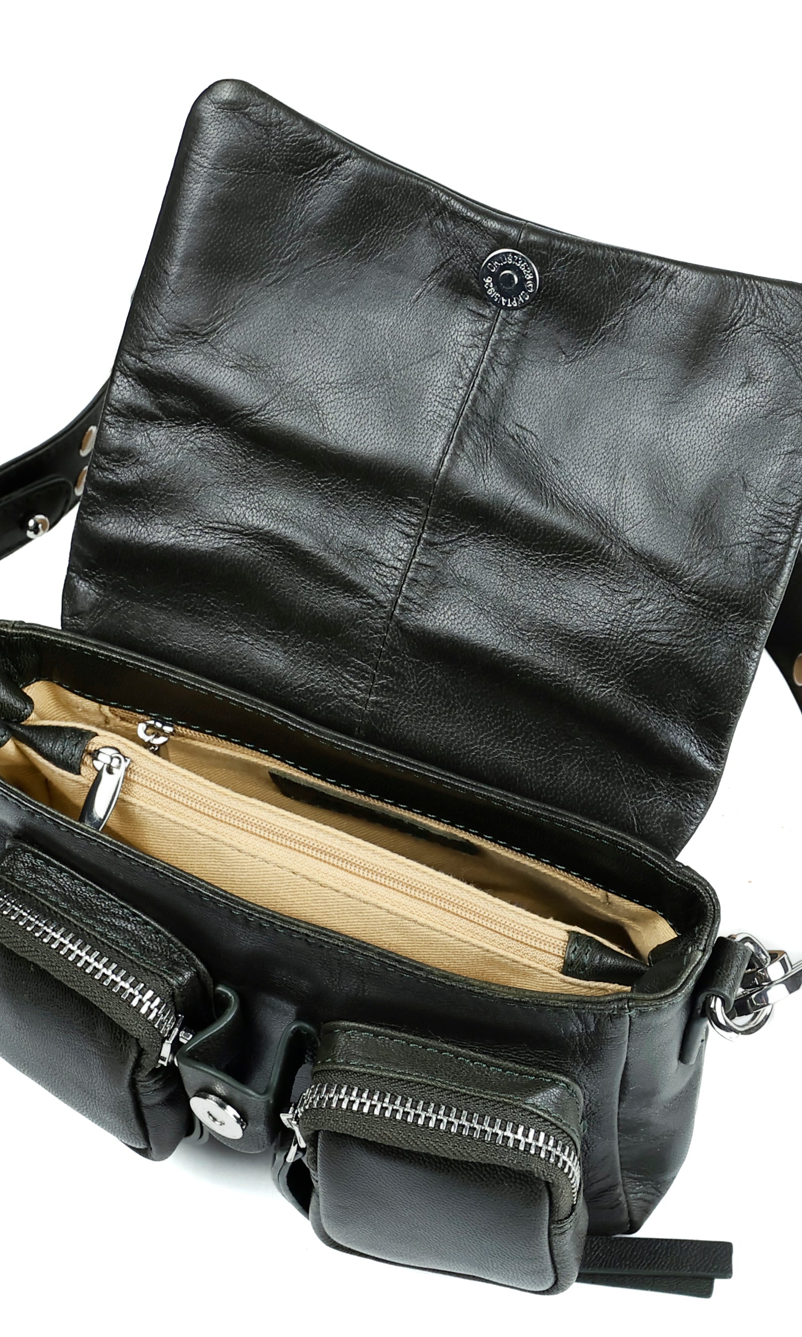 • Drei austauschbare Riemen für einfache Übergänge: ein Lederschulterriemen mit Metallnieten, ein verstellbarer Leder-Kreuzriemen und eine dekorative Metallkette