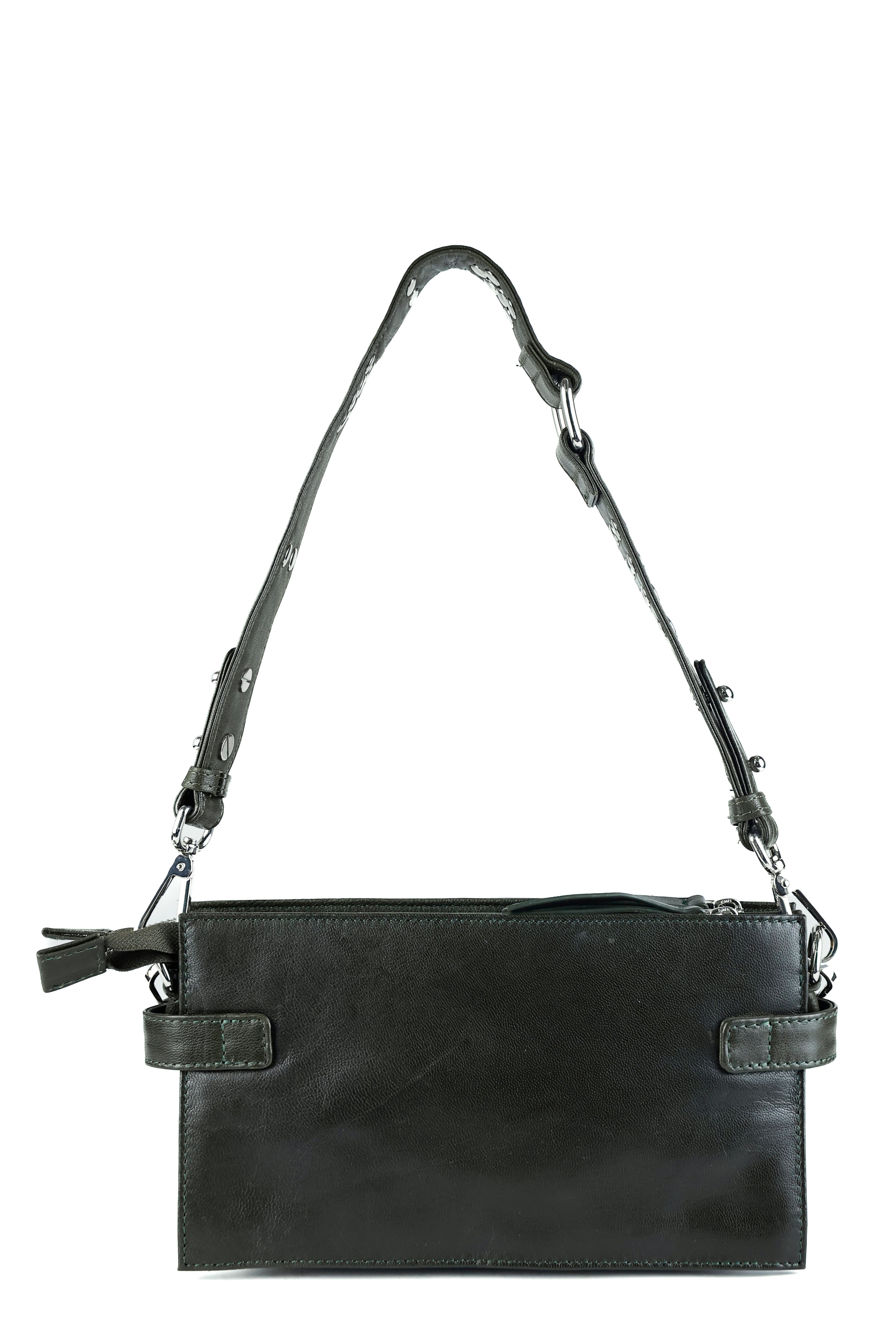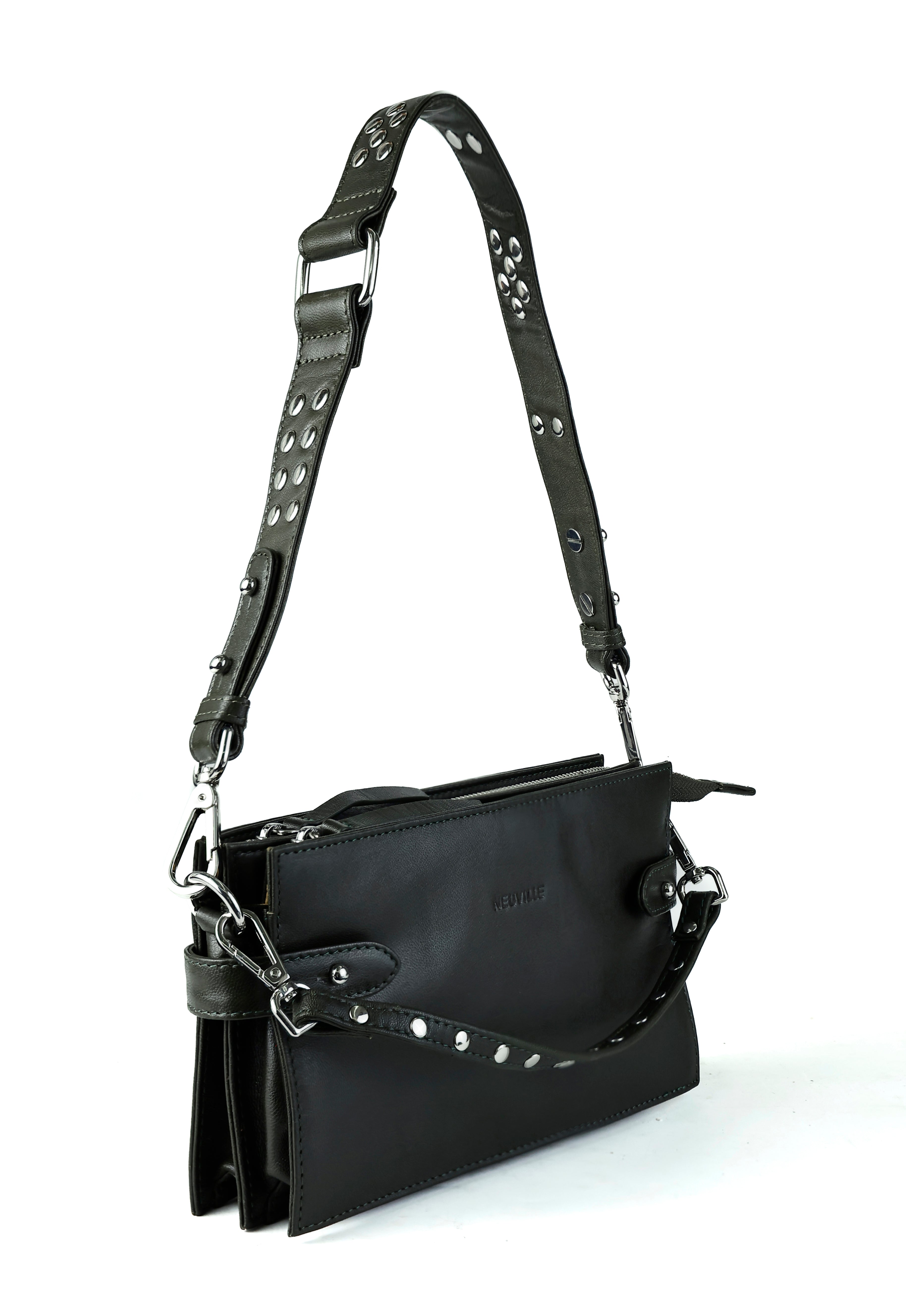 - Drei austauschbare Riemen für einfache Übergänge: ein Schulterriemen aus Leder mit Metallnieten, ein verstellbarer Crossbody-Riemen aus Leder und ein dekorativer kleiner Riemen mit Nieten, um die Tasche in der Hand zu tragen.