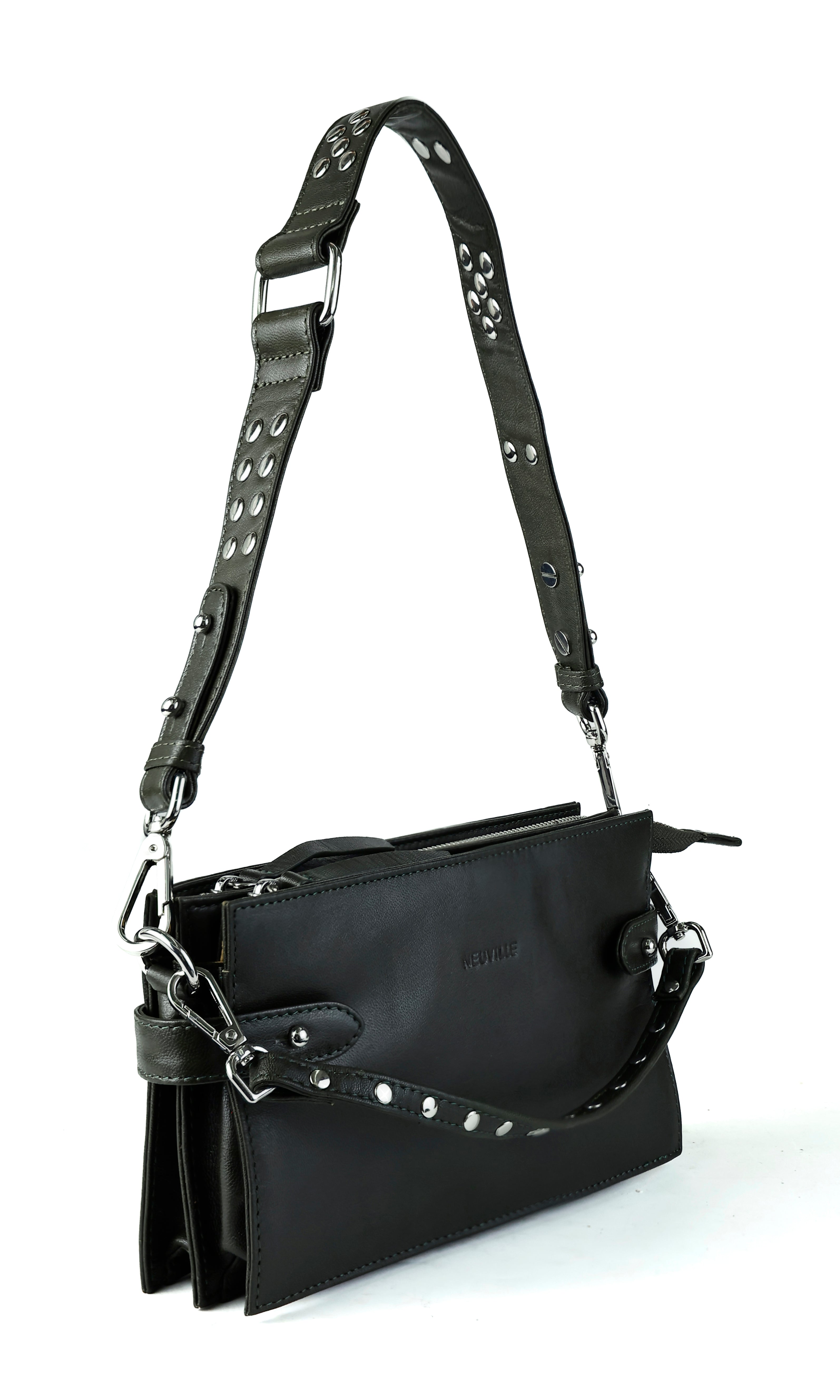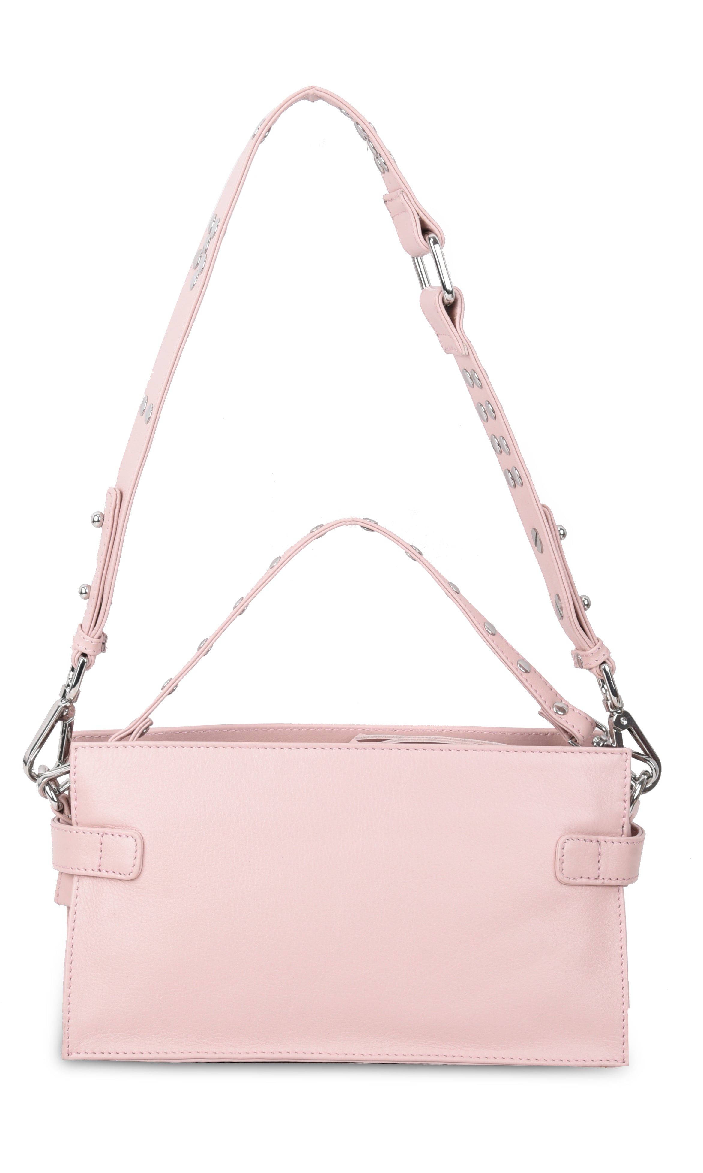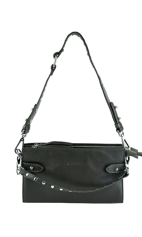 - Drei austauschbare Riemen für einfache Übergänge: ein Schulterriemen aus Leder mit Metallnieten, ein verstellbarer Crossbody-Riemen aus Leder und ein dekorativer kleiner Riemen mit Nieten, um die Tasche in der Hand zu tragen.