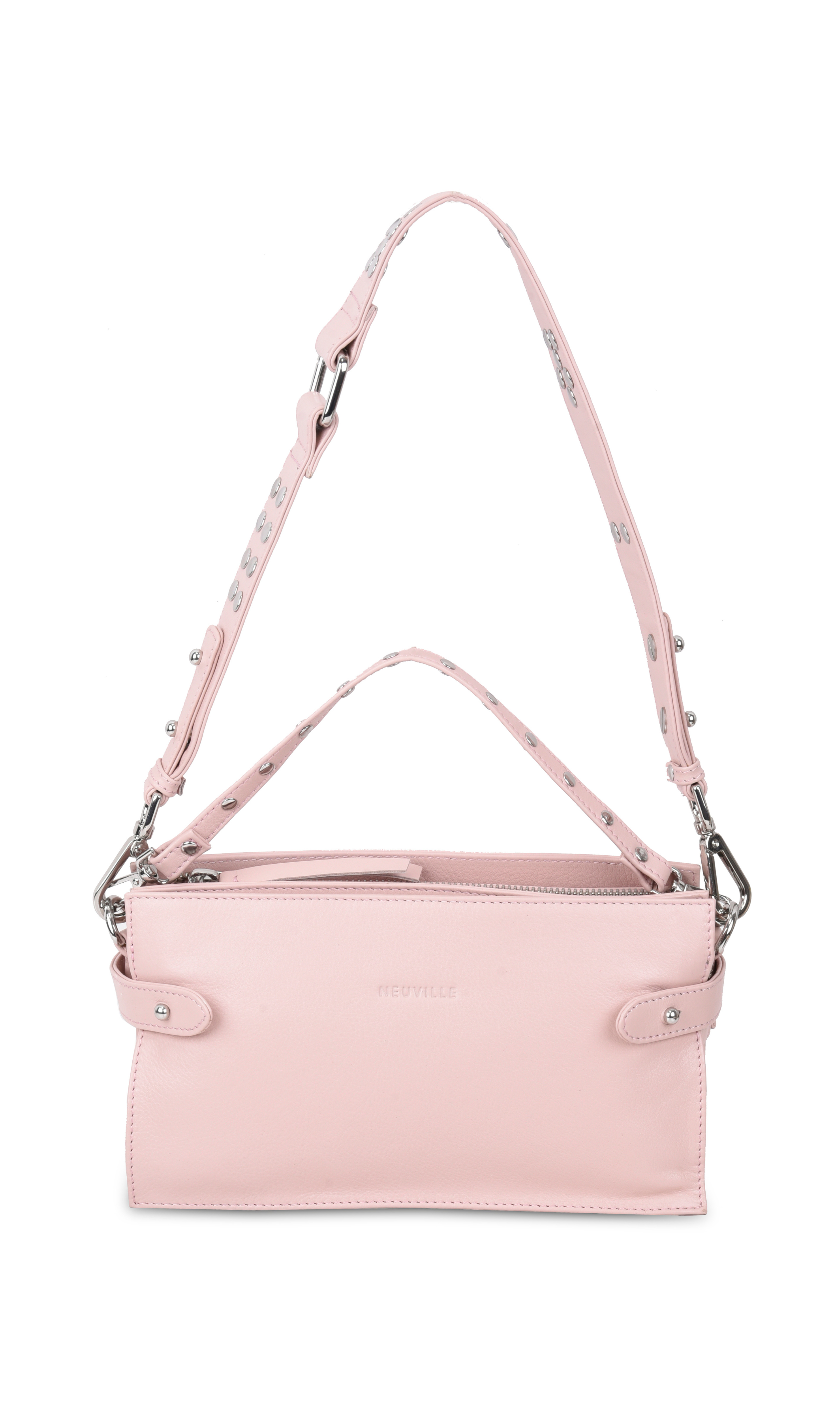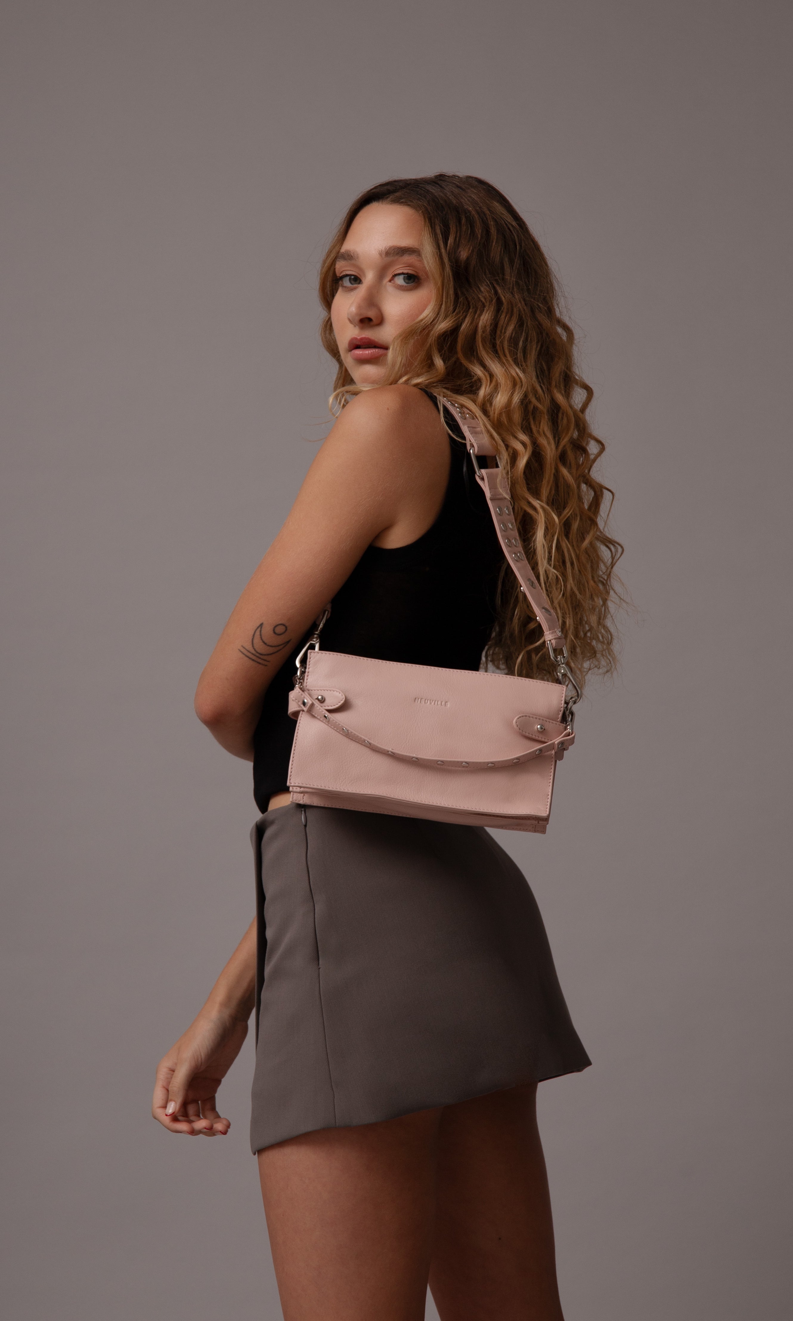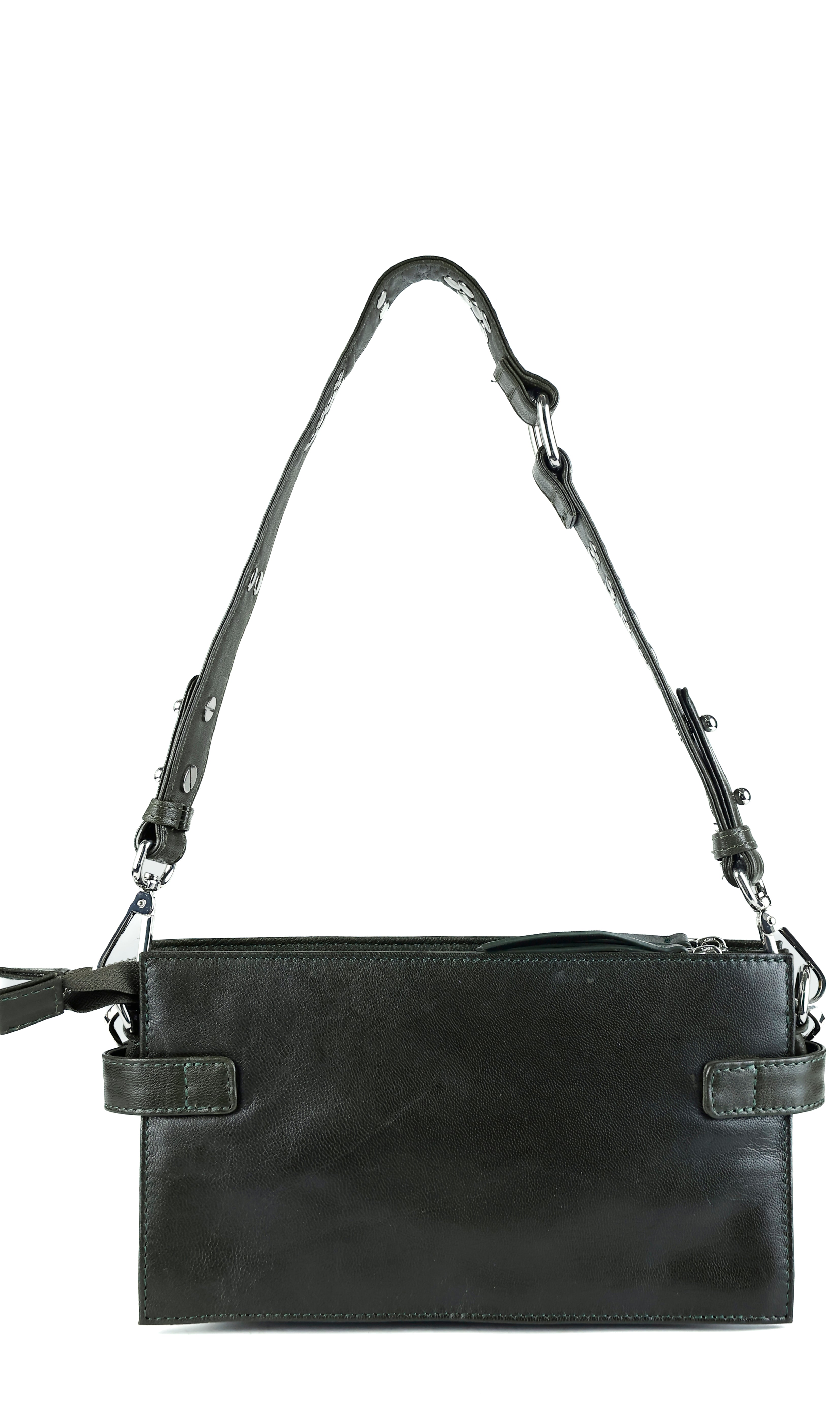 - Drei austauschbare Riemen für einfache Übergänge: ein Schulterriemen aus Leder mit Metallnieten, ein verstellbarer Crossbody-Riemen aus Leder und ein dekorativer kleiner Riemen mit Nieten, um die Tasche in der Hand zu tragen.