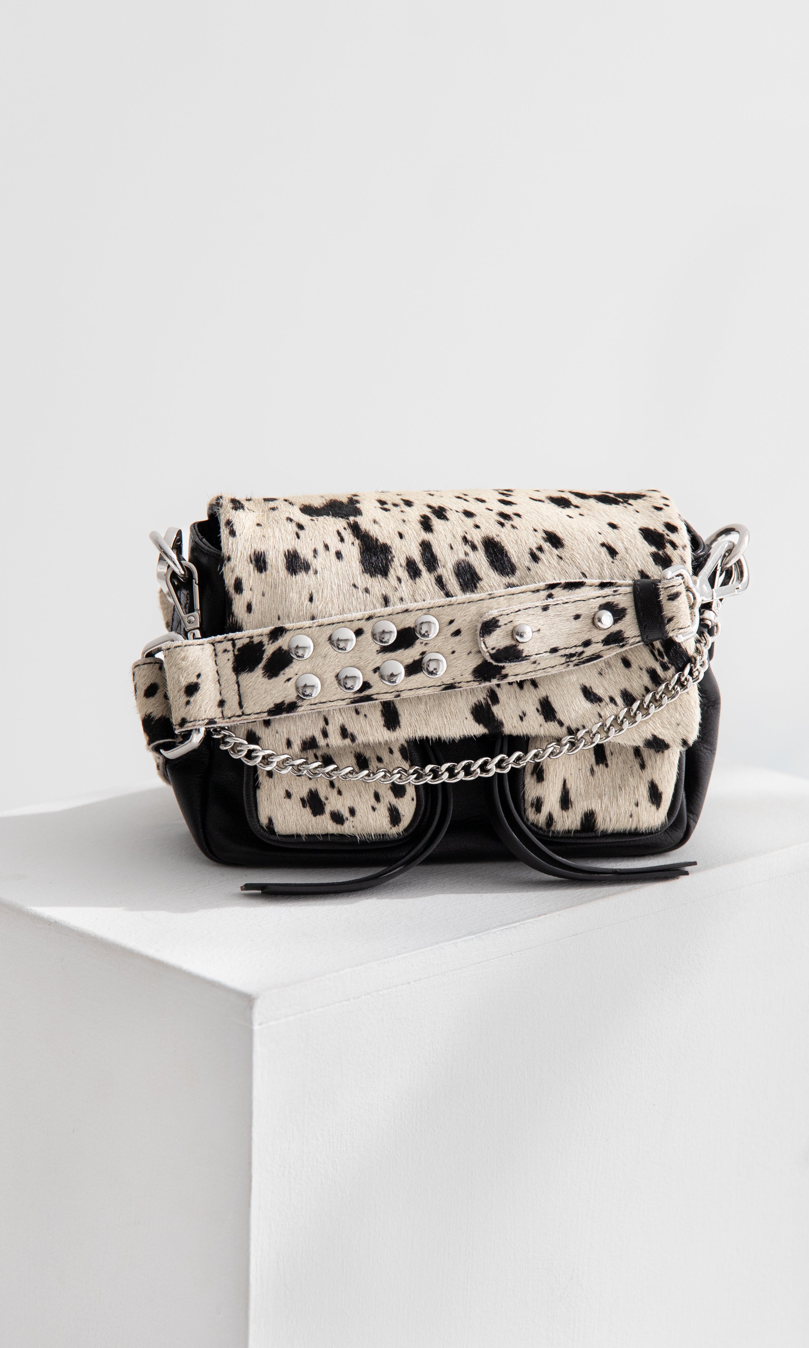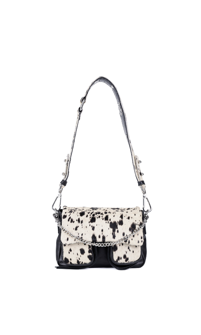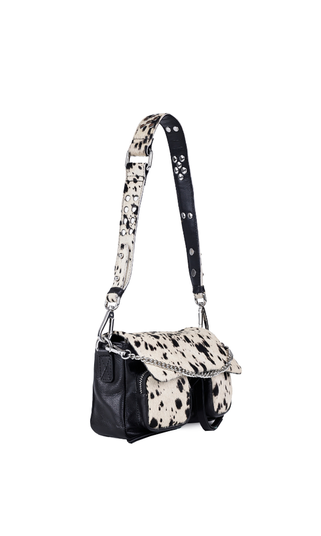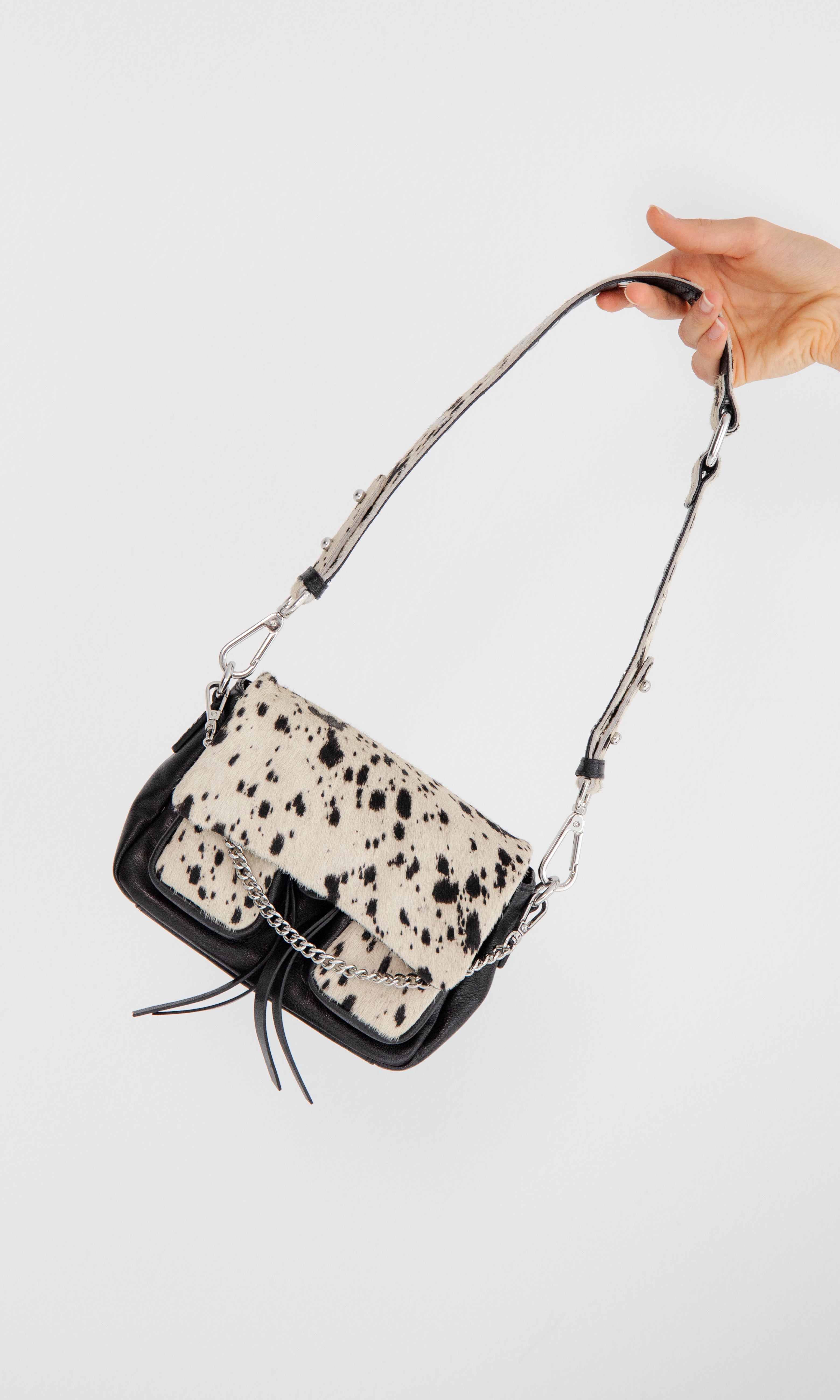 - Drei austauschbare Riemen für einfache Übergänge: ein Lederschulterriemen mit Metallnieten, ein verstellbarer Leder-Kreuzriemen und eine dekorative Metallkette