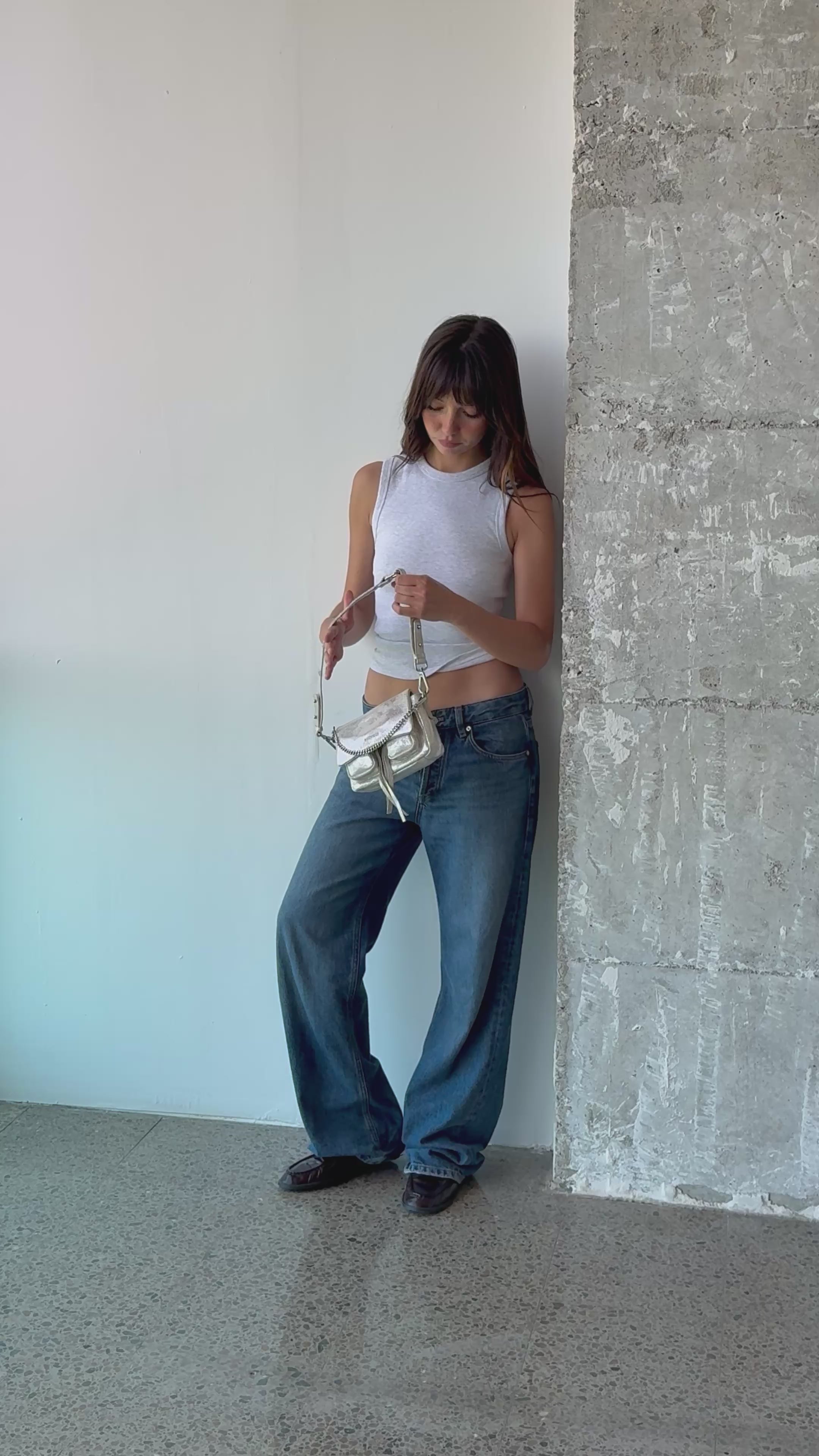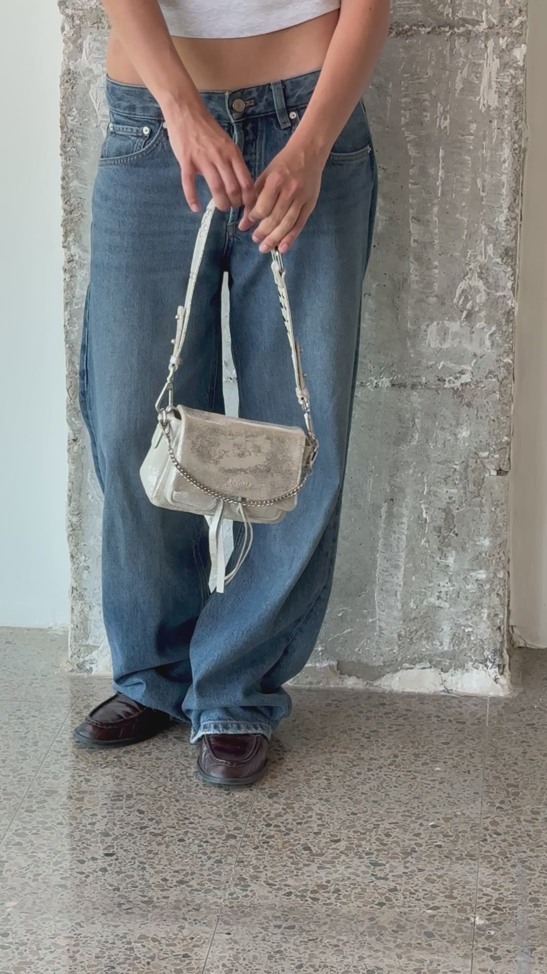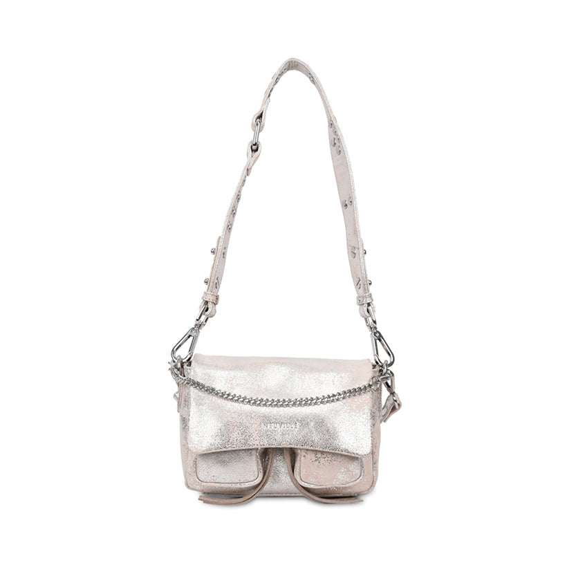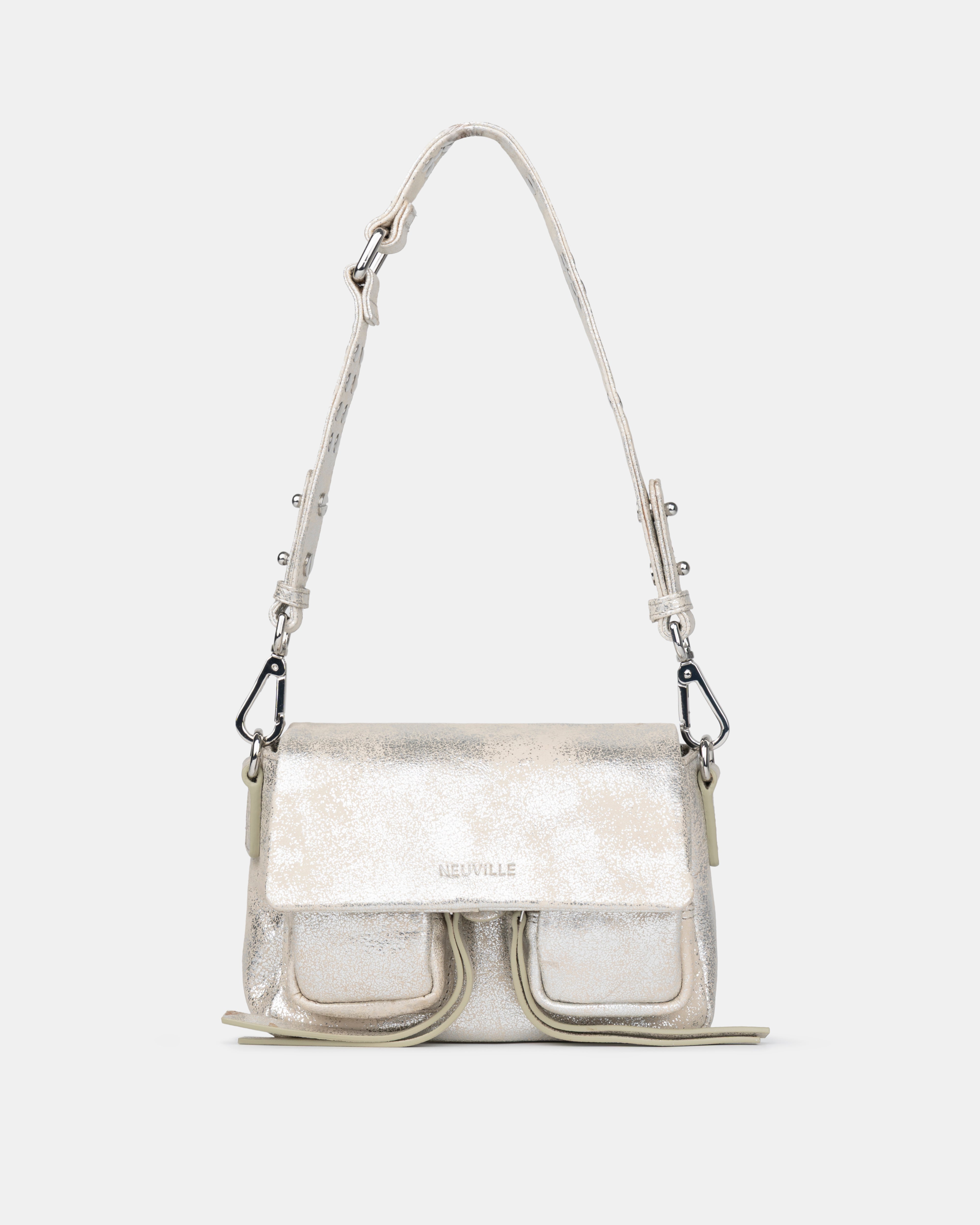 - Drei austauschbare Riemen für einfache Übergänge: ein Lederschulterriemen mit Metallnieten, ein verstellbarer Leder-Kreuzriemen und eine dekorative Metallkette