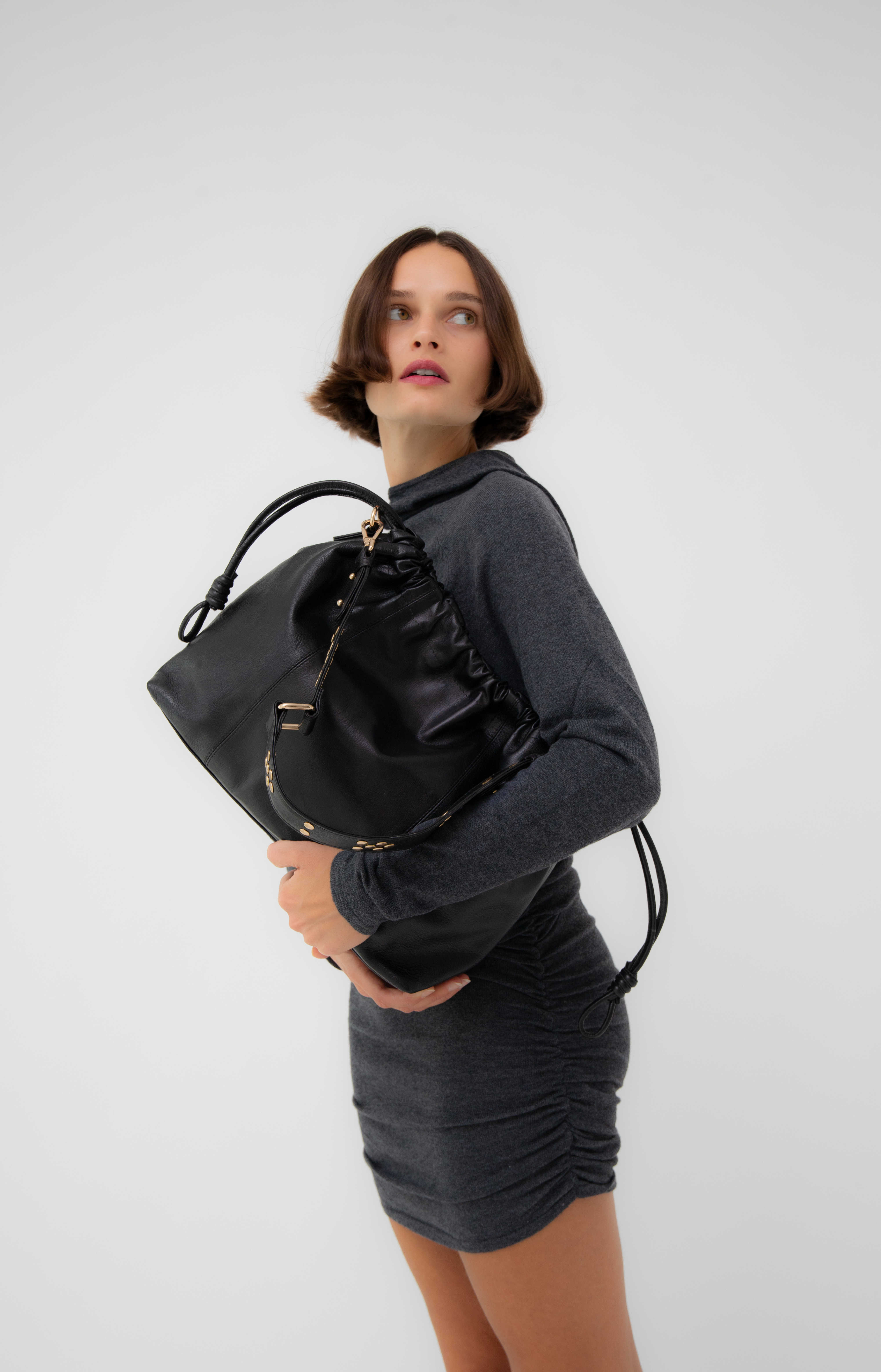 - Two interchangeable straps for easy transitions : a leather shoulder strap with metal studs, and adjustable leather crossbody strap.