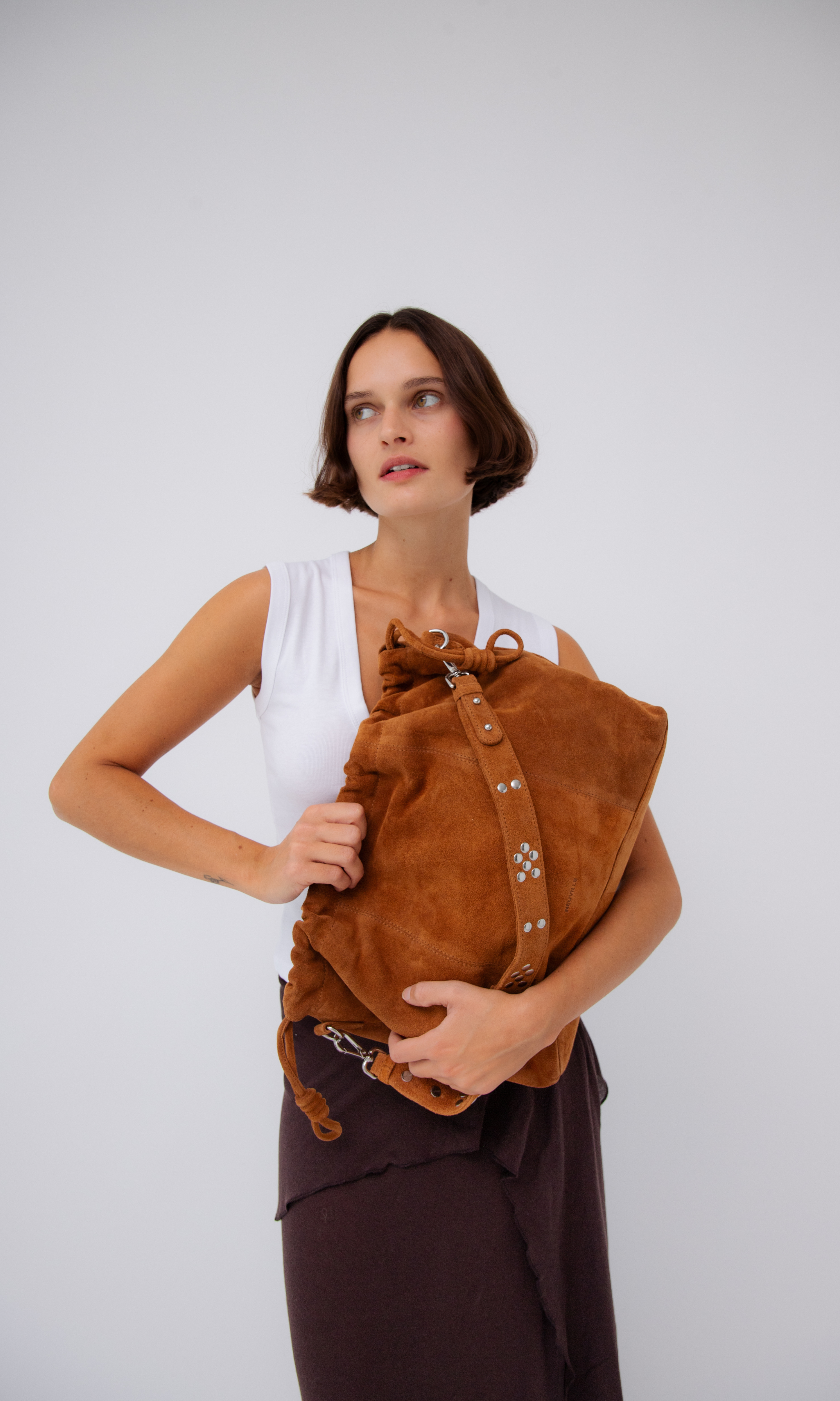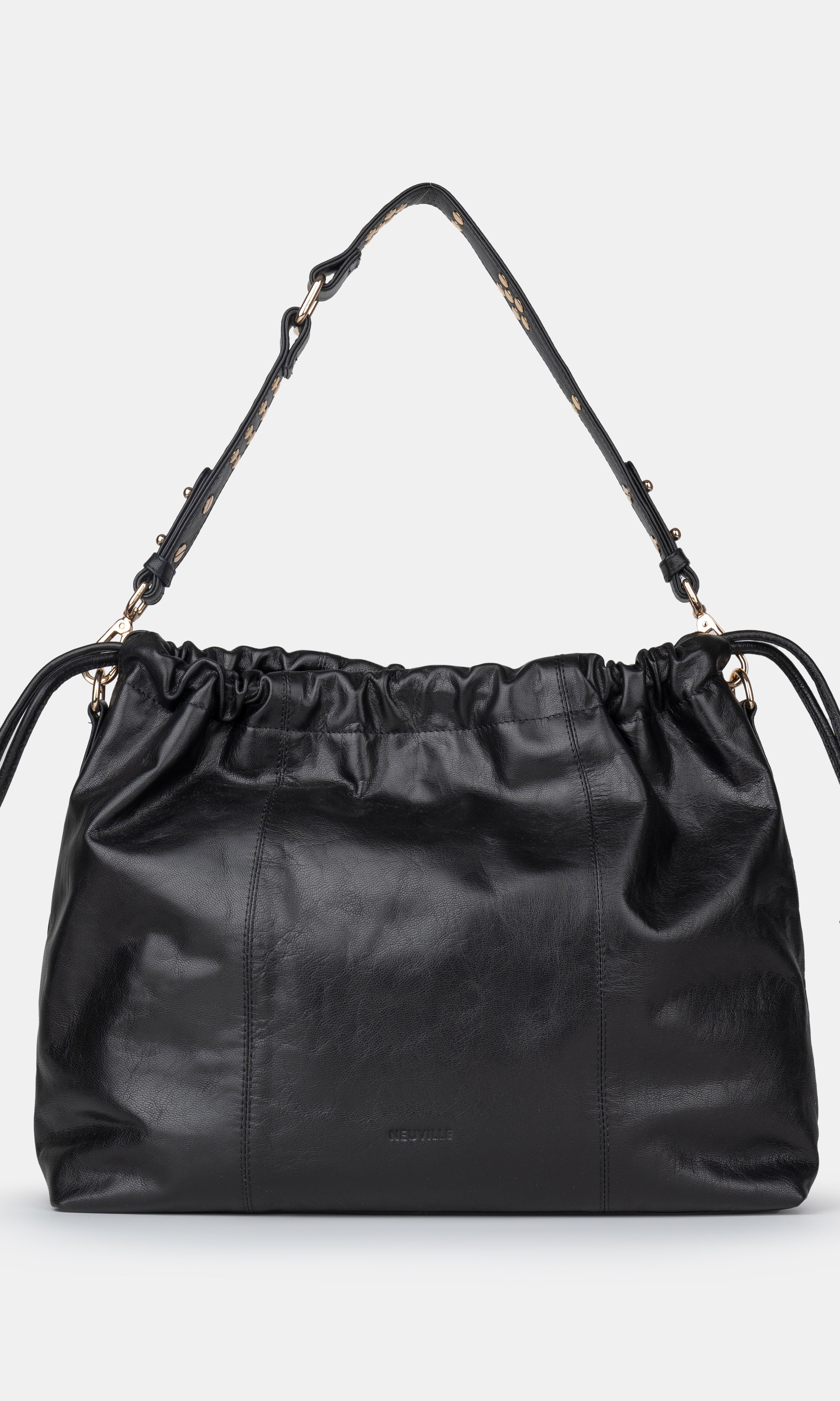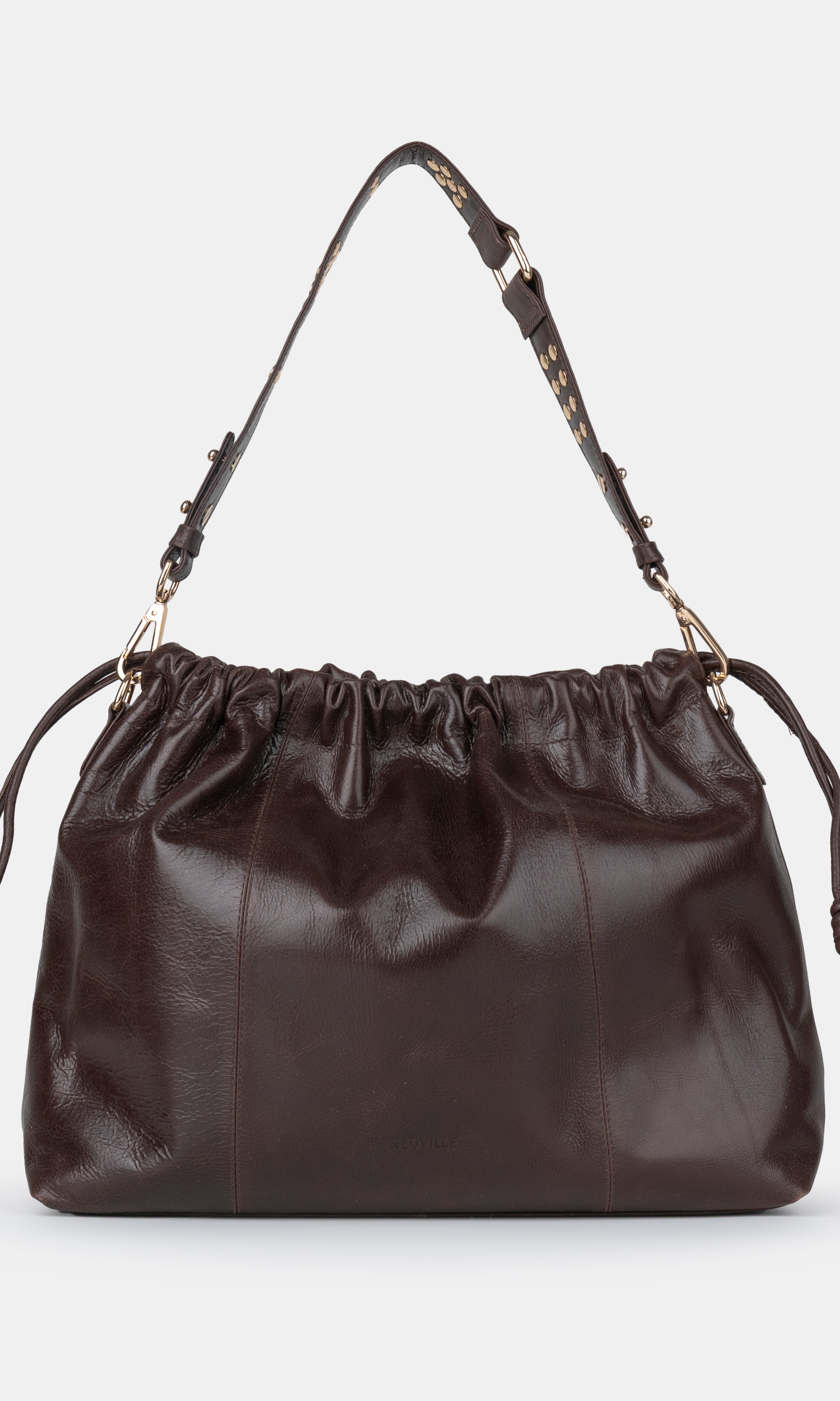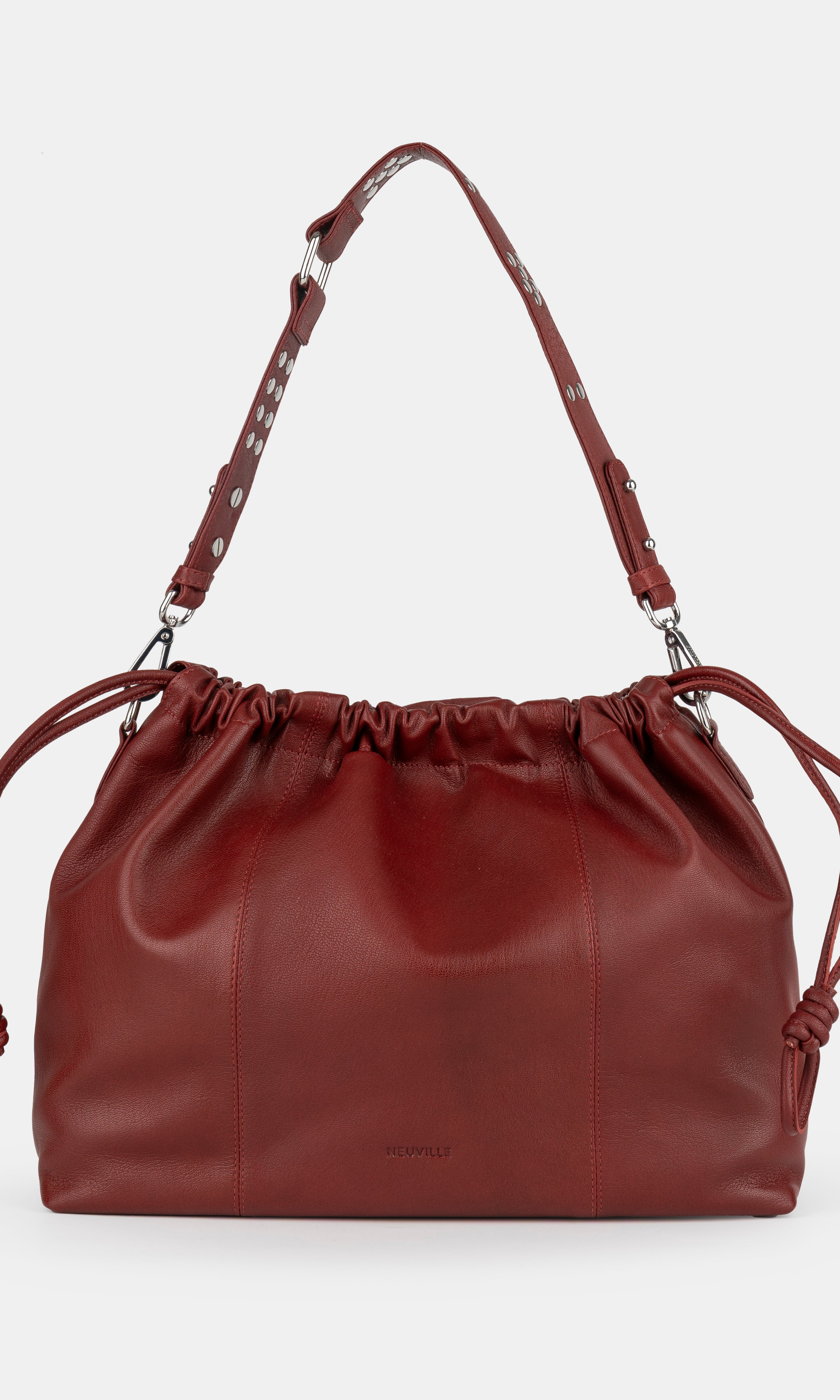 • Two interchangeable straps for easy transitions : a leather shoulder strap with metal studs, and adjustable leather crossbody strap.