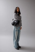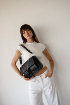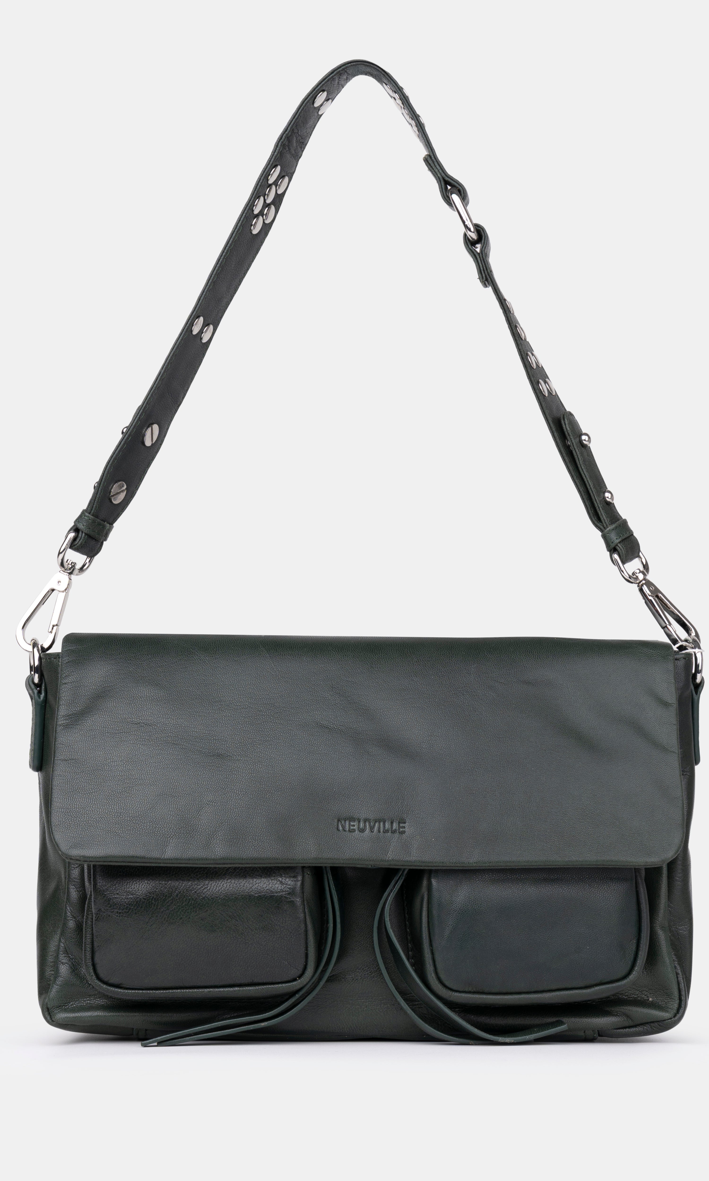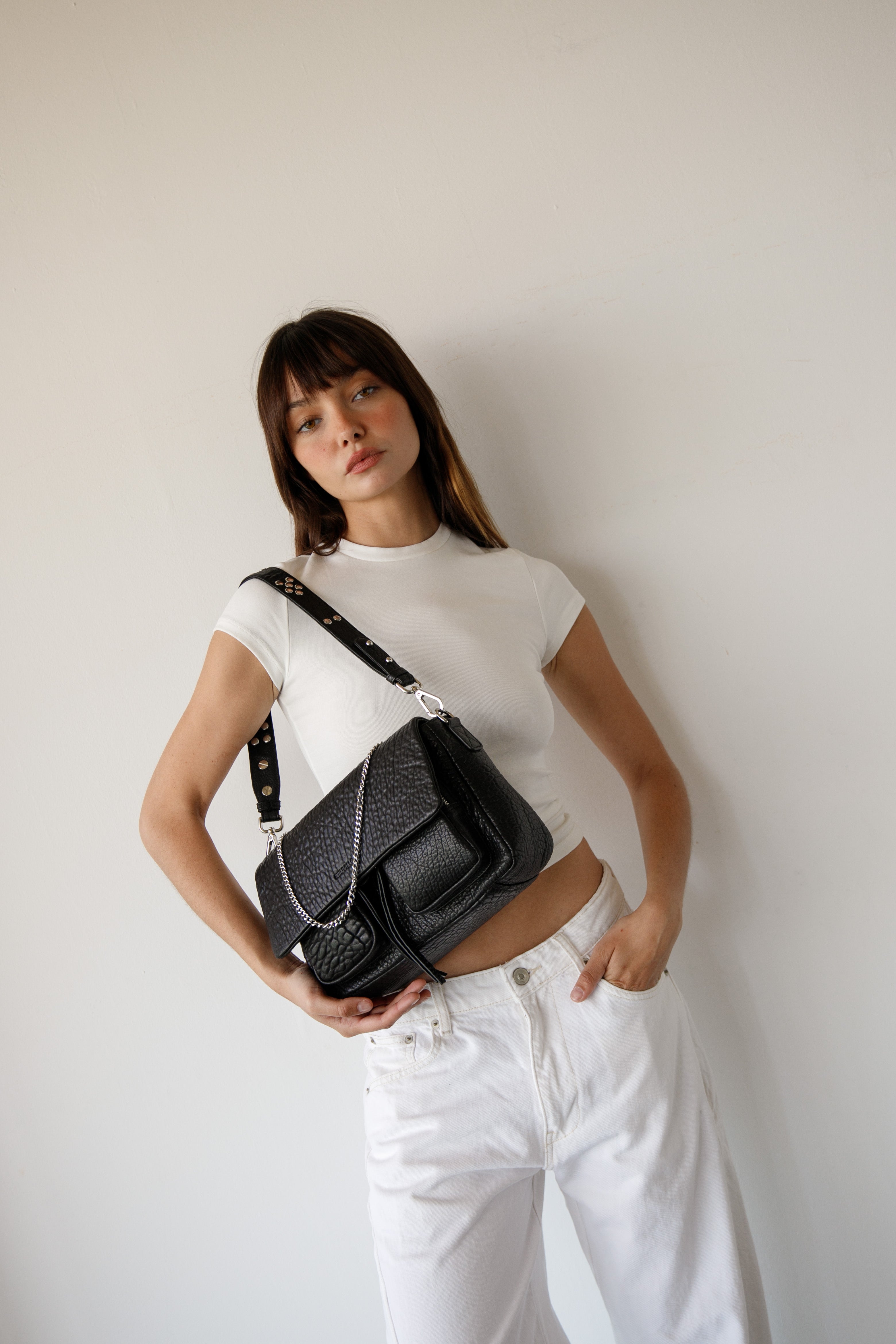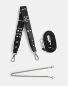 • Three interchangeable straps for easy outfit transitions: a leather shoulder strap with metal studs, an adjustable leather crossbody strap and a top handle decorative metal chain