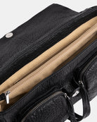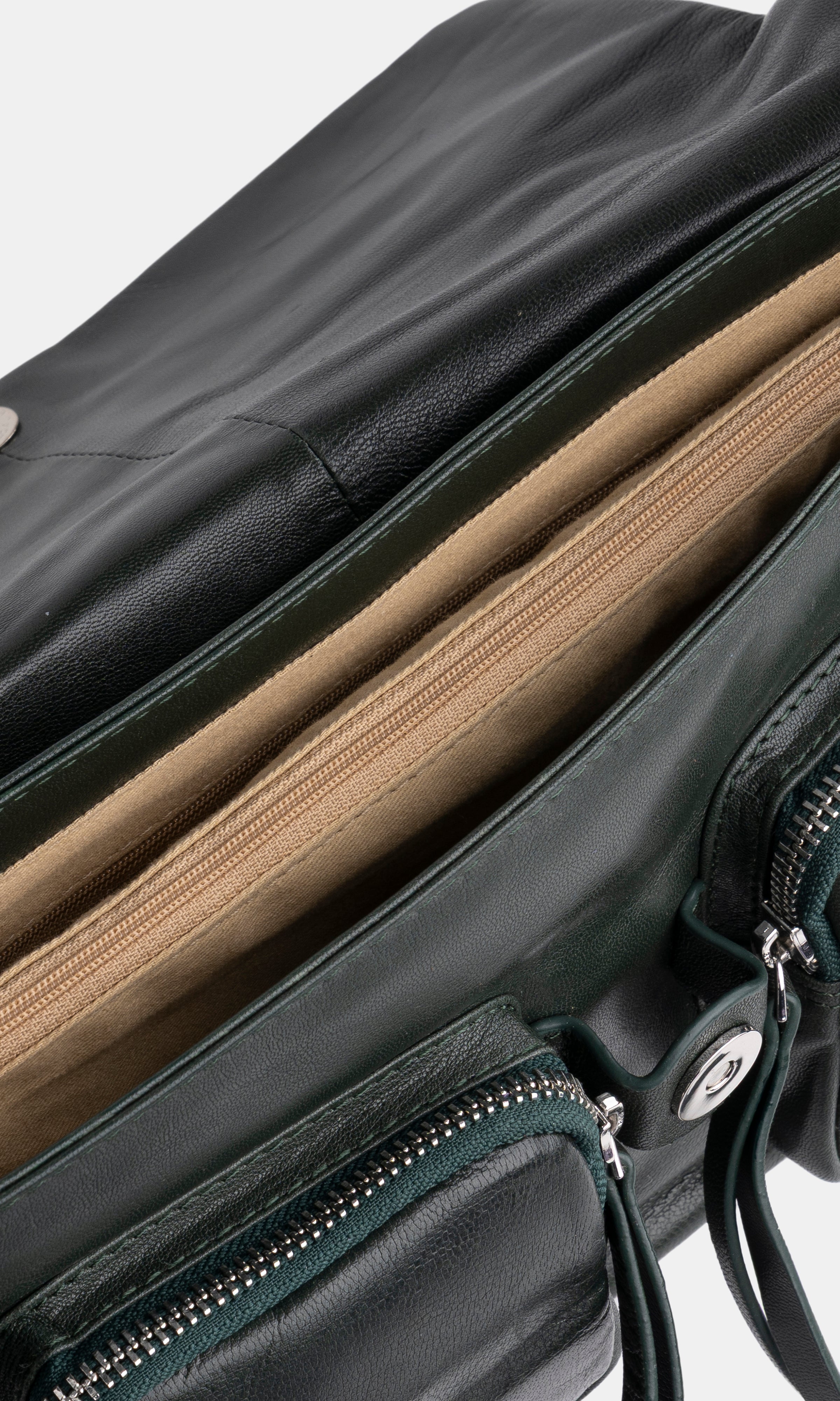 • Two interior compartments, divided by a large central zippered pocket.