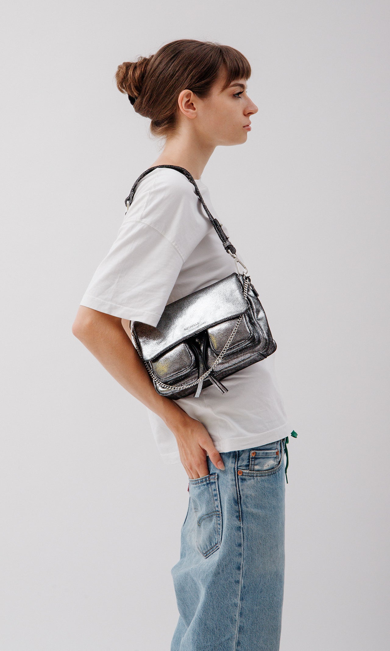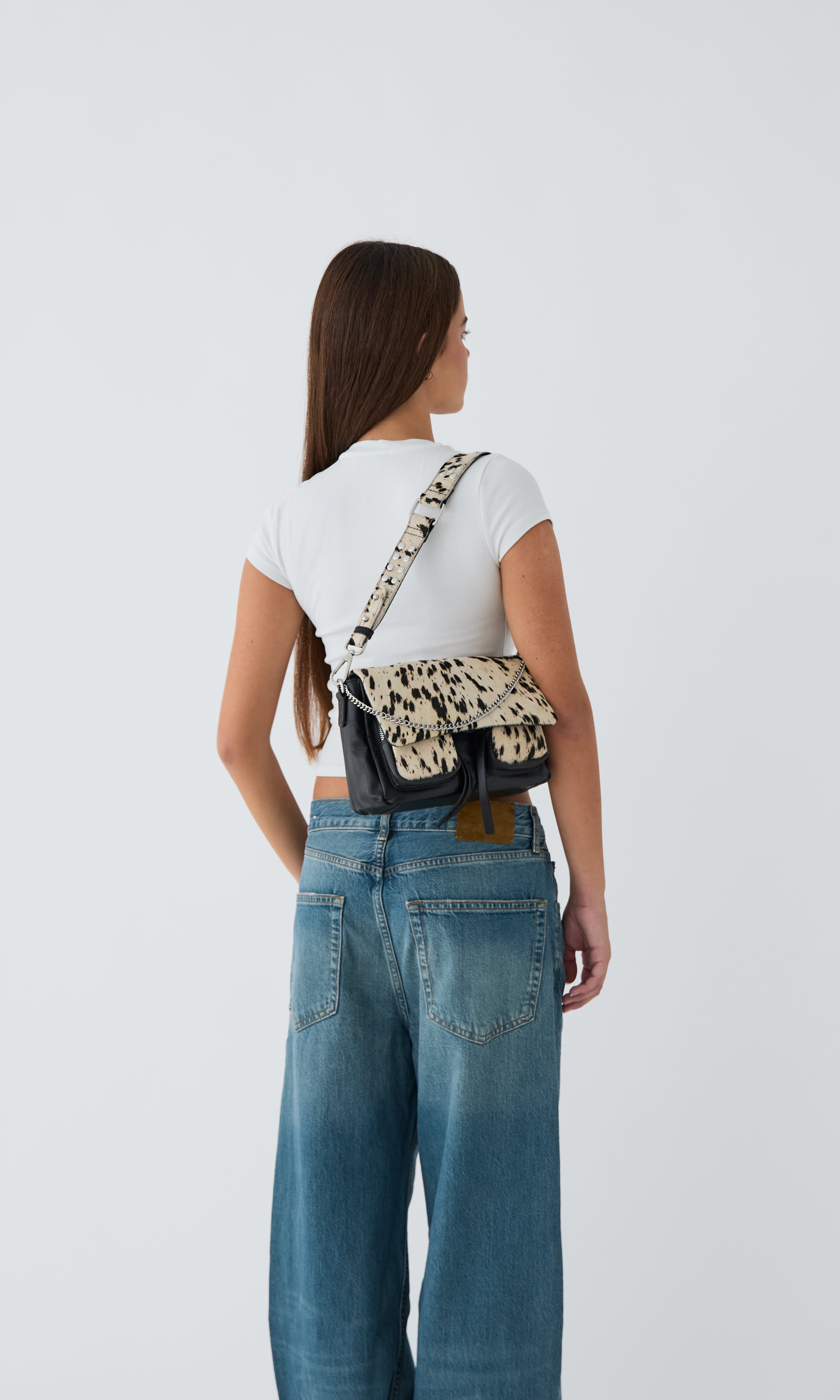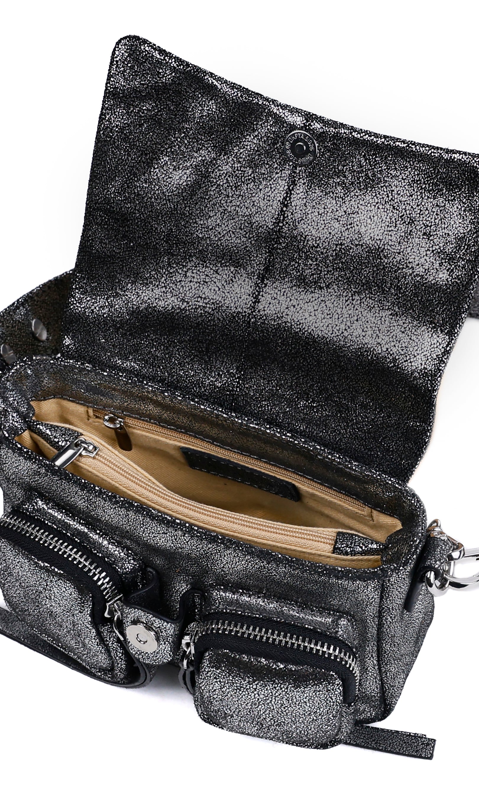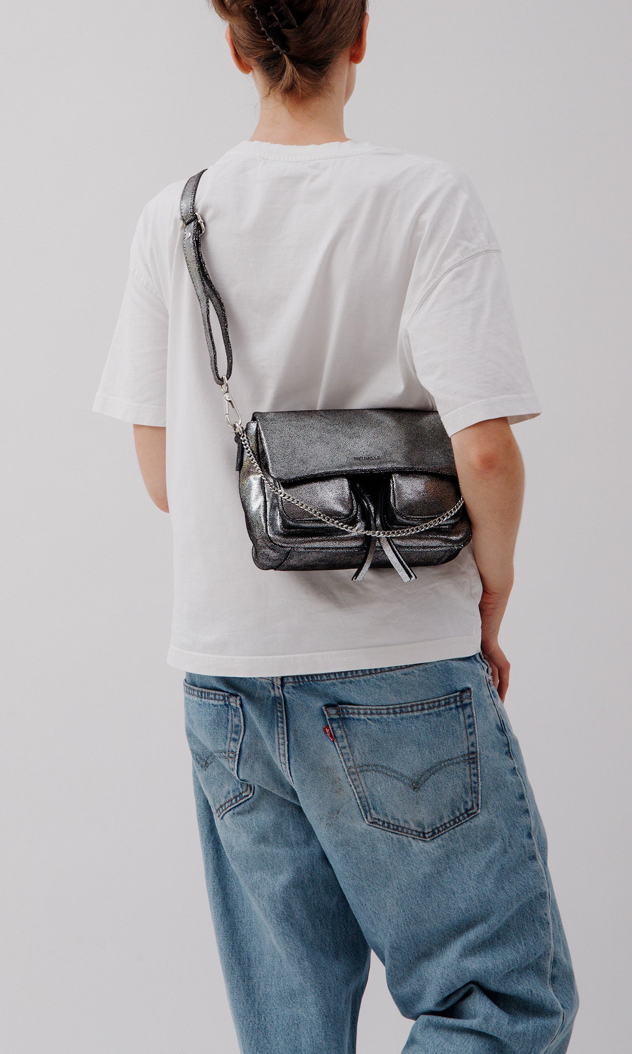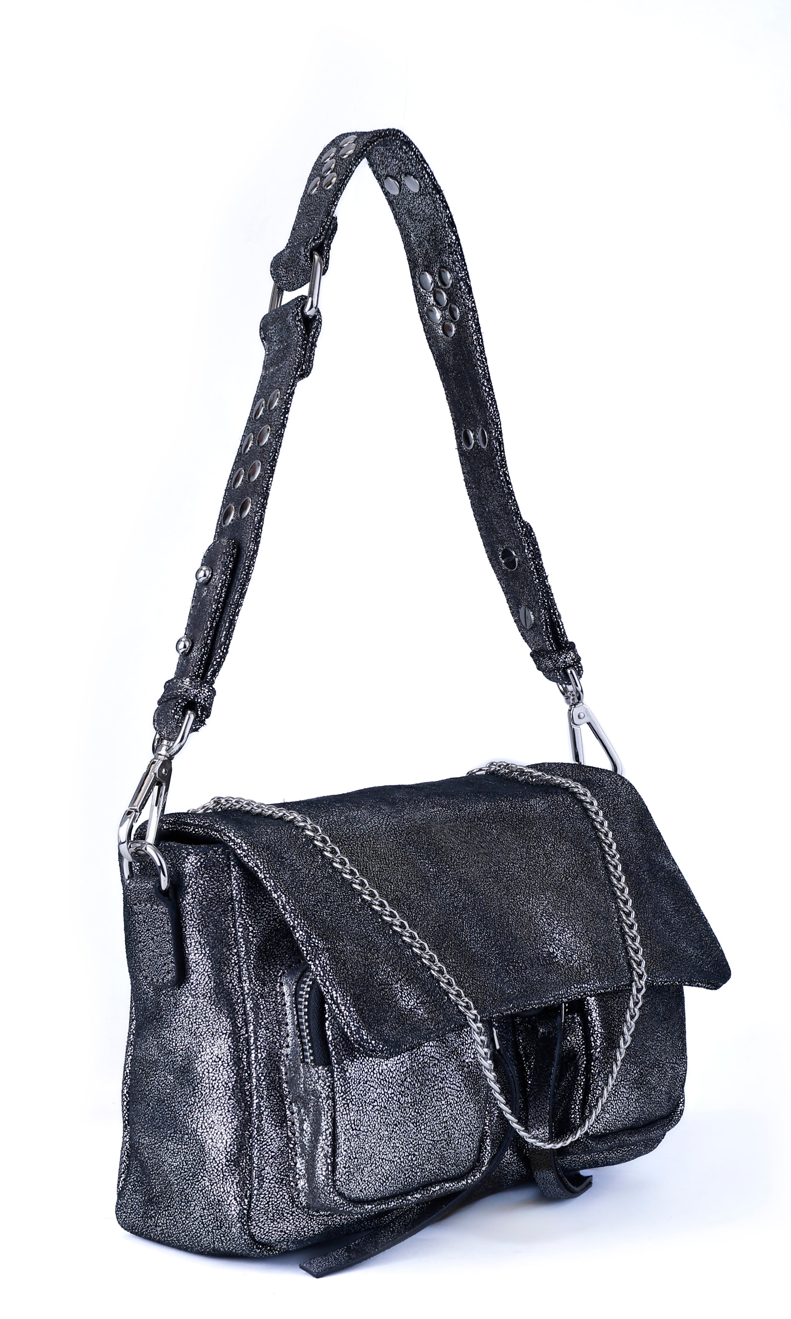 - Three interchangeable straps for easy transitions : a leather shoulder strap with metal studs, and adjustable leather crossbody strap and a decorative metal chain