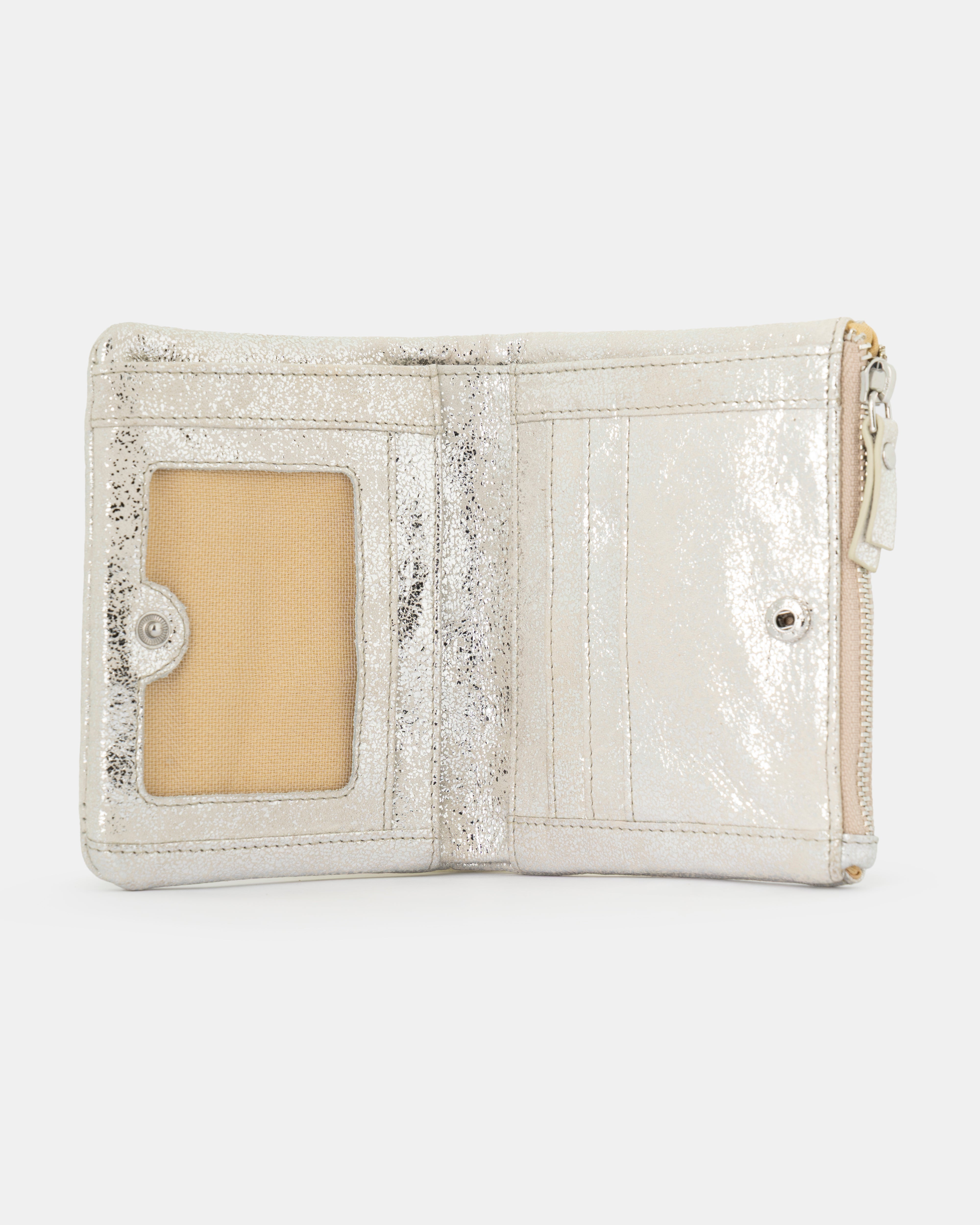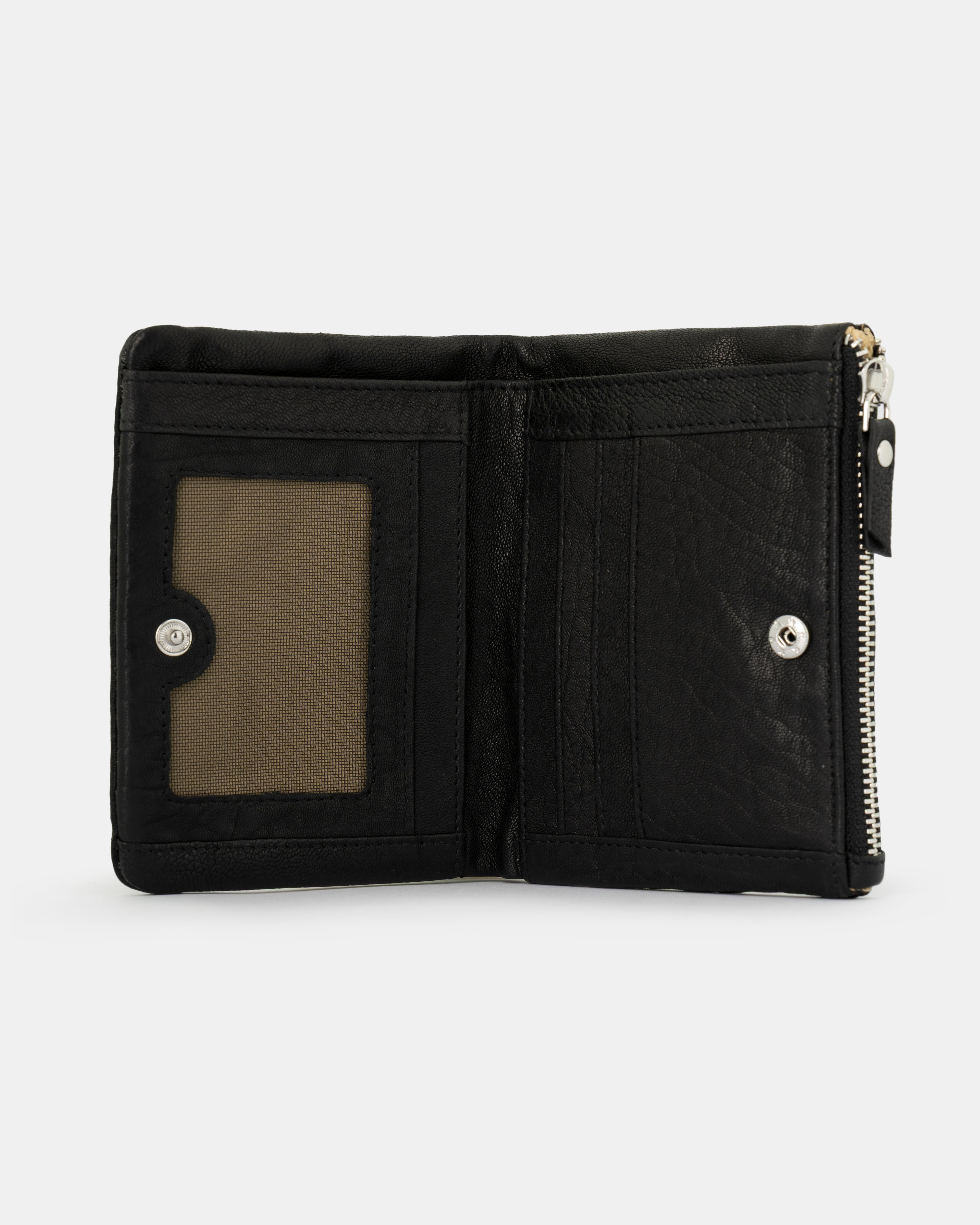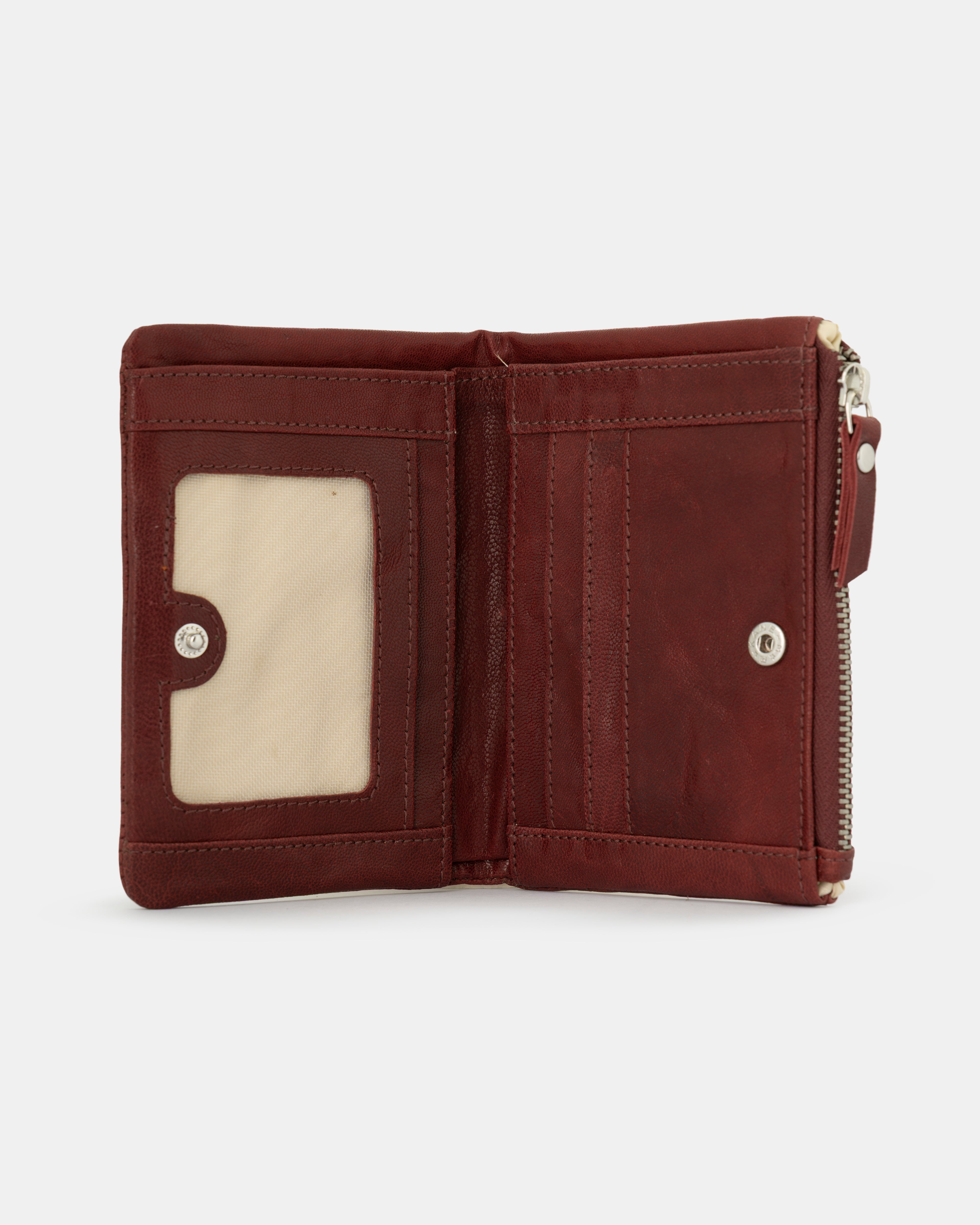 - Petit portefeuille qui se ferme à l'aide d'un bouton-pression. Il offre 6 fentes pour cartes, dont l'une est dotée d'une fenêtre transparente.