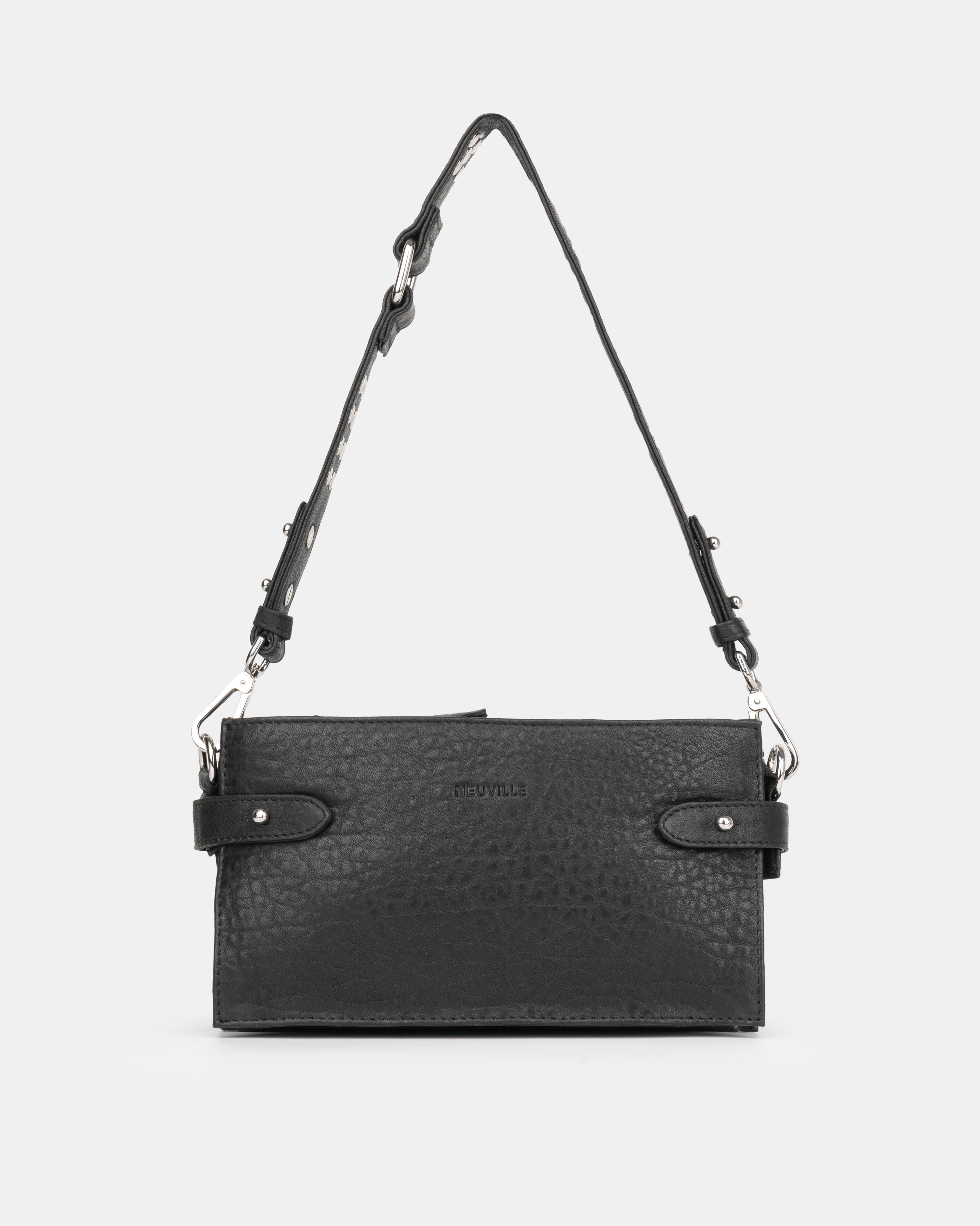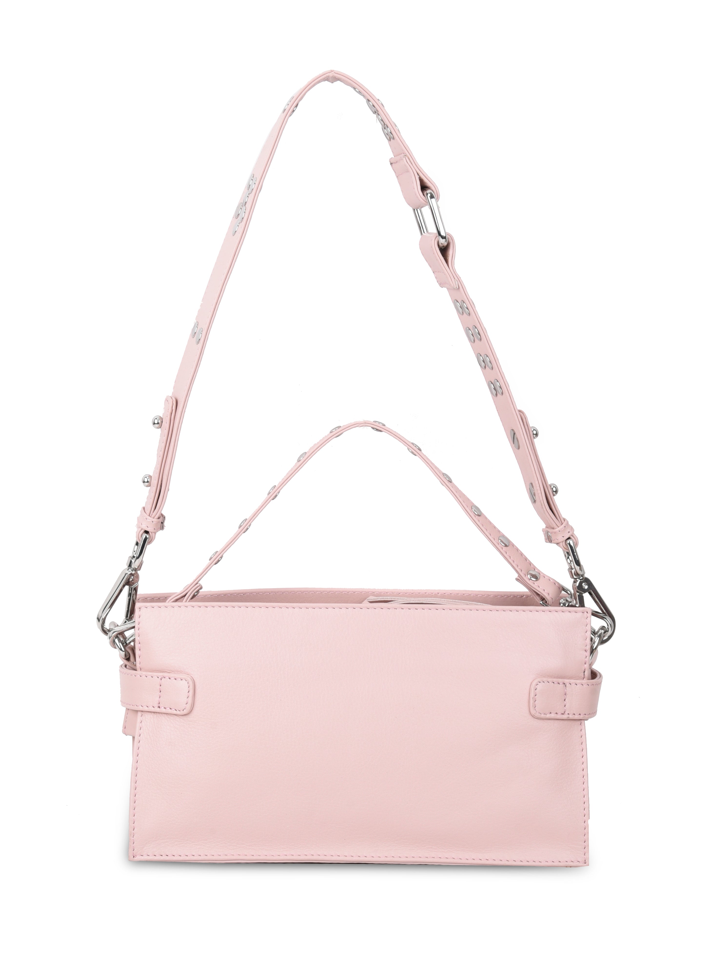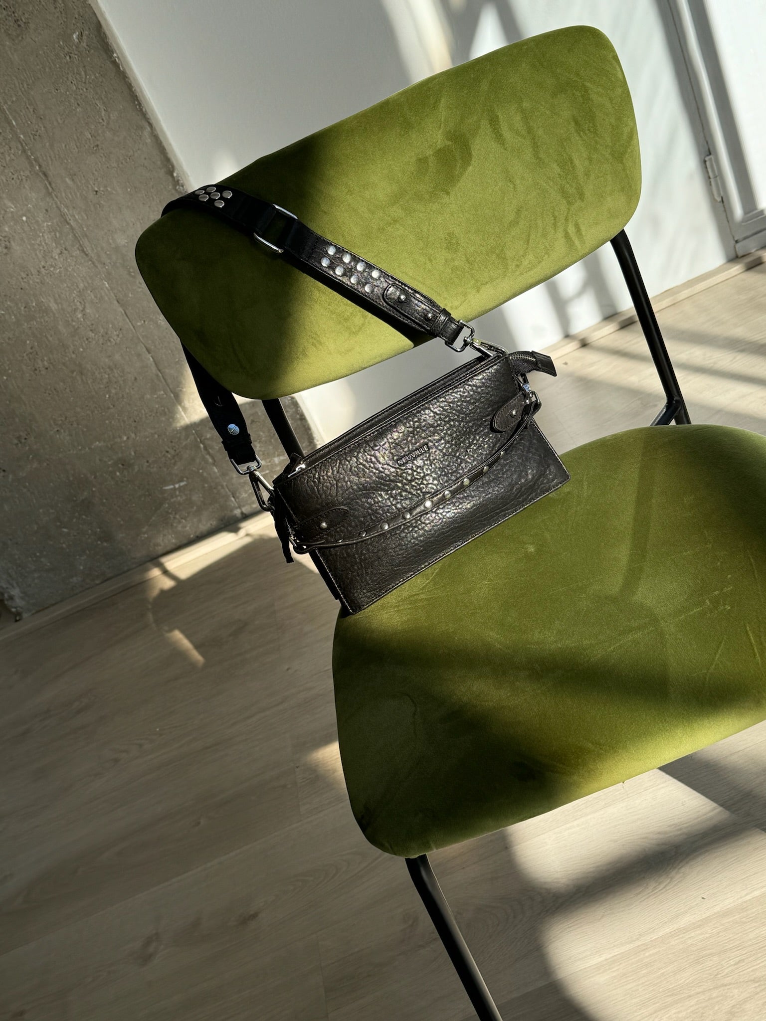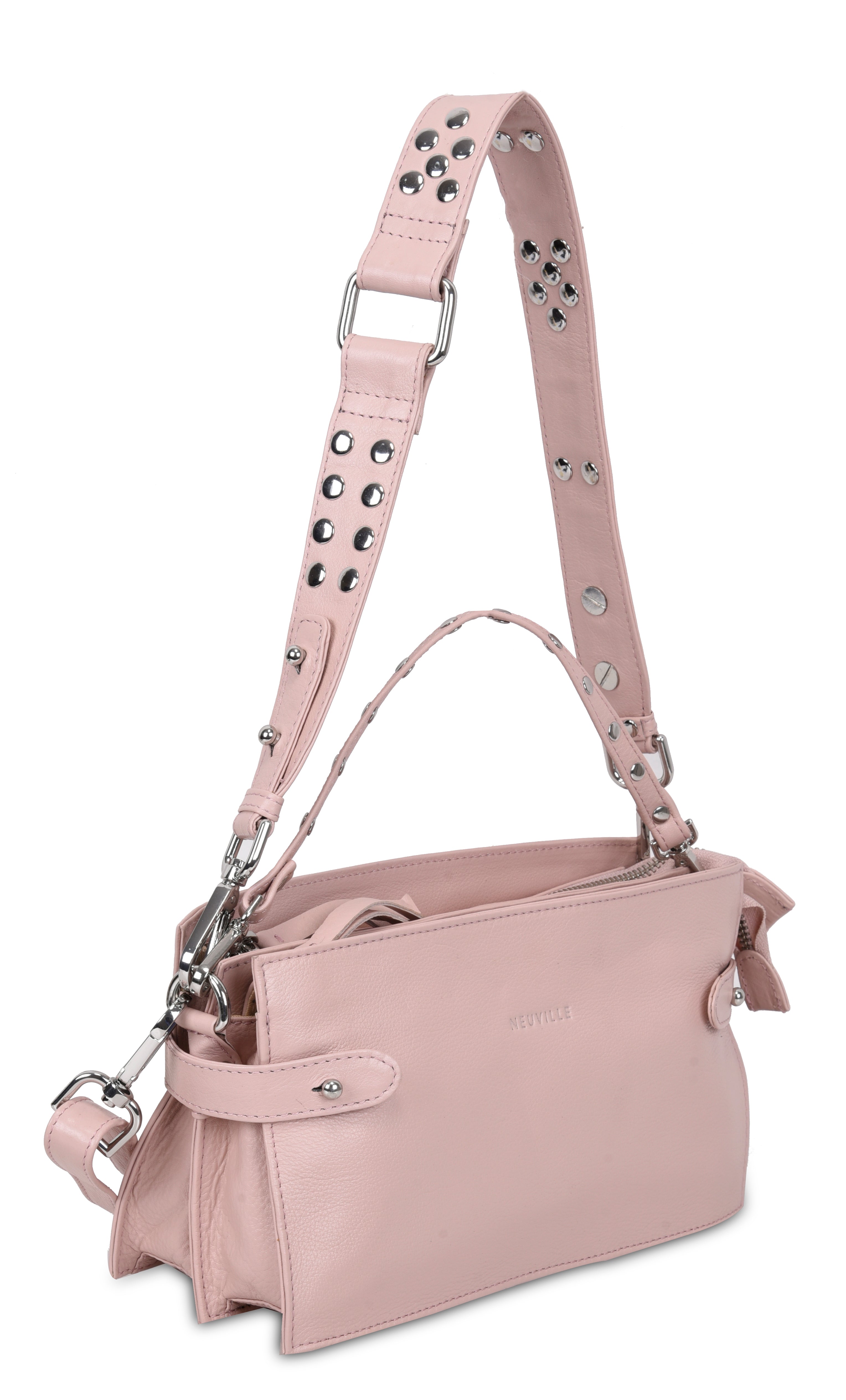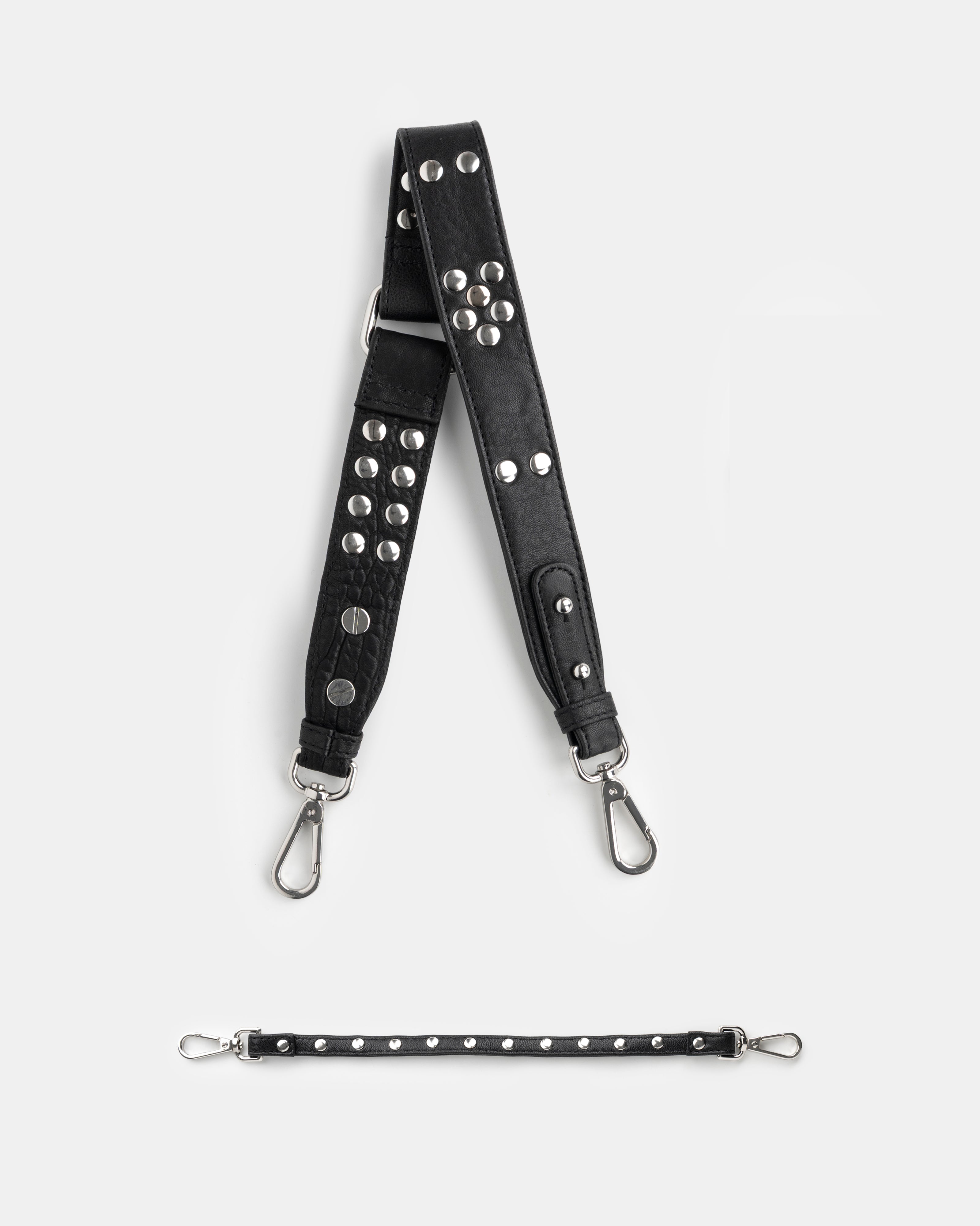 - Trois sangles interchangeables pour faciliter les transitions : une bandoulière en cuir avec des clous métalliques, une sangle transversale en cuir réglable et une petite sangle décorative avec des clous pour porter le sac à la main.