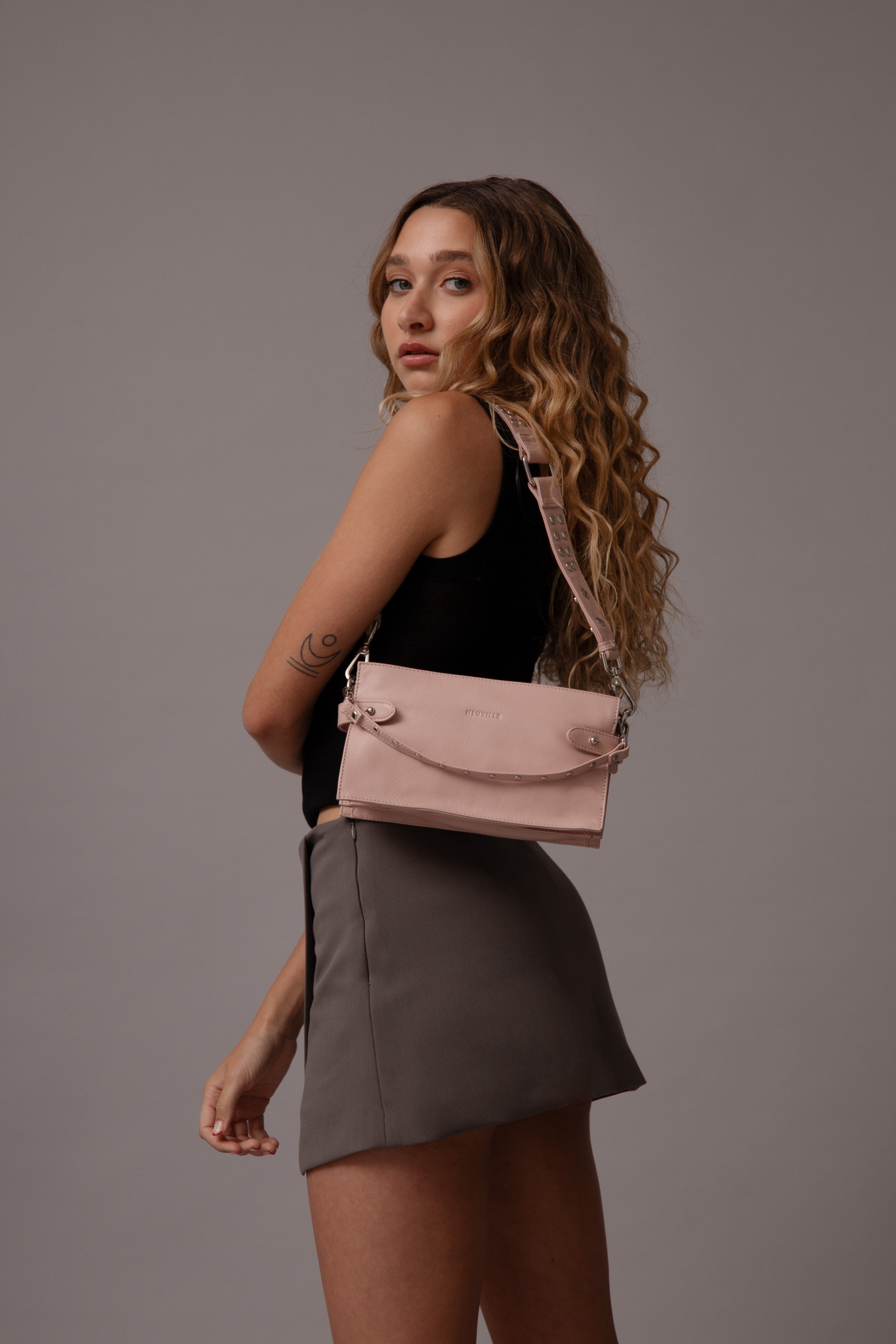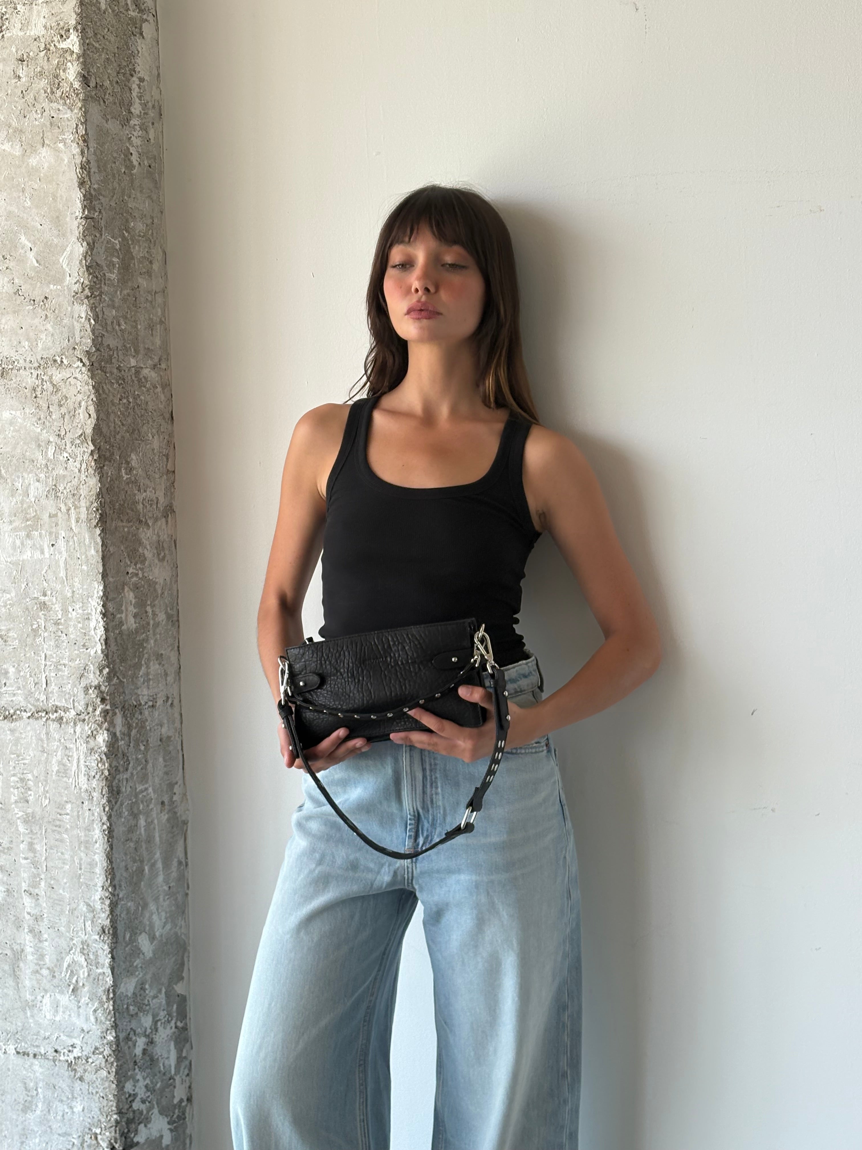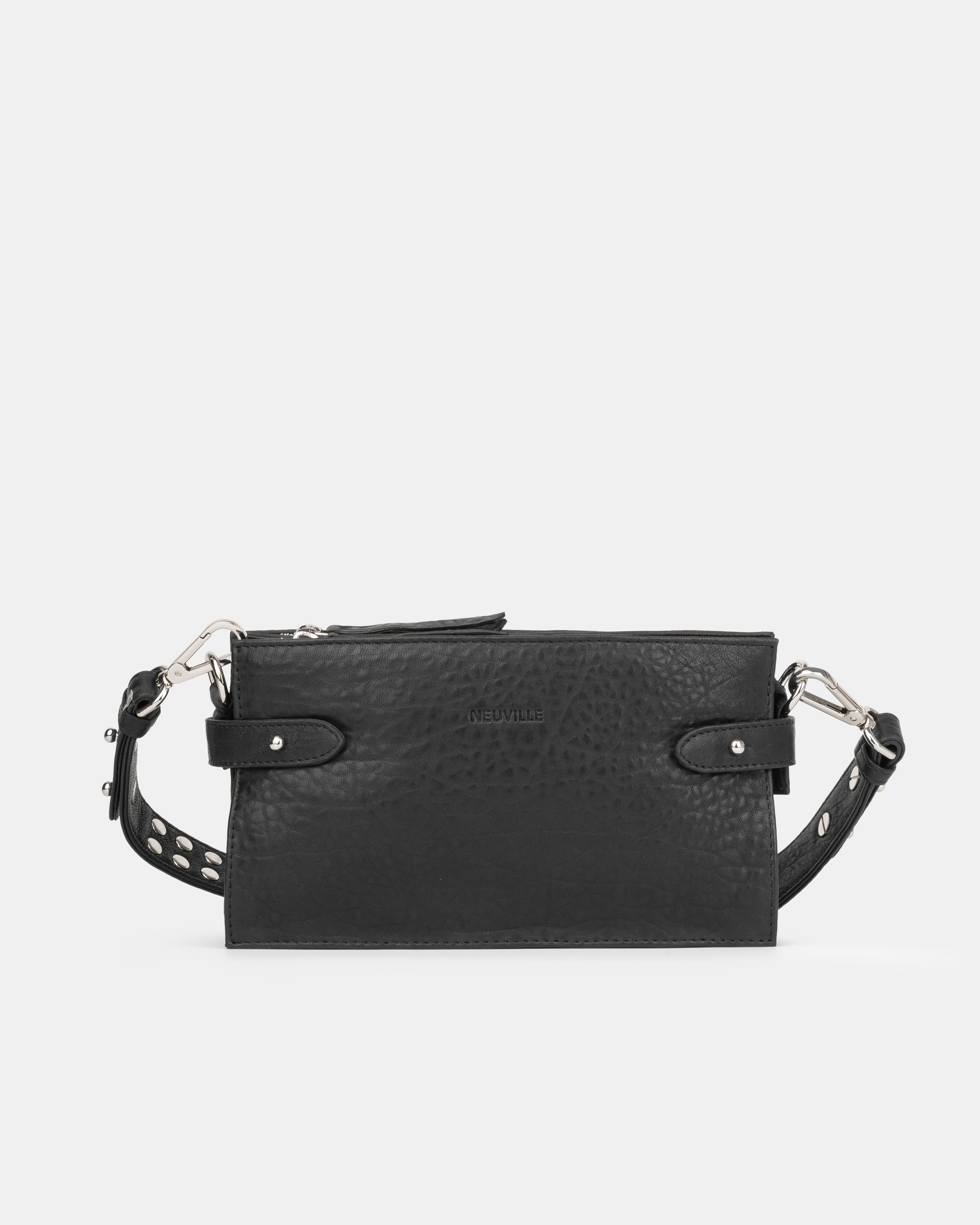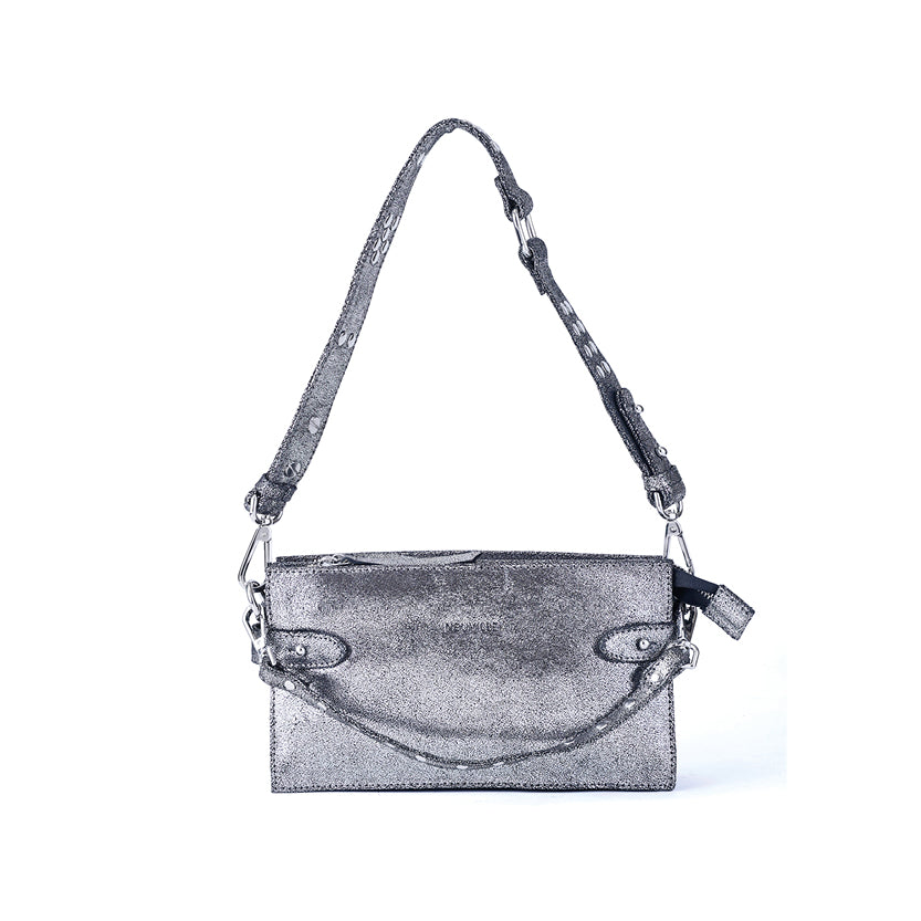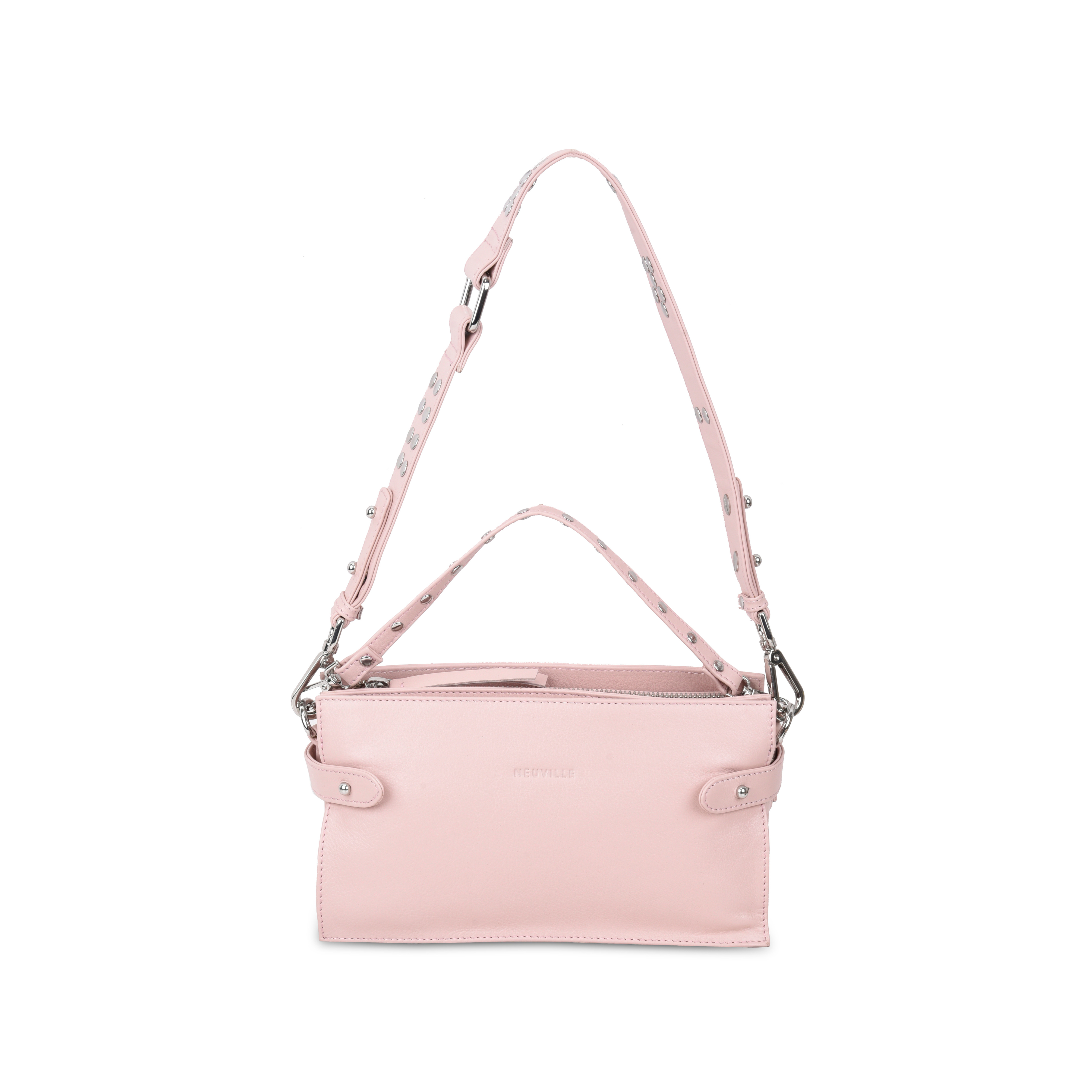 - Trois sangles interchangeables pour faciliter les transitions : une bandoulière en cuir avec des clous métalliques, une sangle transversale en cuir réglable et une petite sangle décorative avec des clous pour porter le sac à la main.
