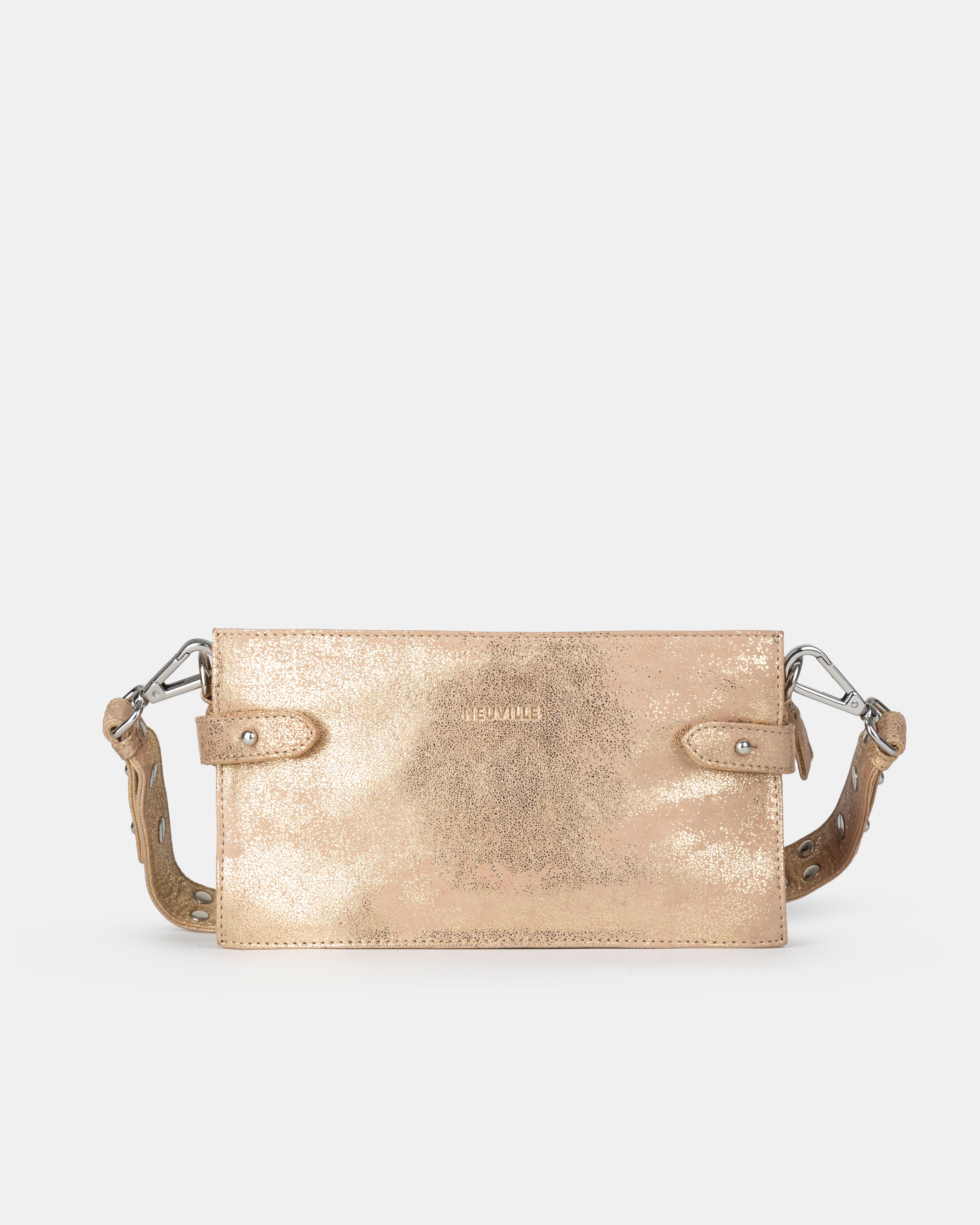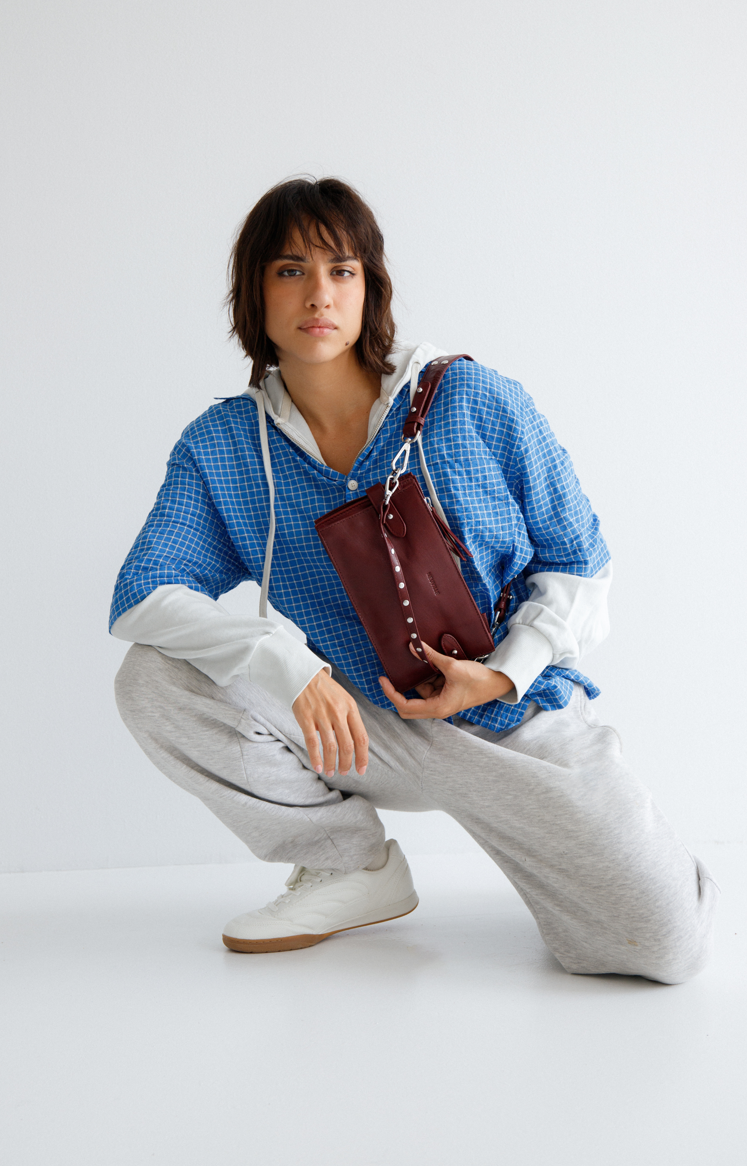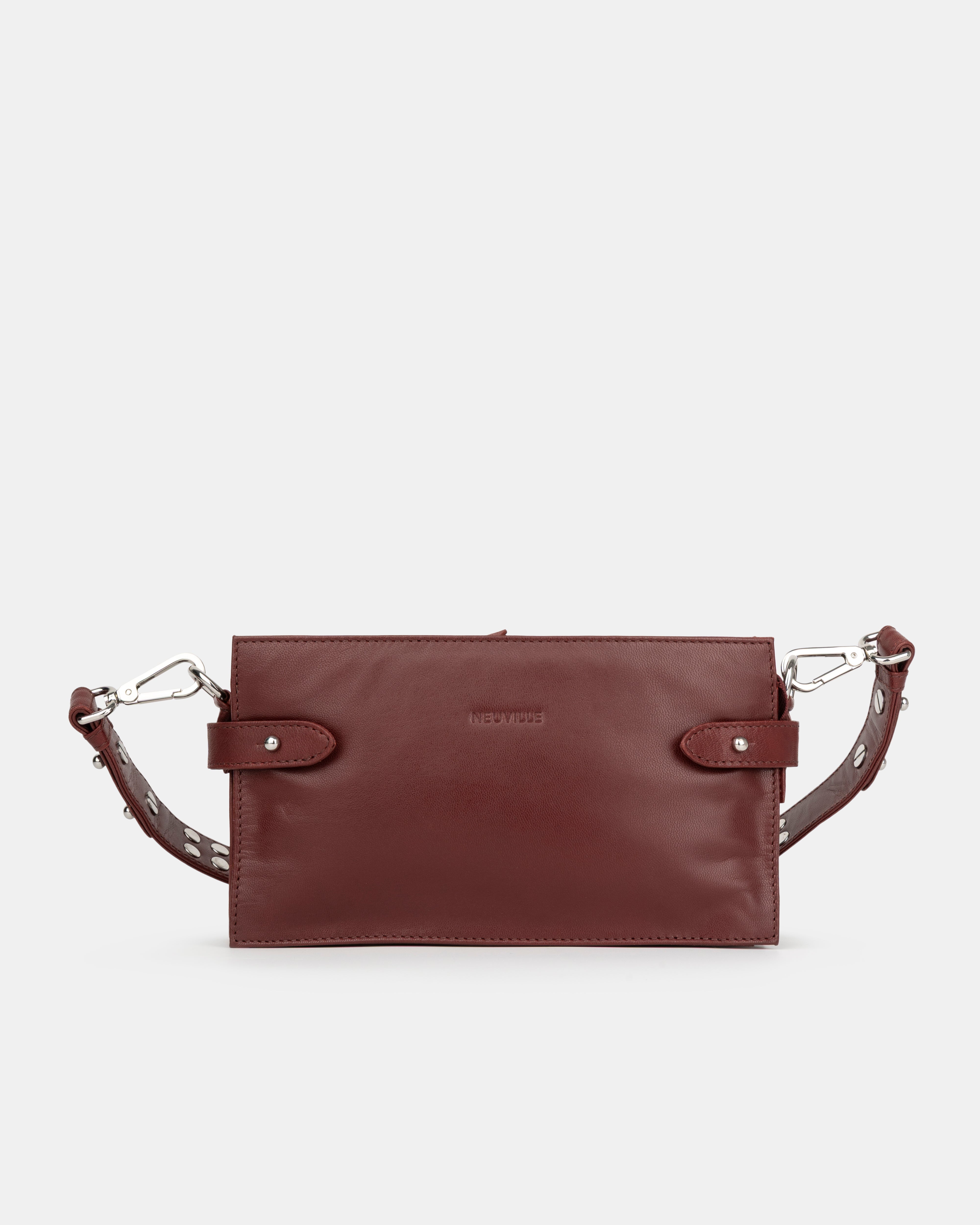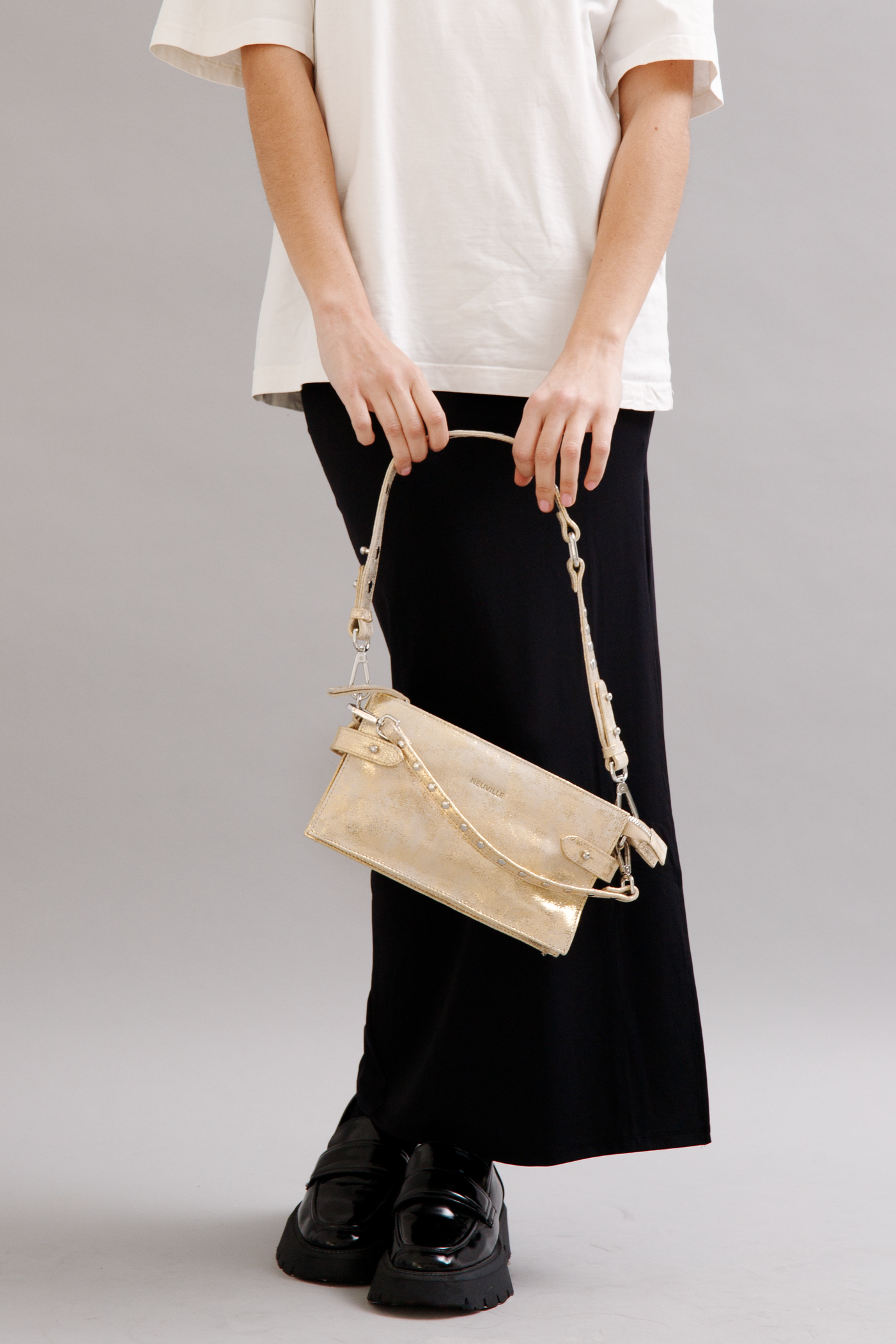- Trois sangles interchangeables pour faciliter les transitions : une bandoulière en cuir avec des clous métalliques, une sangle transversale en cuir réglable et une petite sangle décorative avec des clous pour porter le sac à la main.