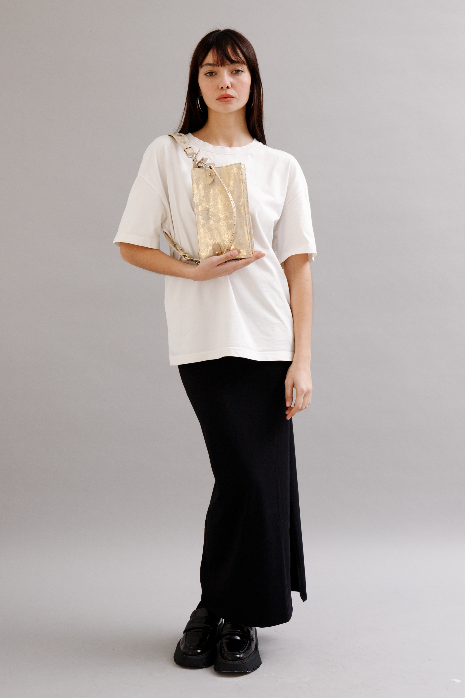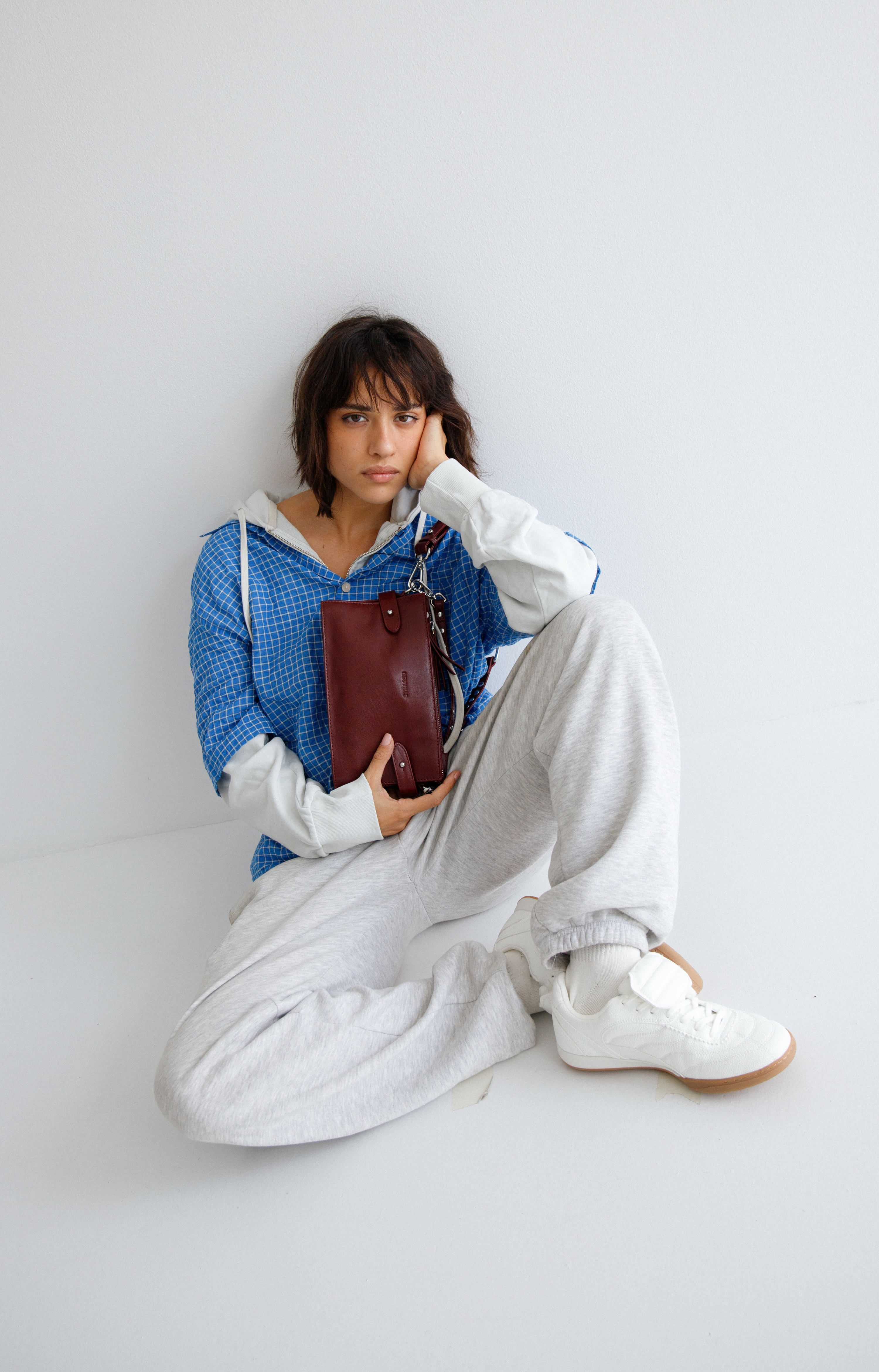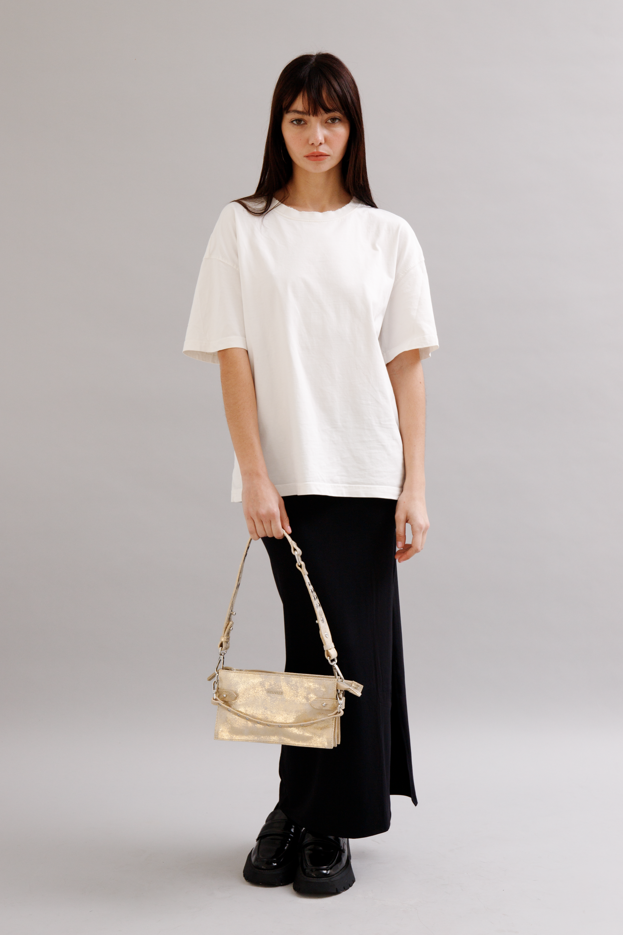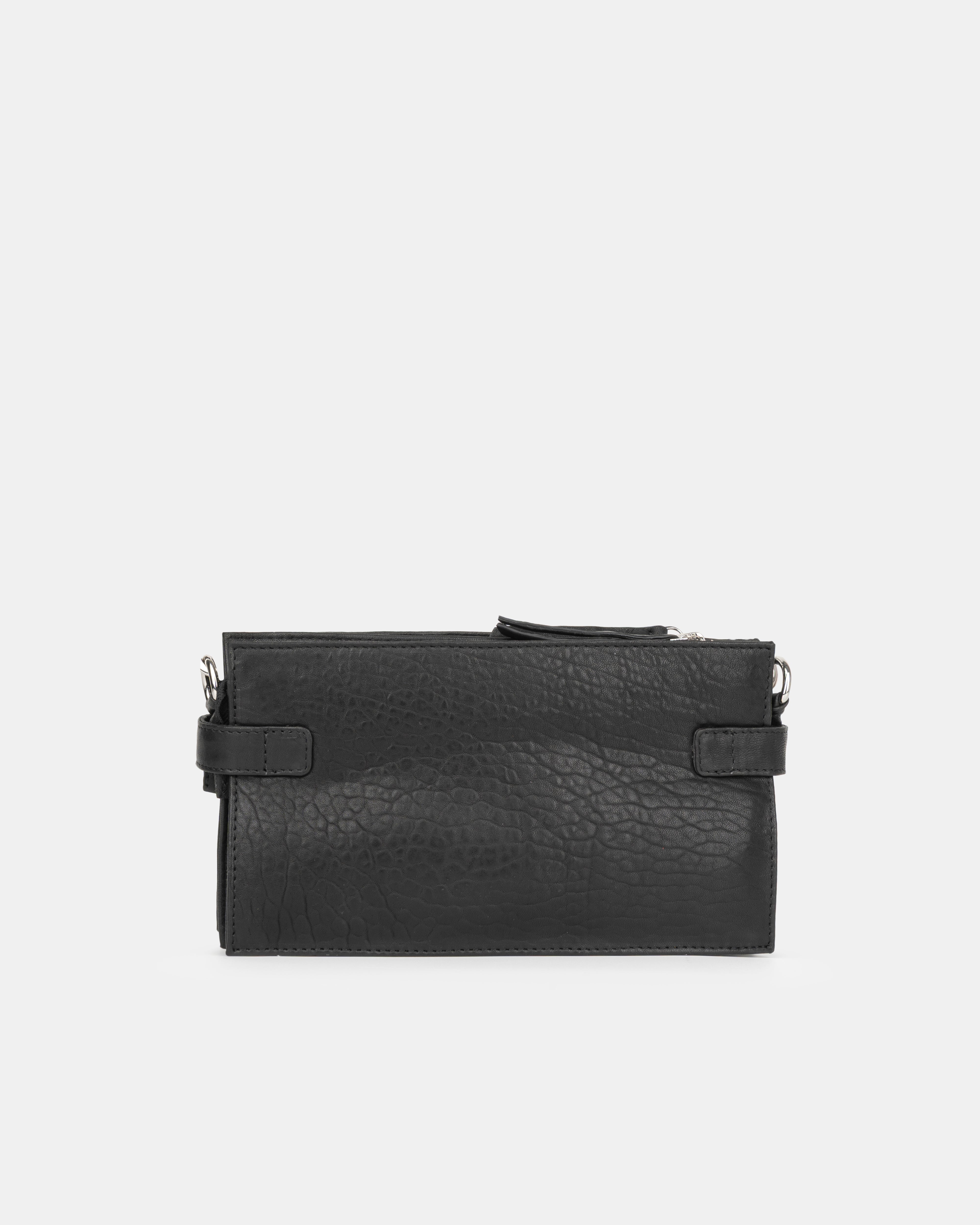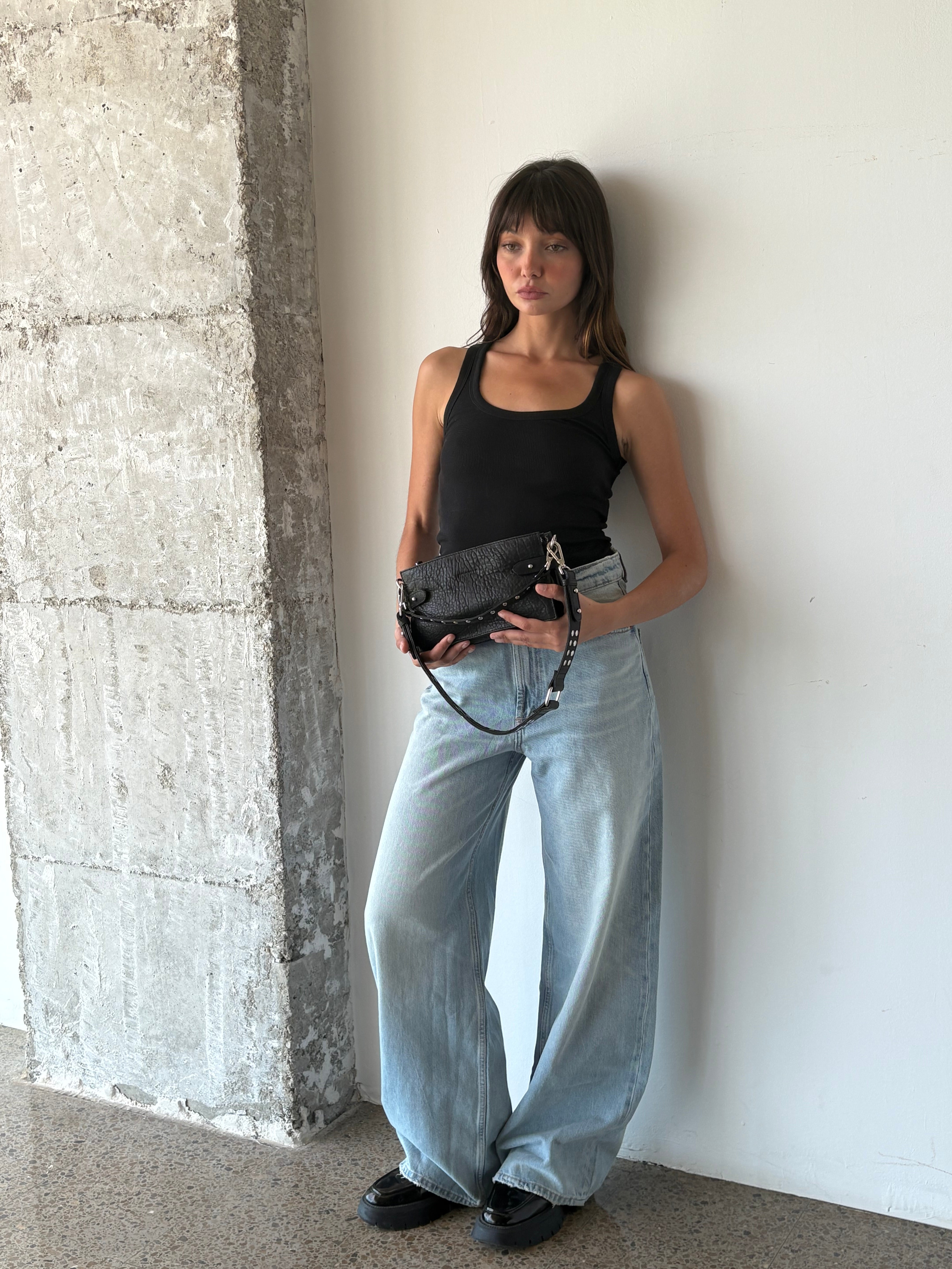 - Trois sangles interchangeables pour faciliter les transitions : une bandoulière en cuir avec des clous métalliques, une sangle transversale en cuir réglable et une petite sangle décorative avec des clous pour porter le sac à la main.
