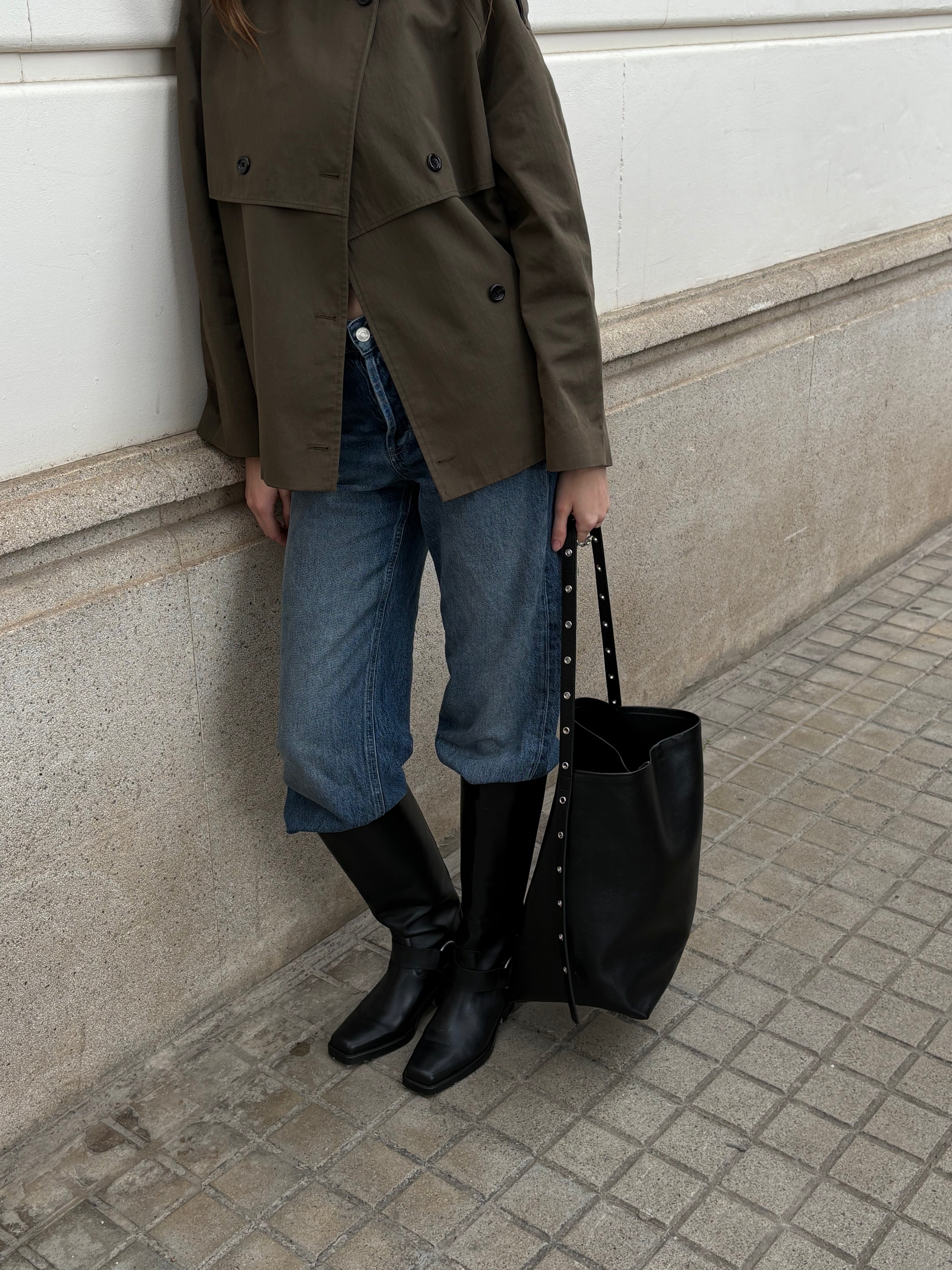 The clean silhouette is elevated by distinctive metal-studded shoulder straps, adding a subtle edge while maintaining a refined look. Designed with generous interior space, it easily carries your daily essentials—laptop, notebook, cosmetics, and more—making it the perfect companion for workdays, city outings, or weekend errands.