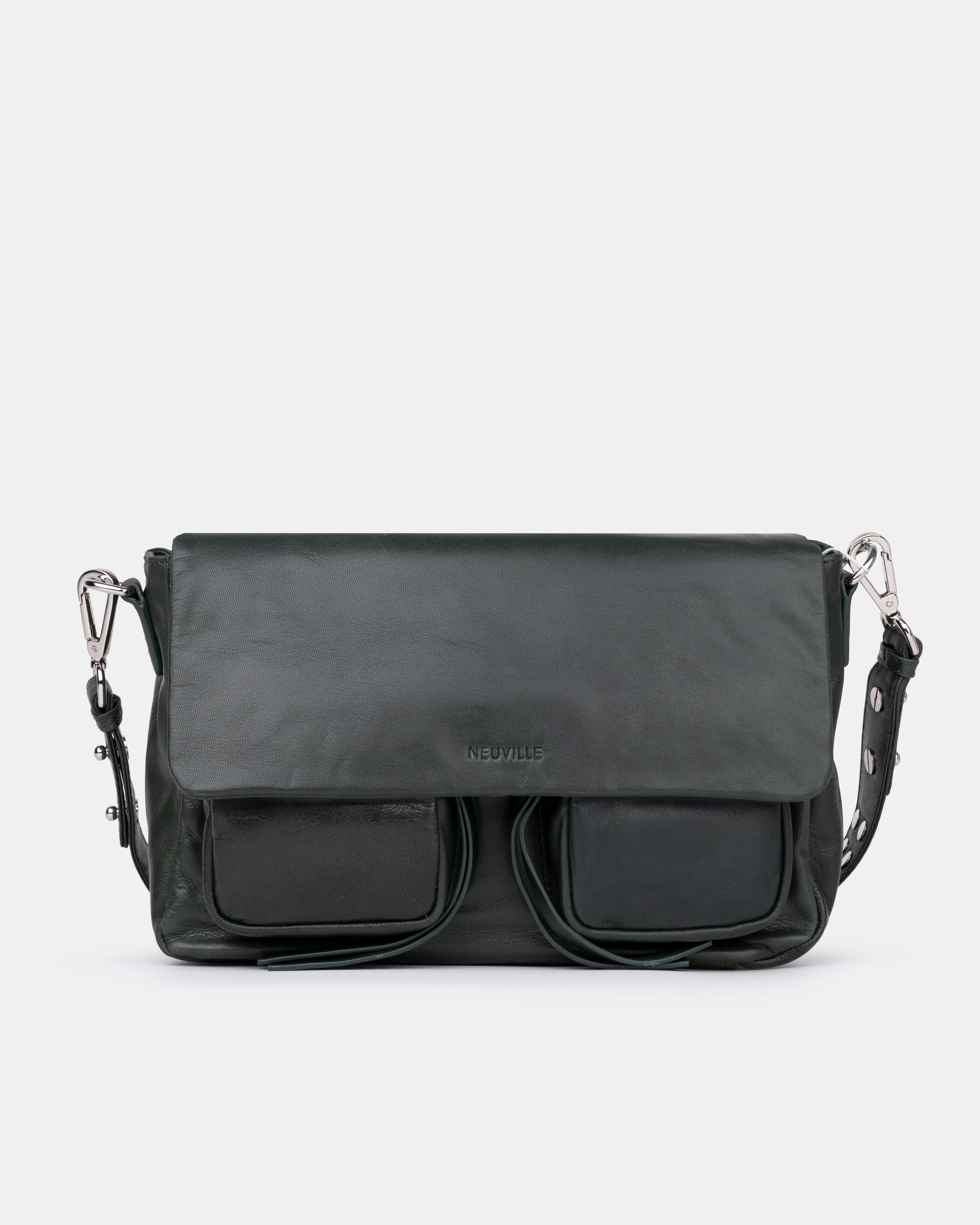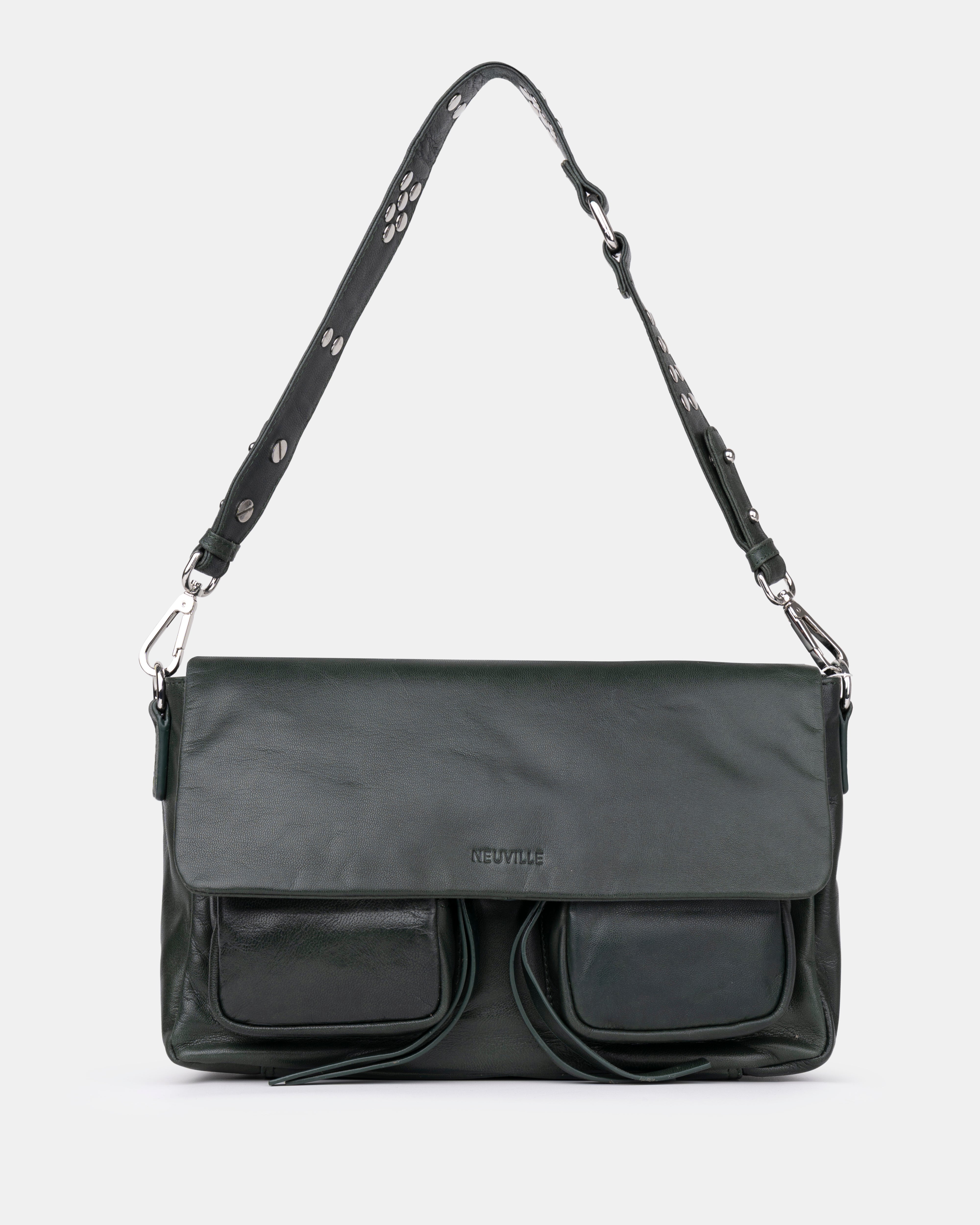 • Three interchangeable straps for easy outfit transitions: a leather shoulder strap with metal studs, an adjustable leather crossbody strap and a top handle decorative metal chain