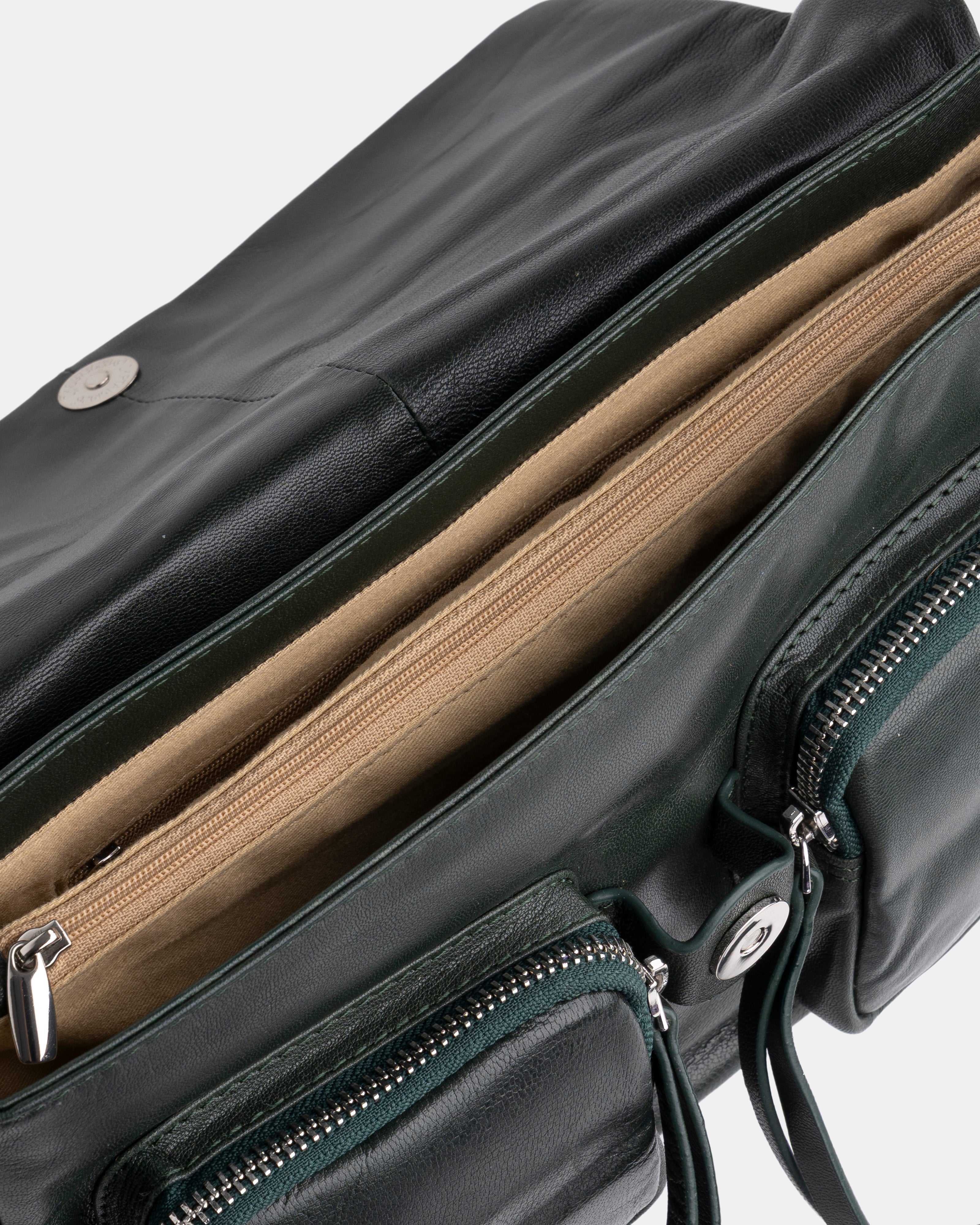 • Two interior compartments, divided by a large central zippered pocket.