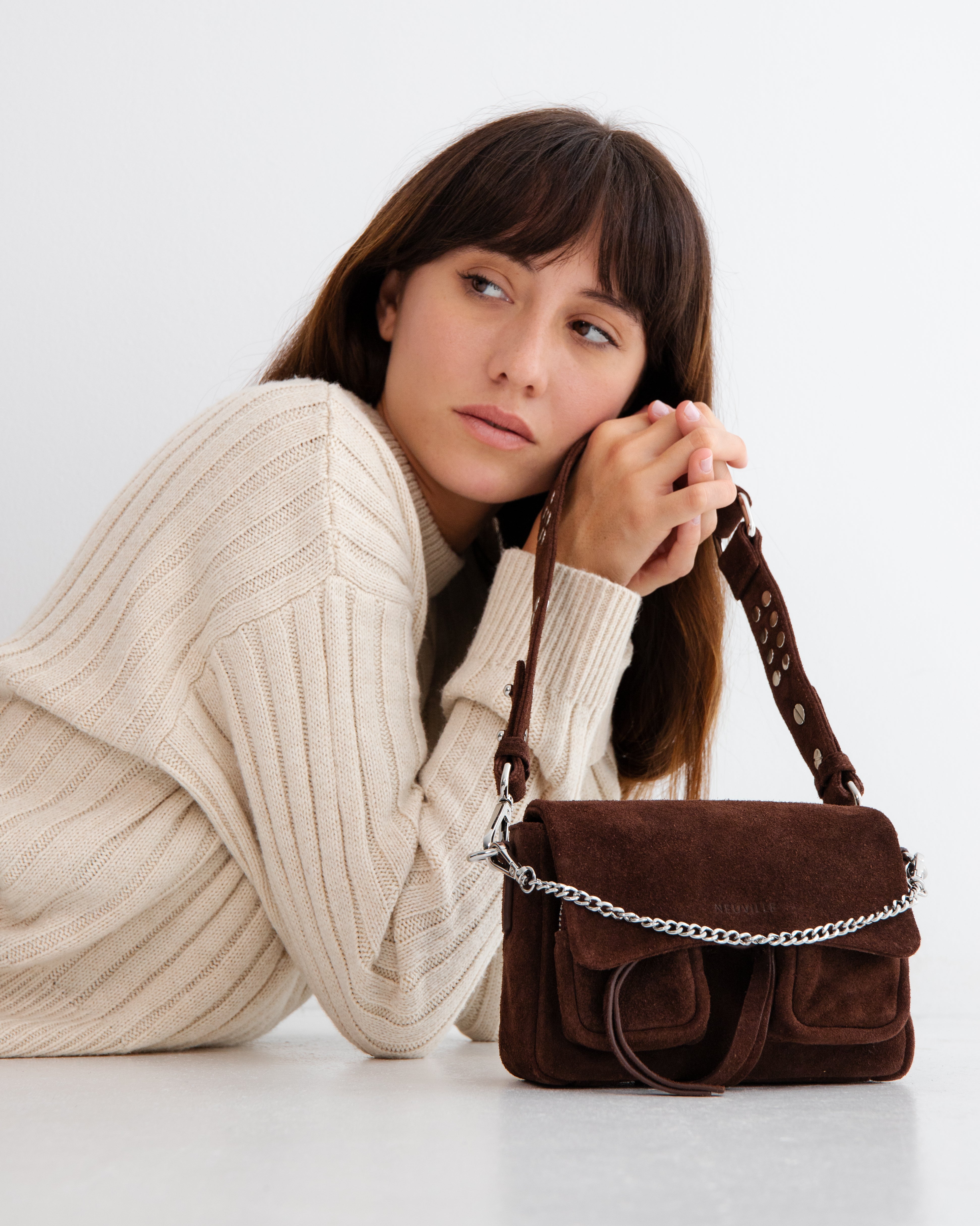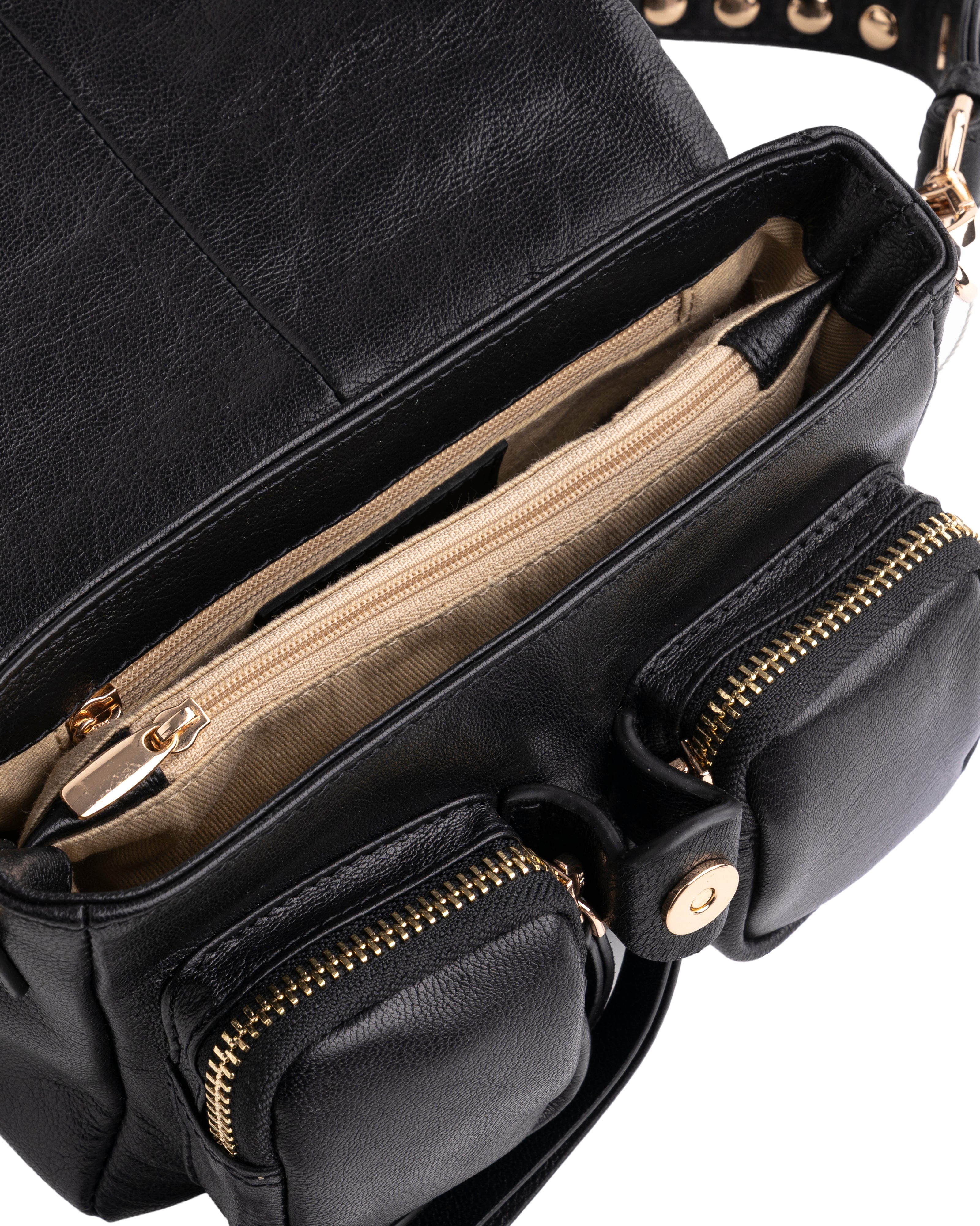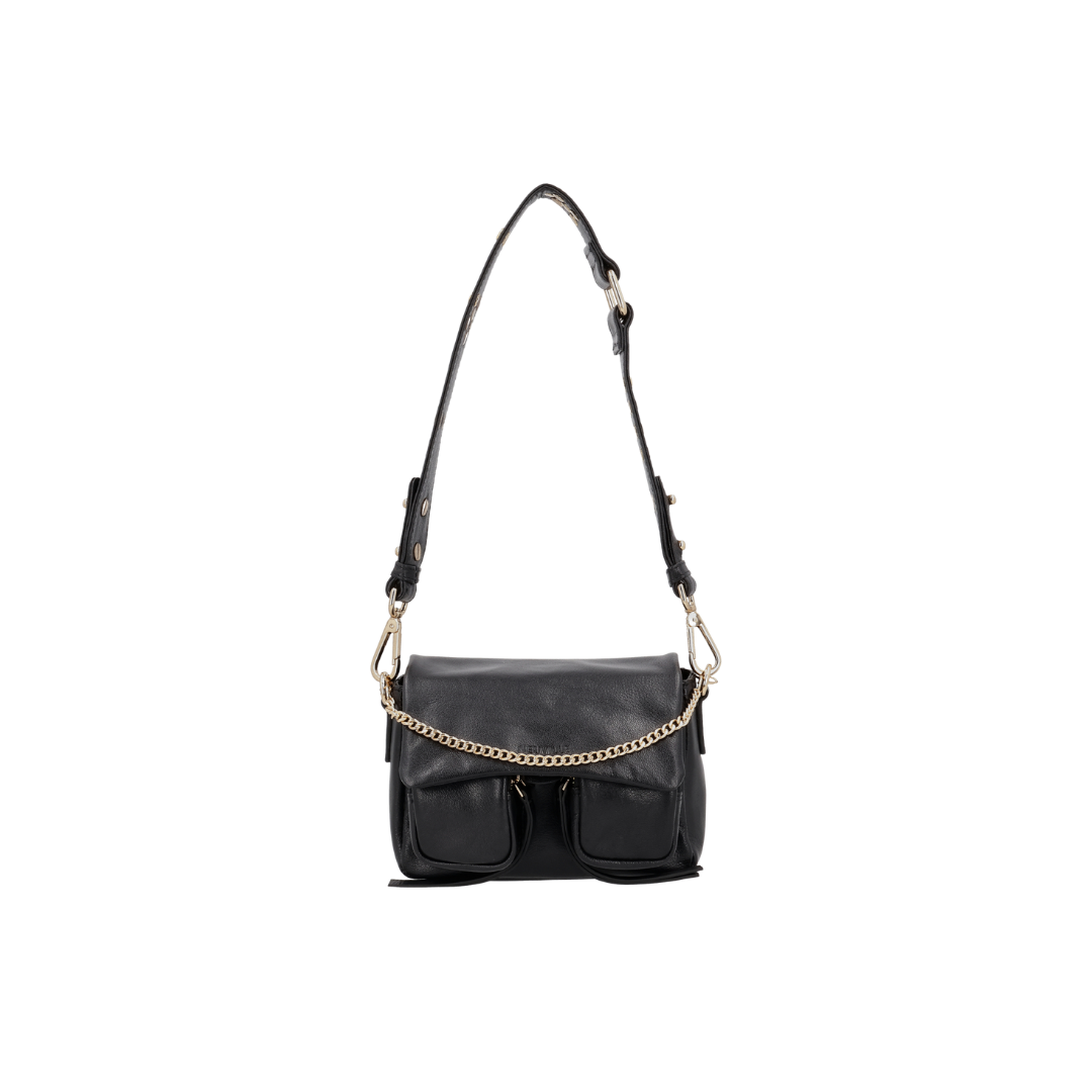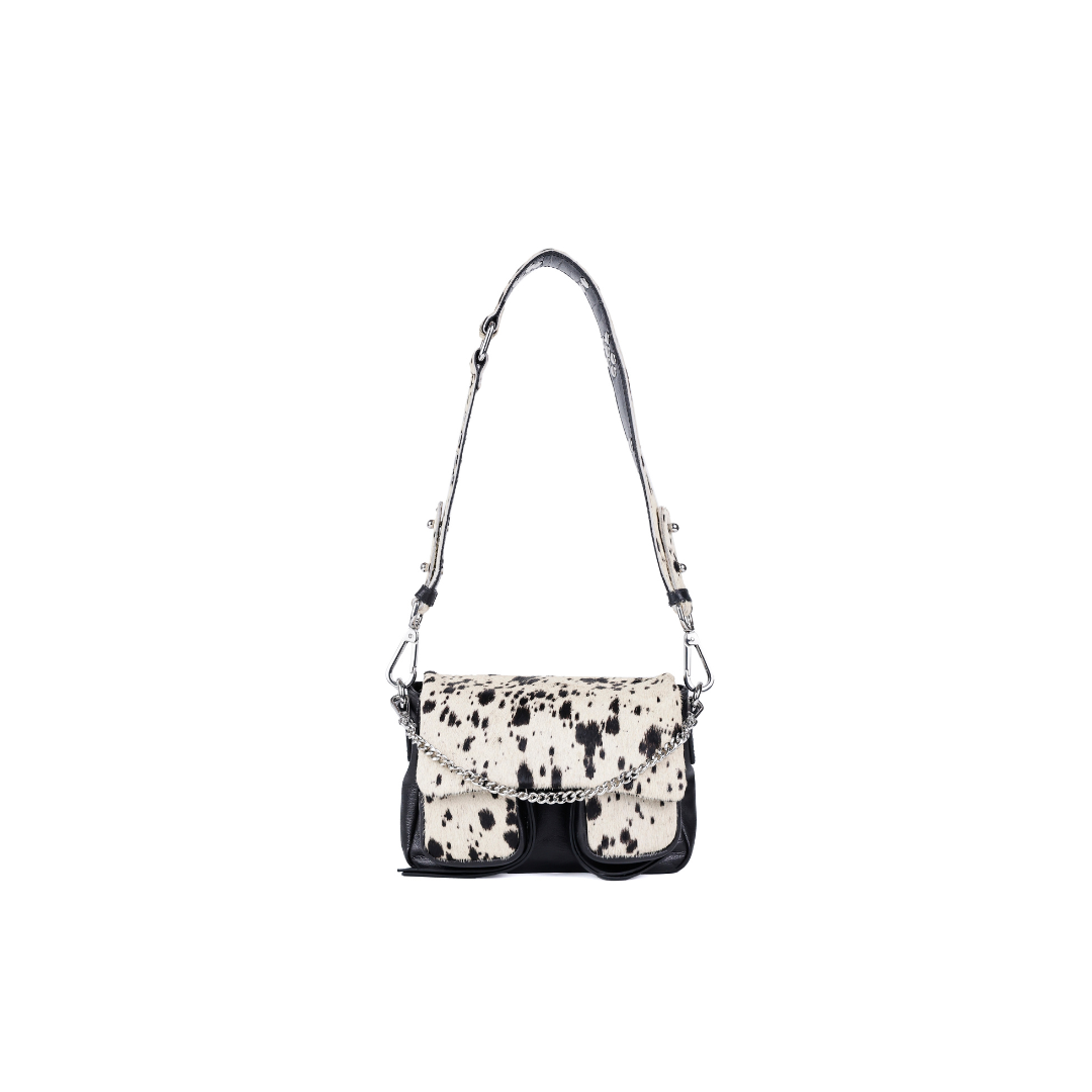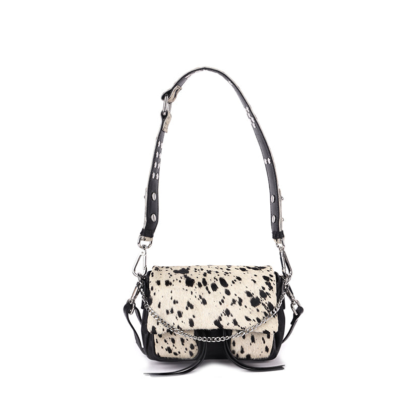 - Three interchangeable straps for easy transitions : a leather shoulder strap with metal studs, and adjustable leather crossbody strap and a decorative metal chain