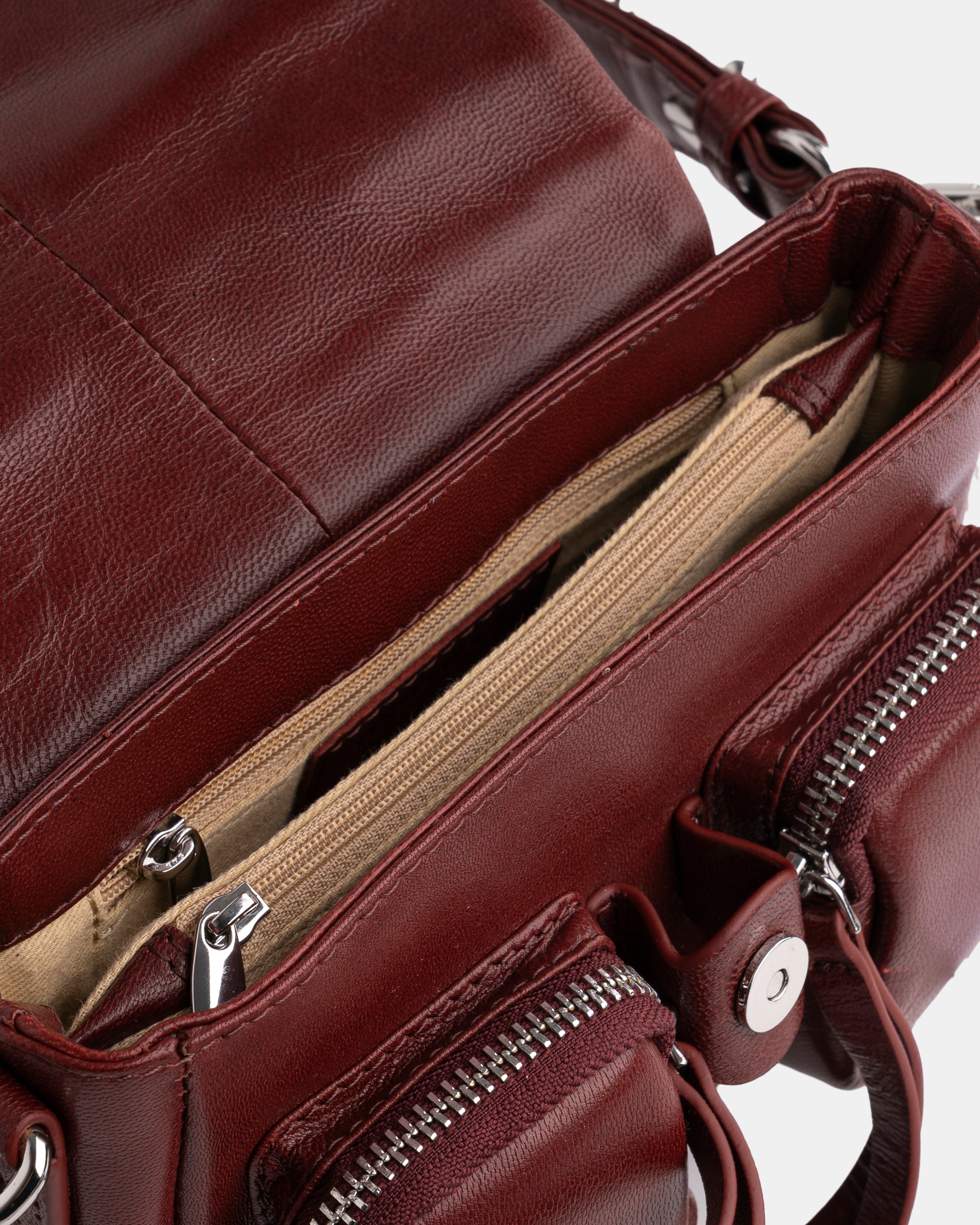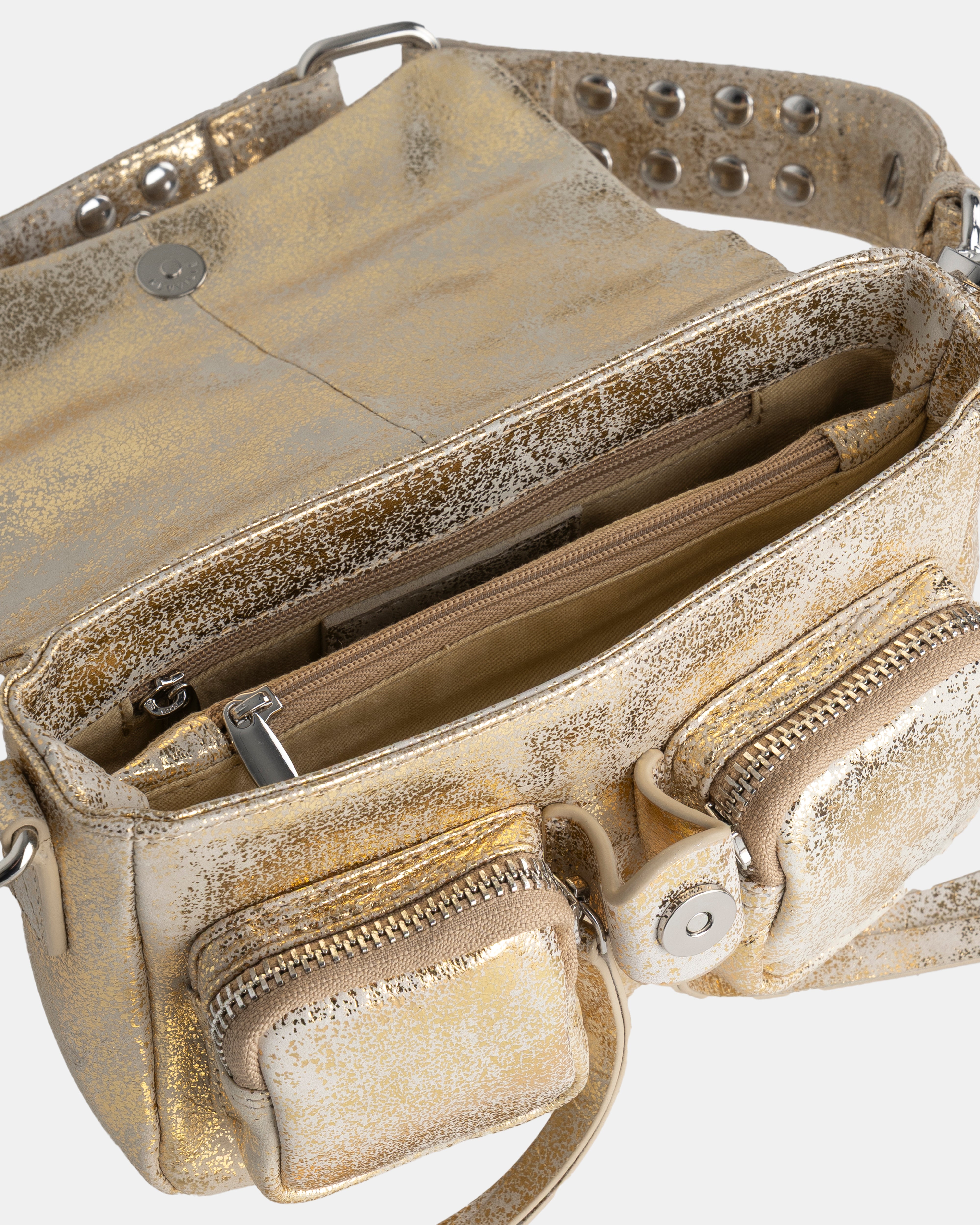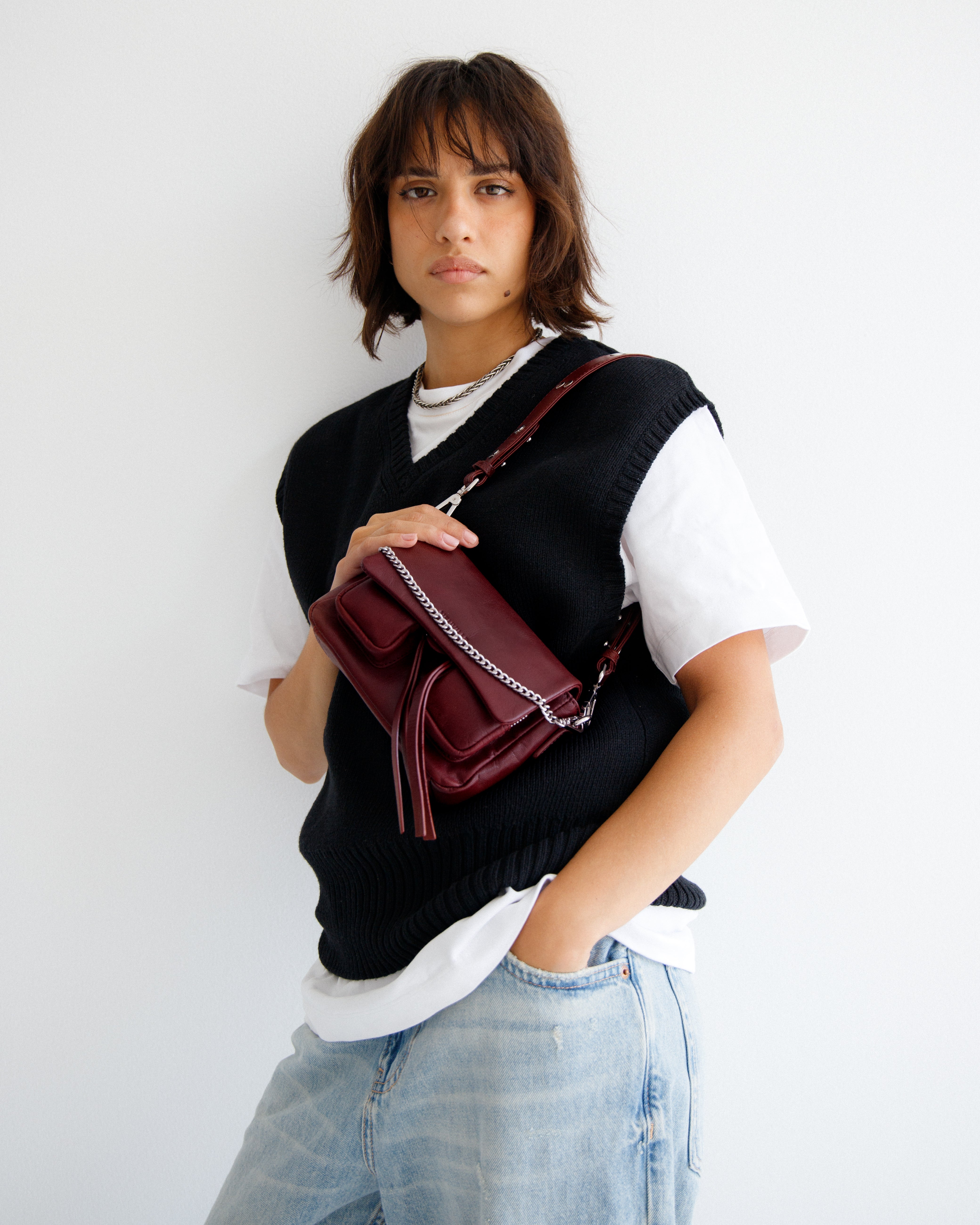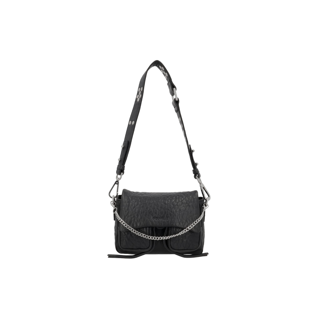 - Three interchangeable straps for easy transitions : a leather shoulder strap with metal studs, and adjustable leather crossbody strap and a decorative metal chain